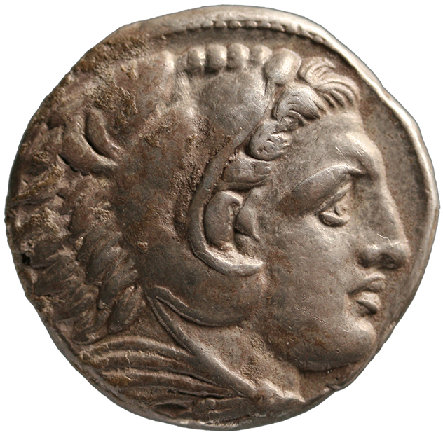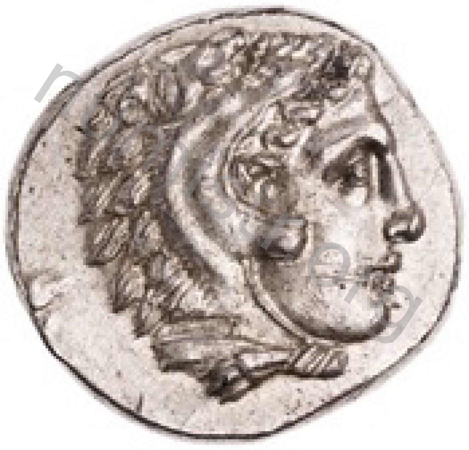 Head of beardless Heracles right wearing lion skin headdress -[en]