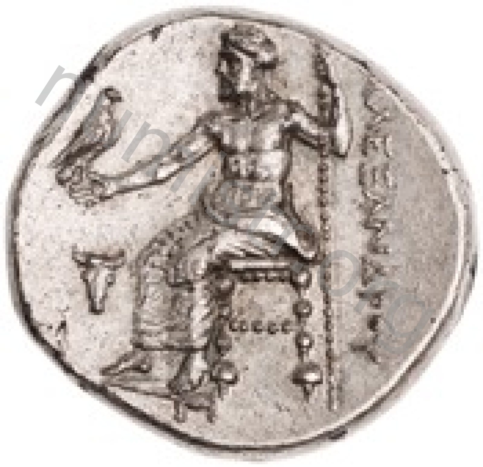 Zeus seated on stool-throne left eagle on outstretched right hand sceptre in left hand -[en]