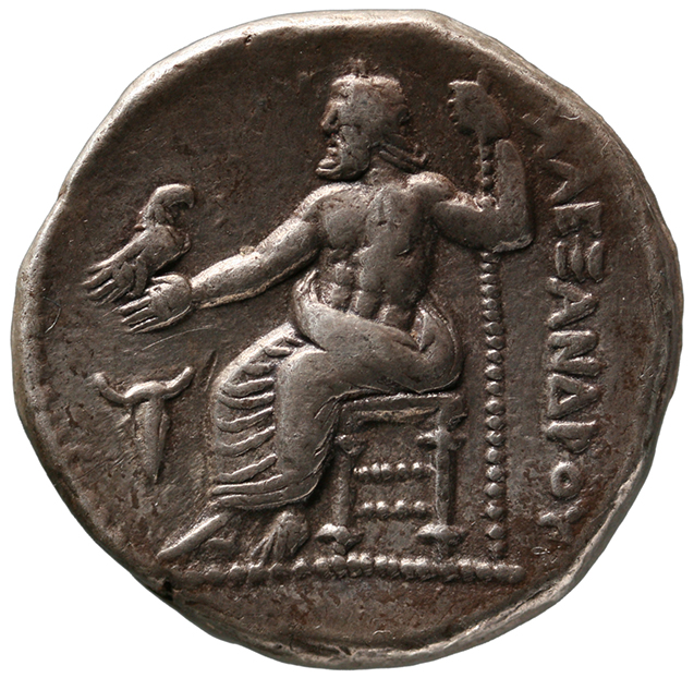 Zeus tabure-tahtta oturuyor sol elinde kartal sağ elinde asa var.