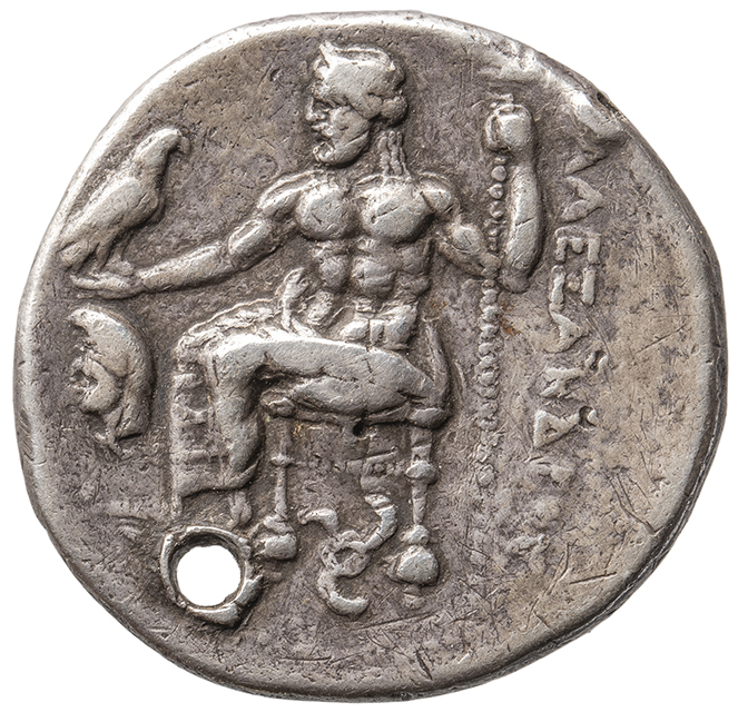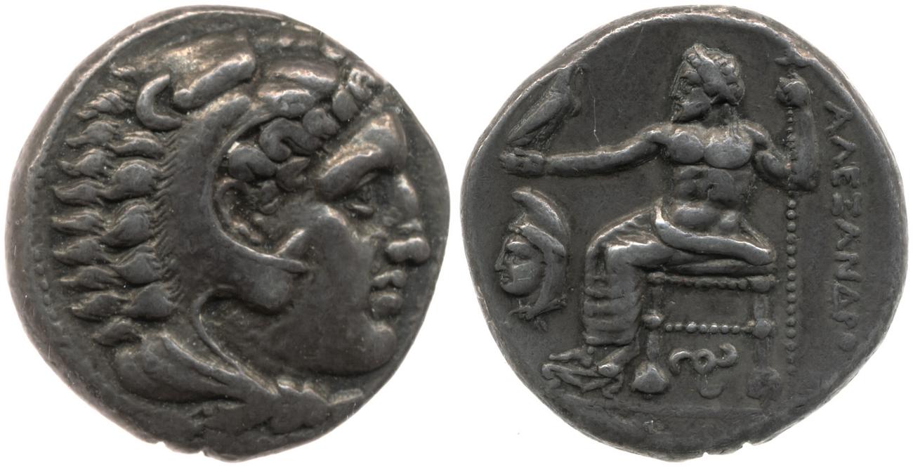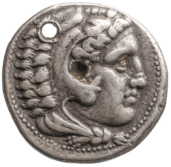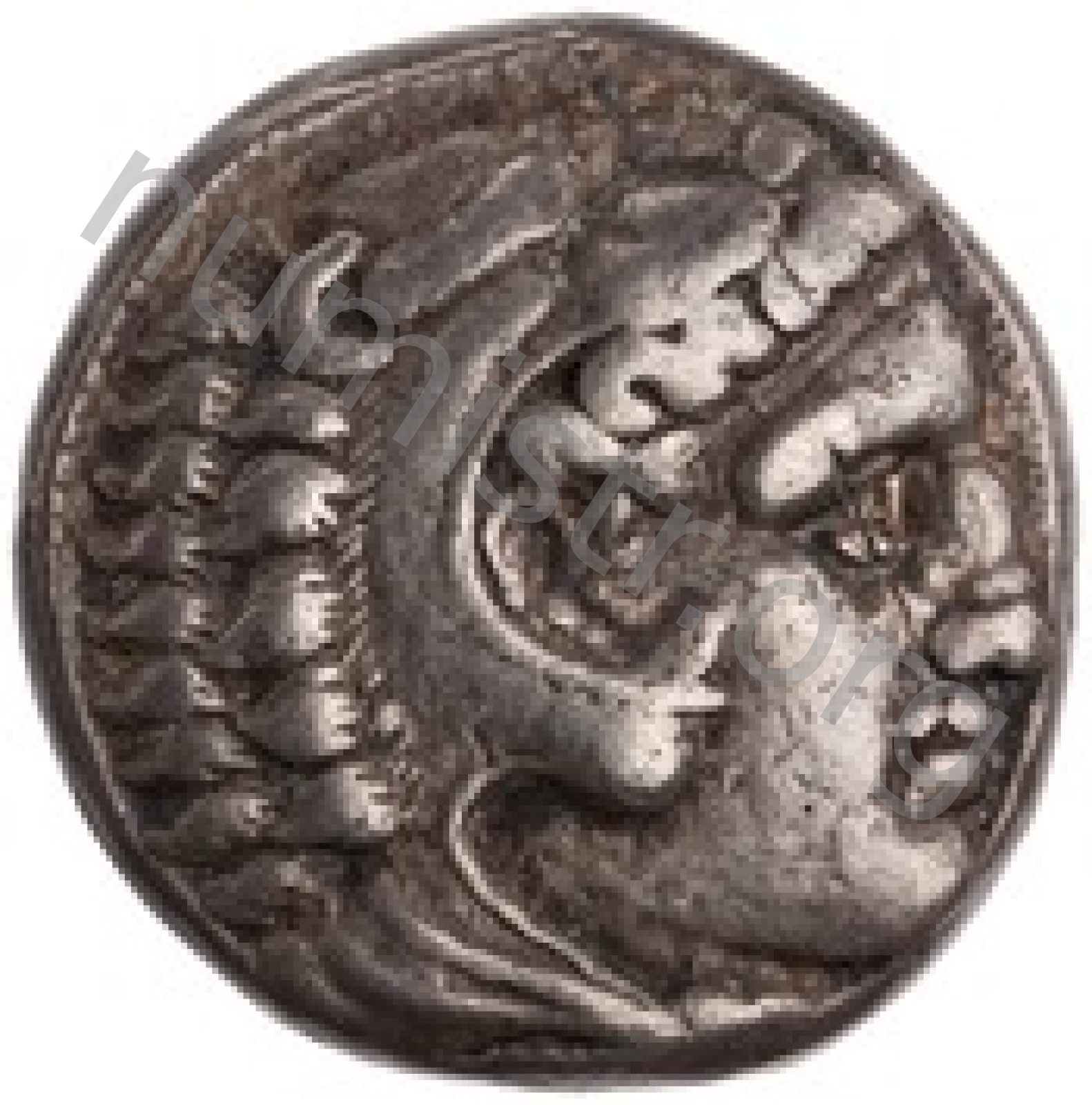 Head of beardless Heracles right wearing lion skin headdress -[en]