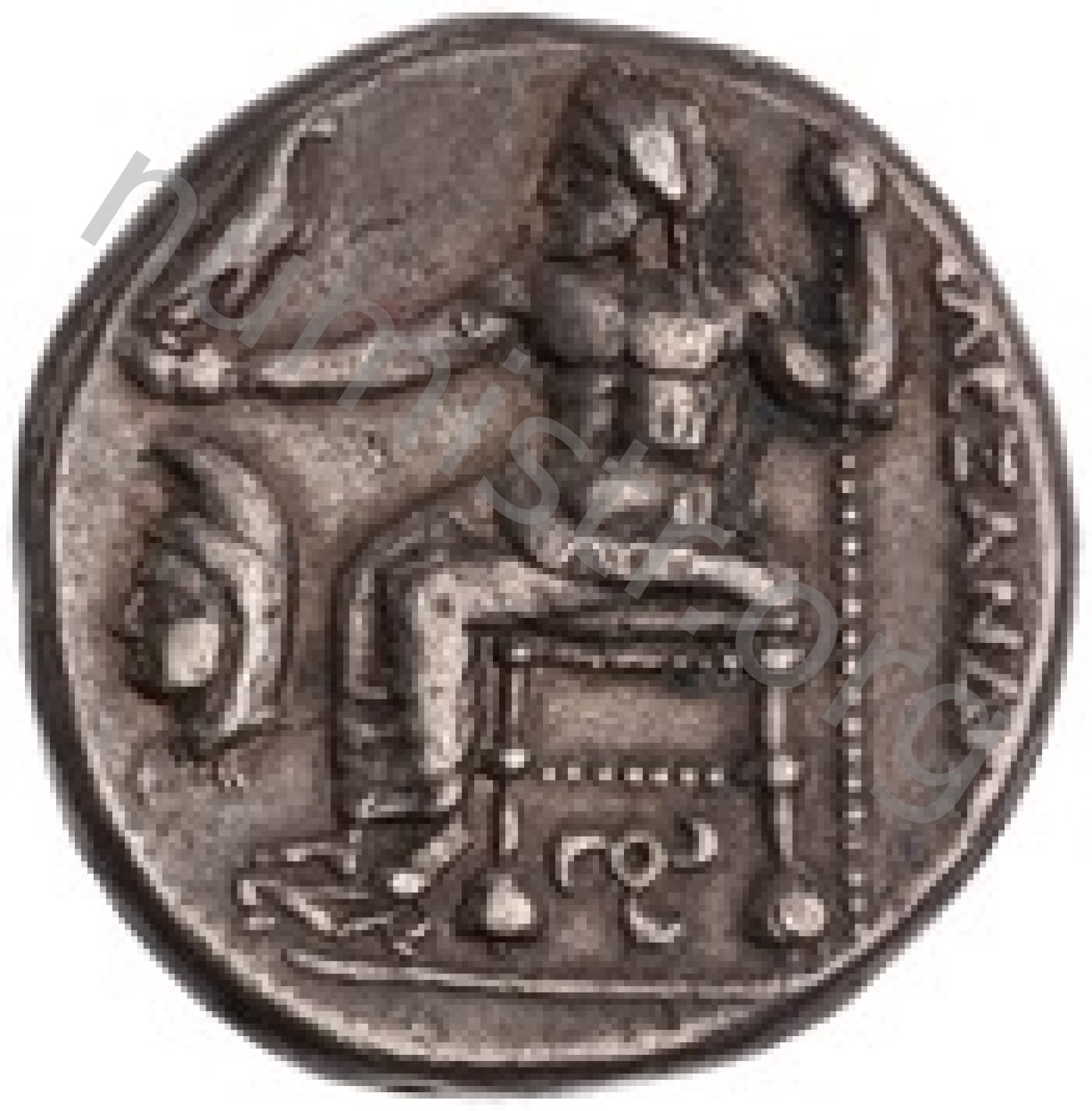 Zeus seated on stool-throne left eagle on outstretched right hand sceptre in left hand -[en]