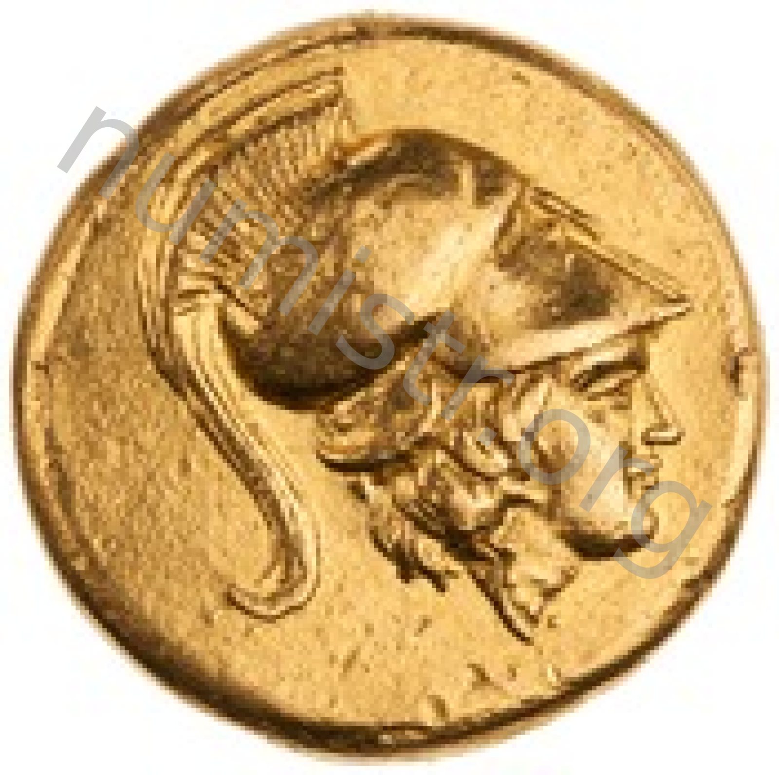 Head of Athena right wearing Corinthian helmet with crest -[en]