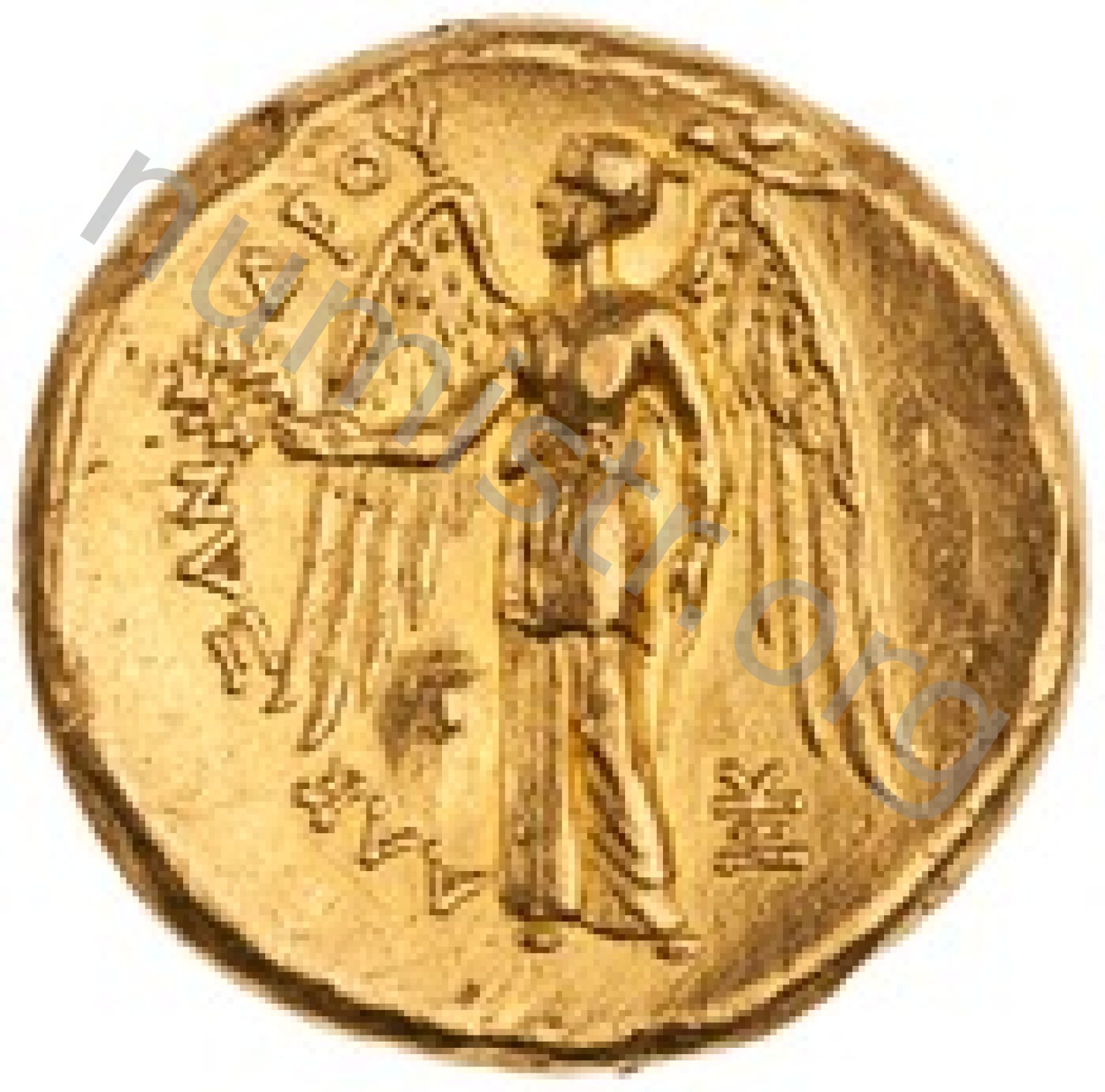 Nike standing left holding wreath in right hand and stylis in her left hand -[en]