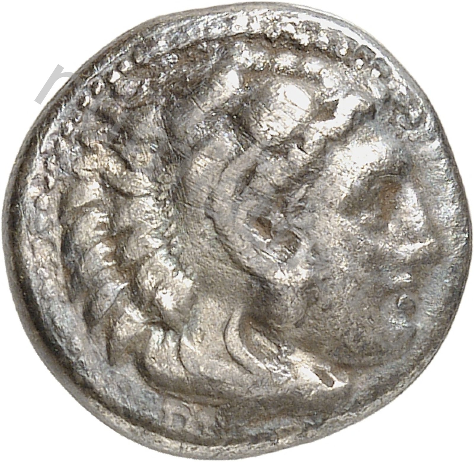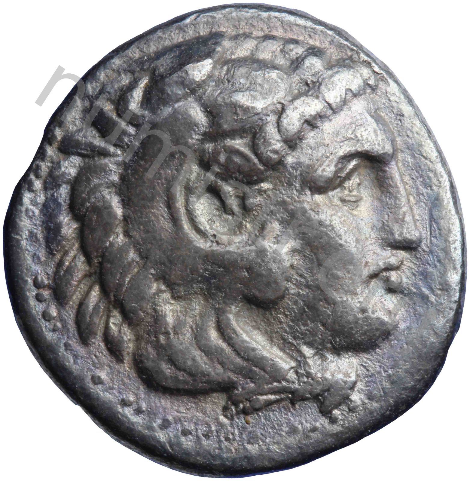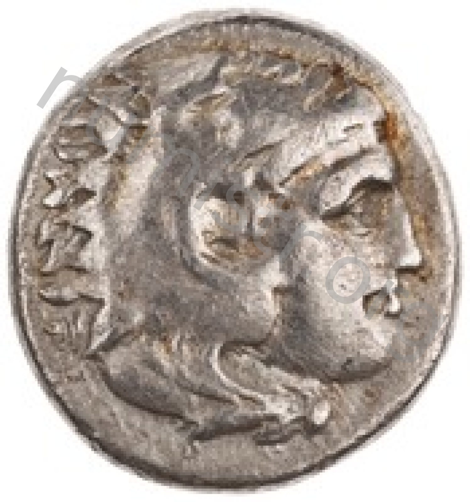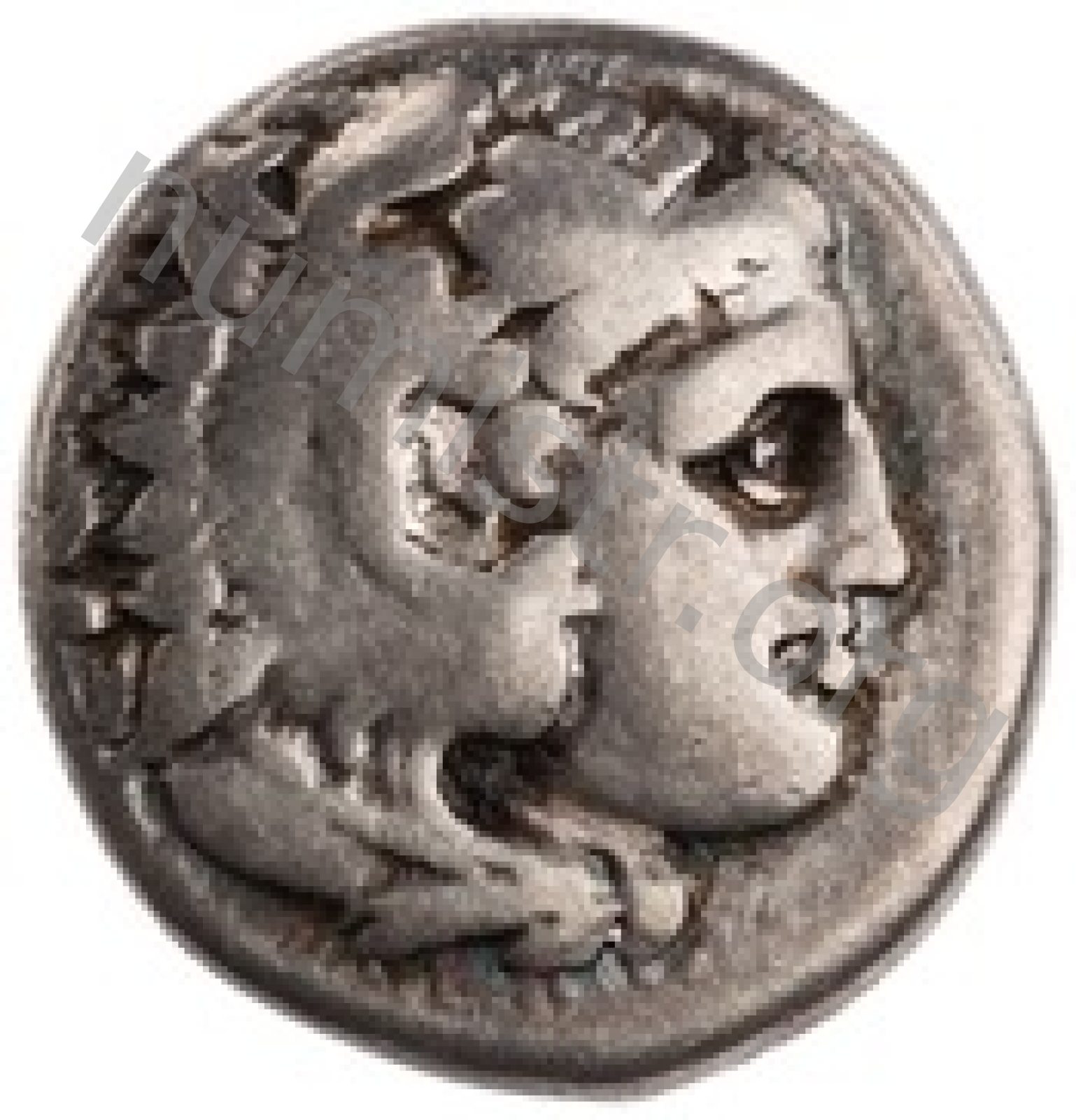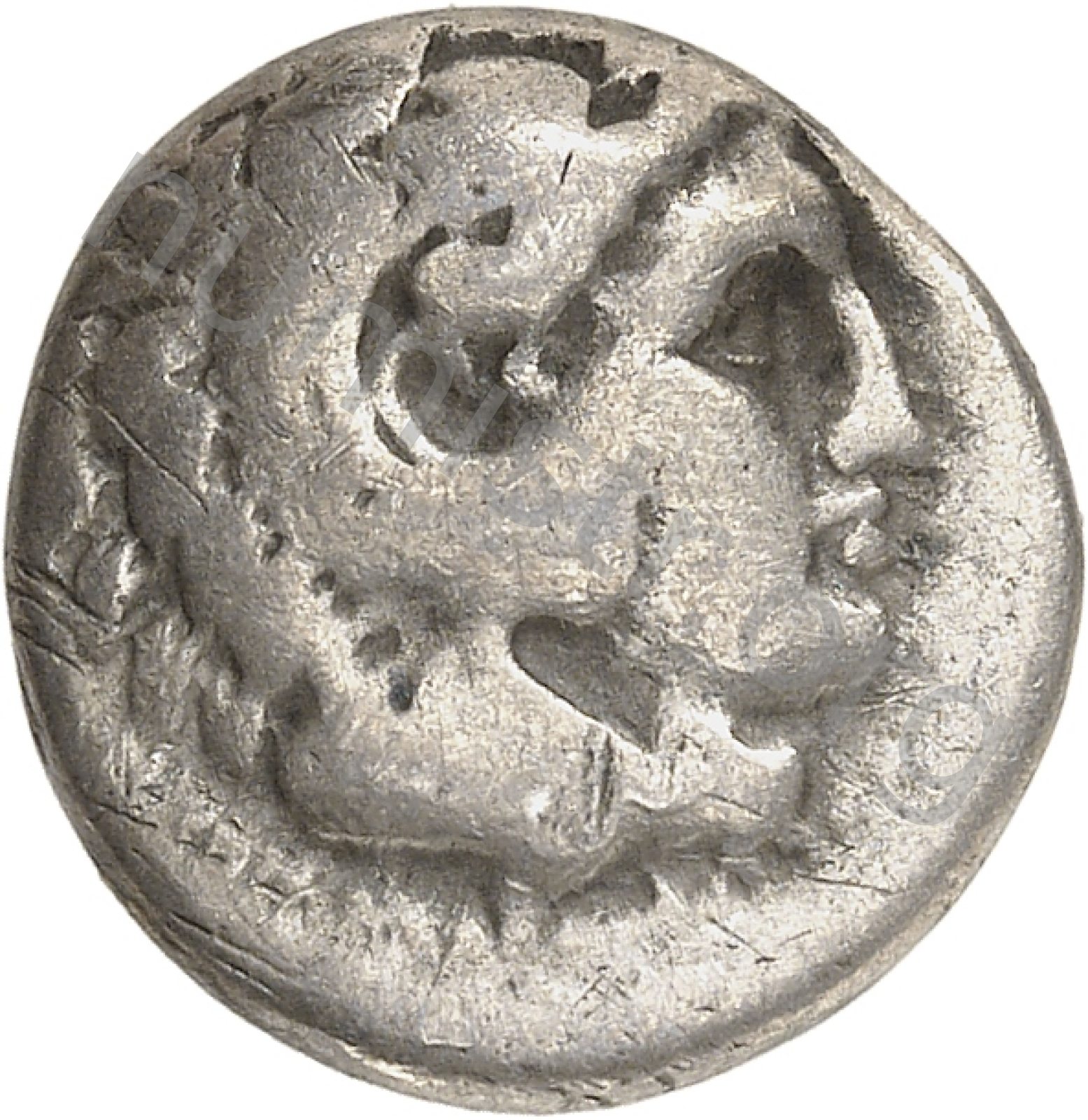 Head of beardless Heracles right wearing lion skin headdress -[en]