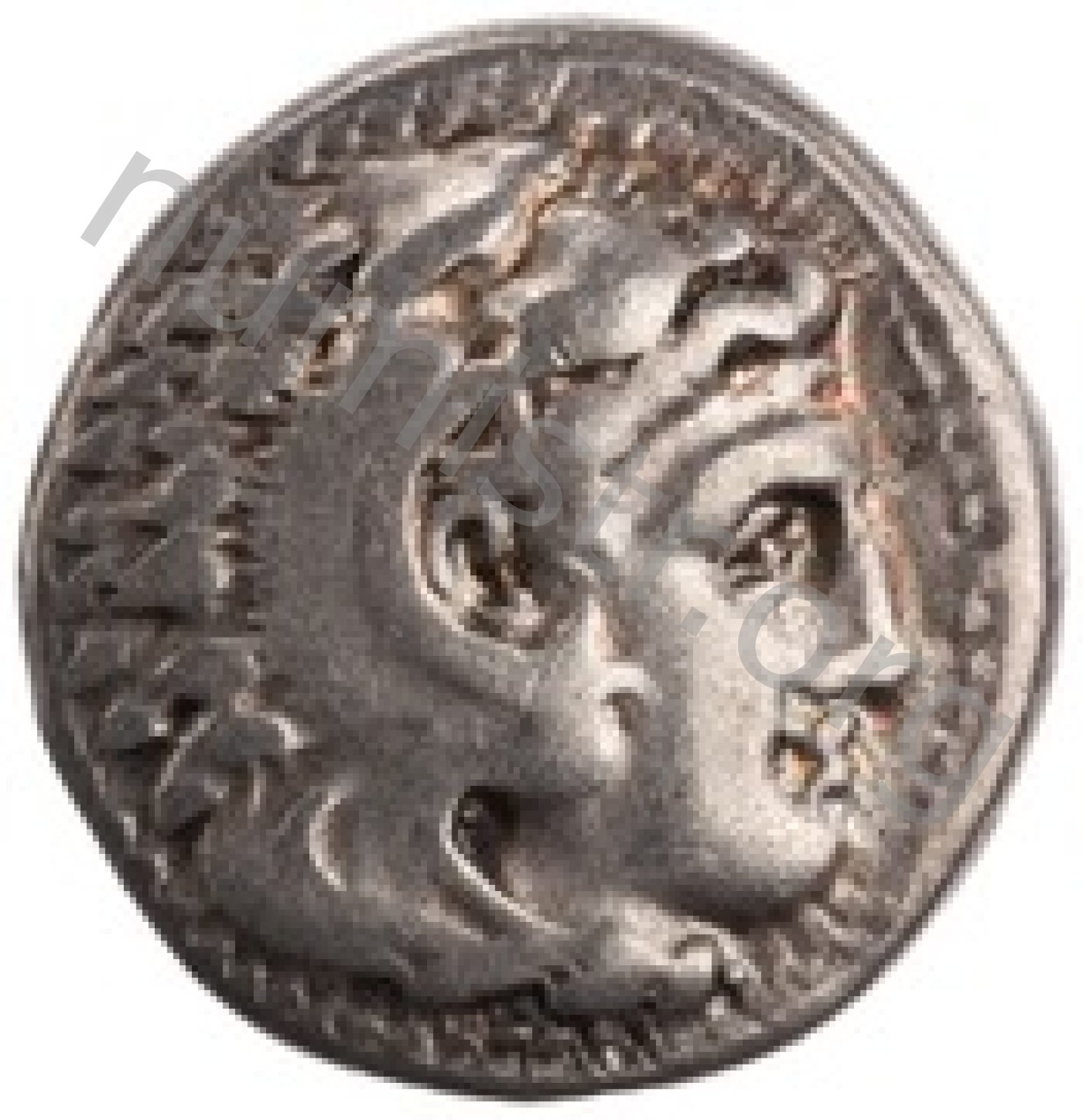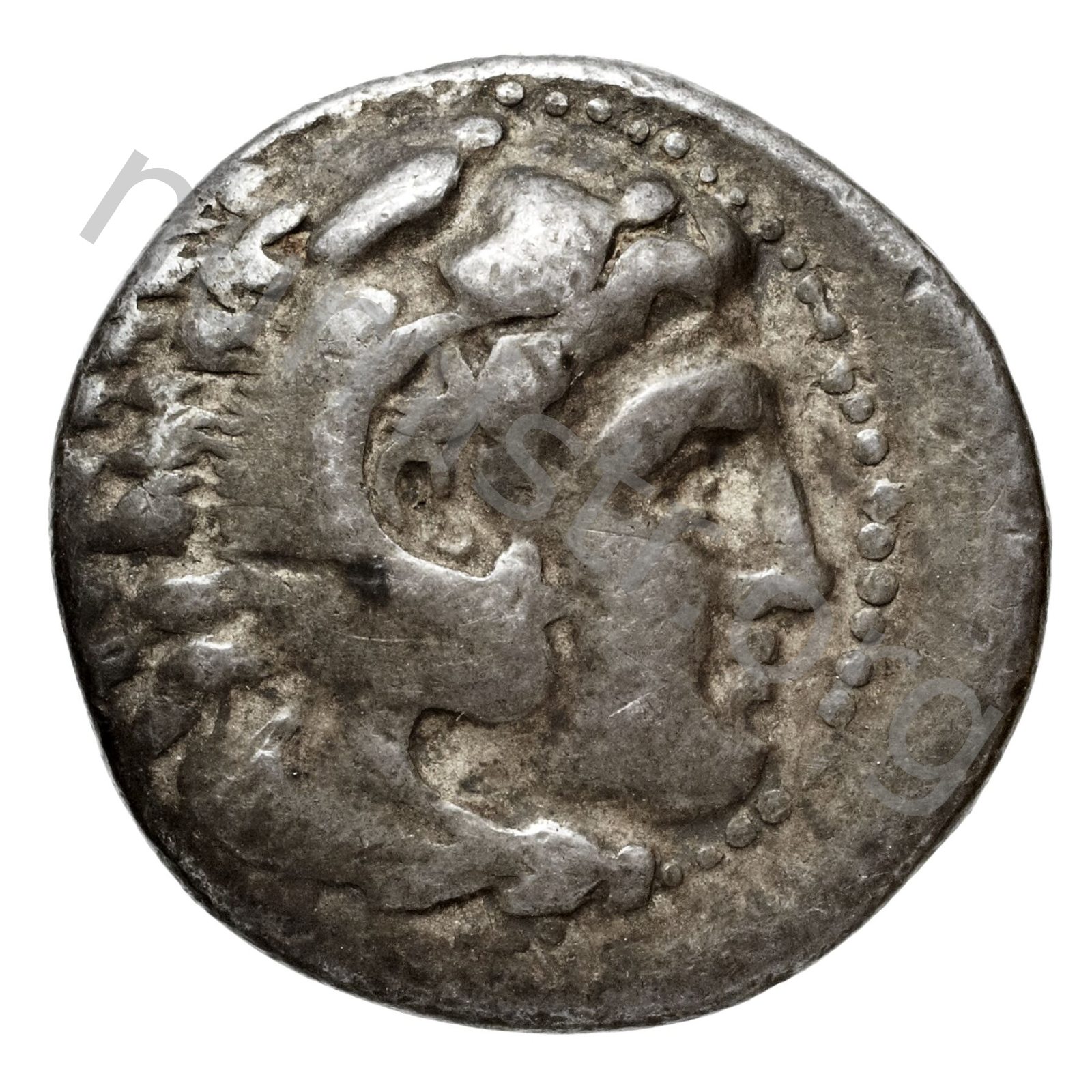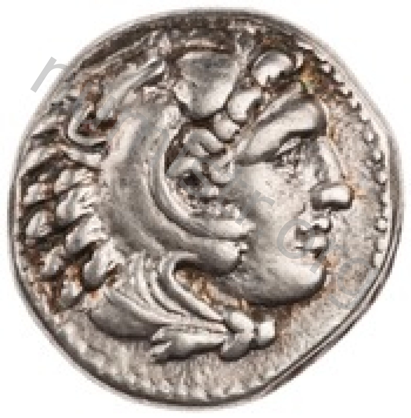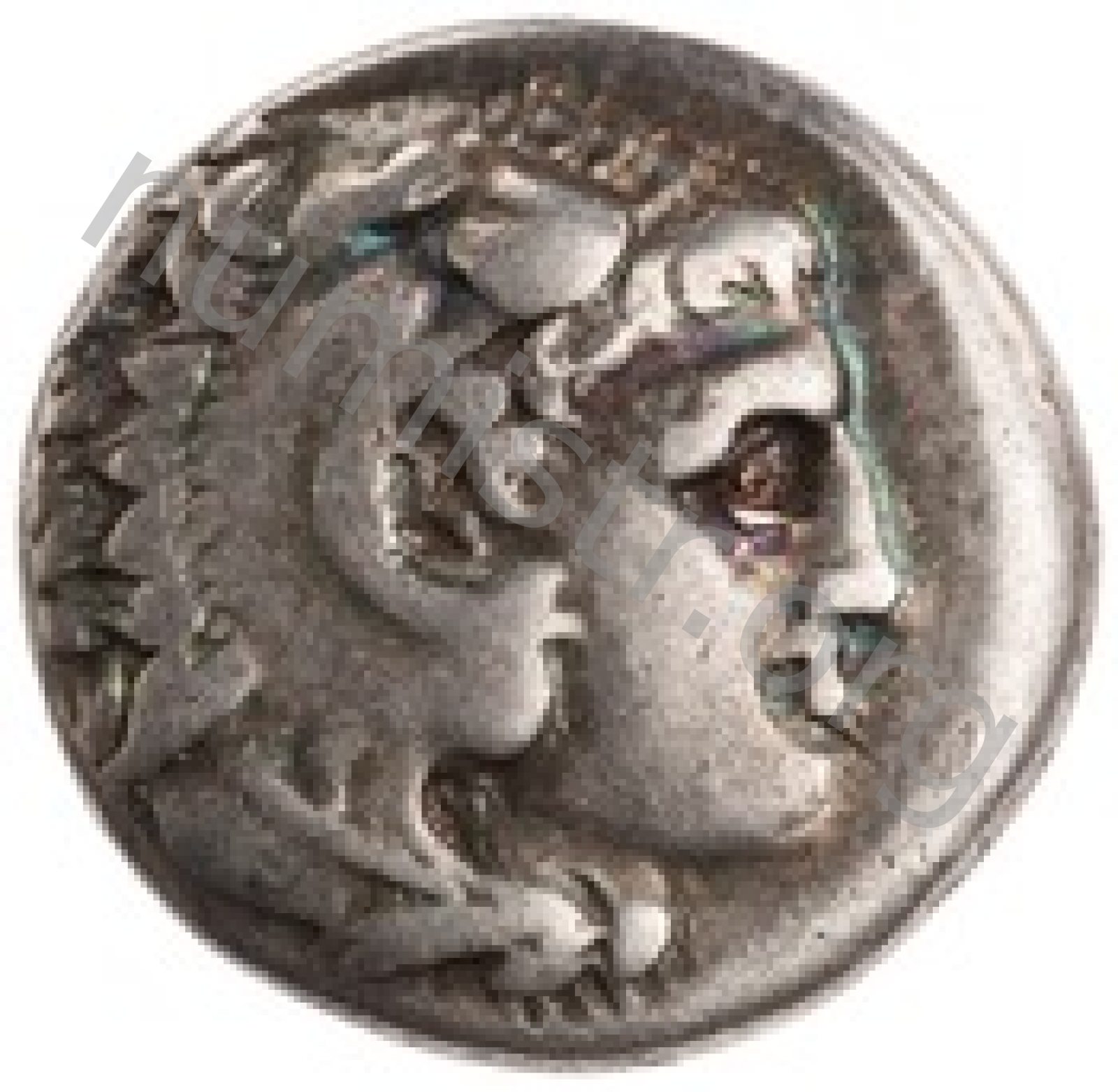 Head of beardless Heracles right wearing lion skin headdress -[en]
