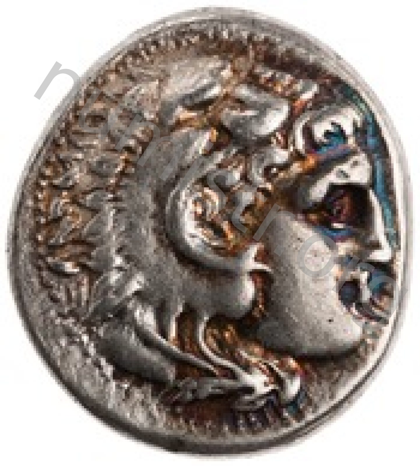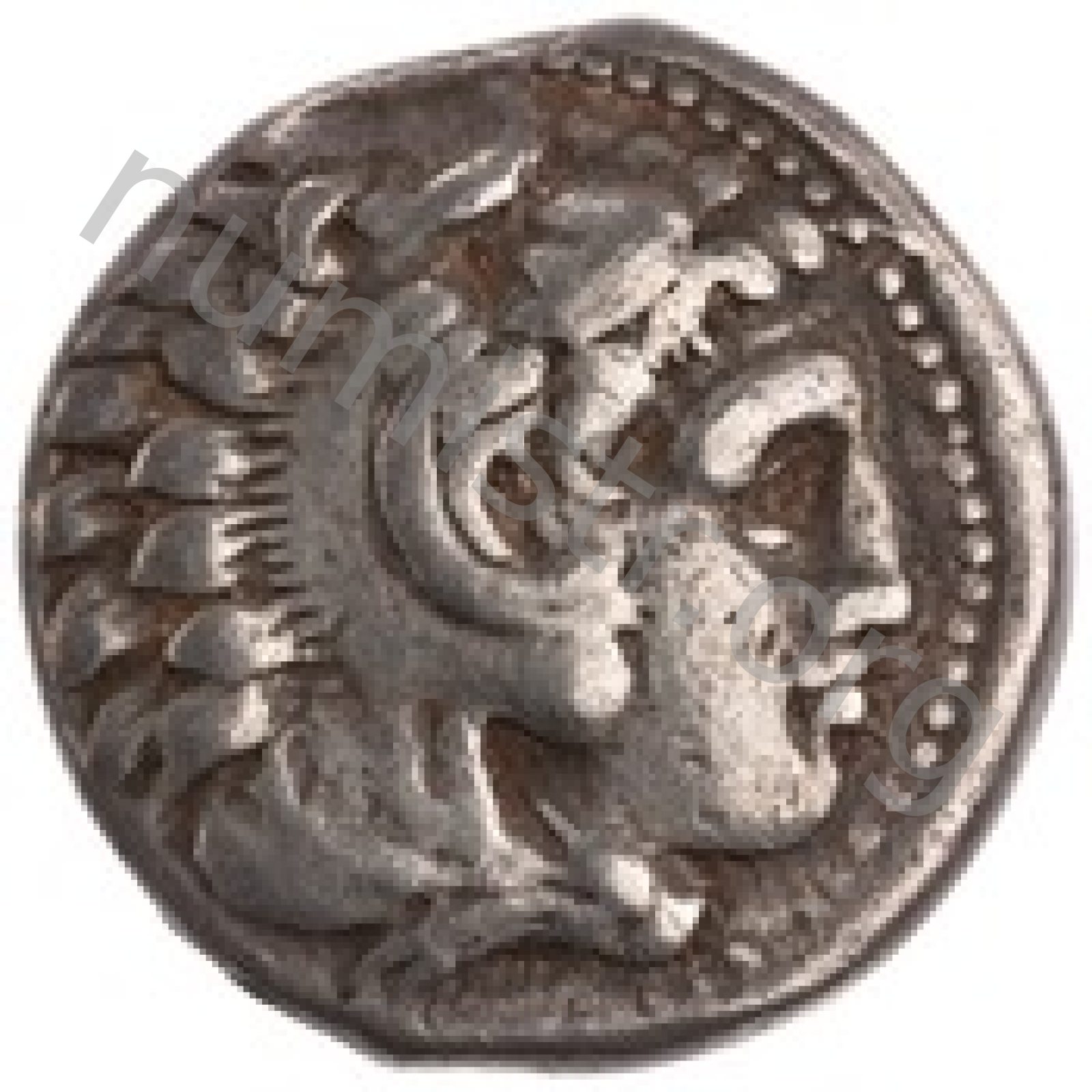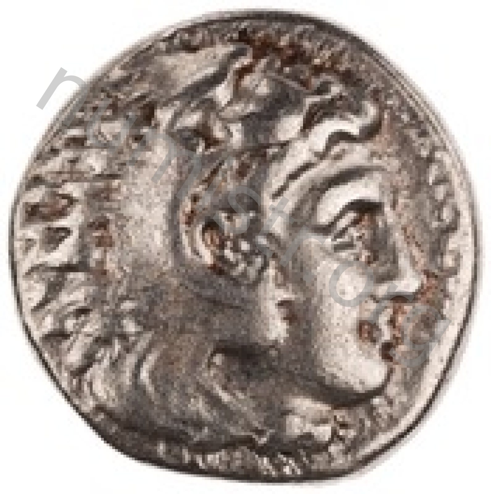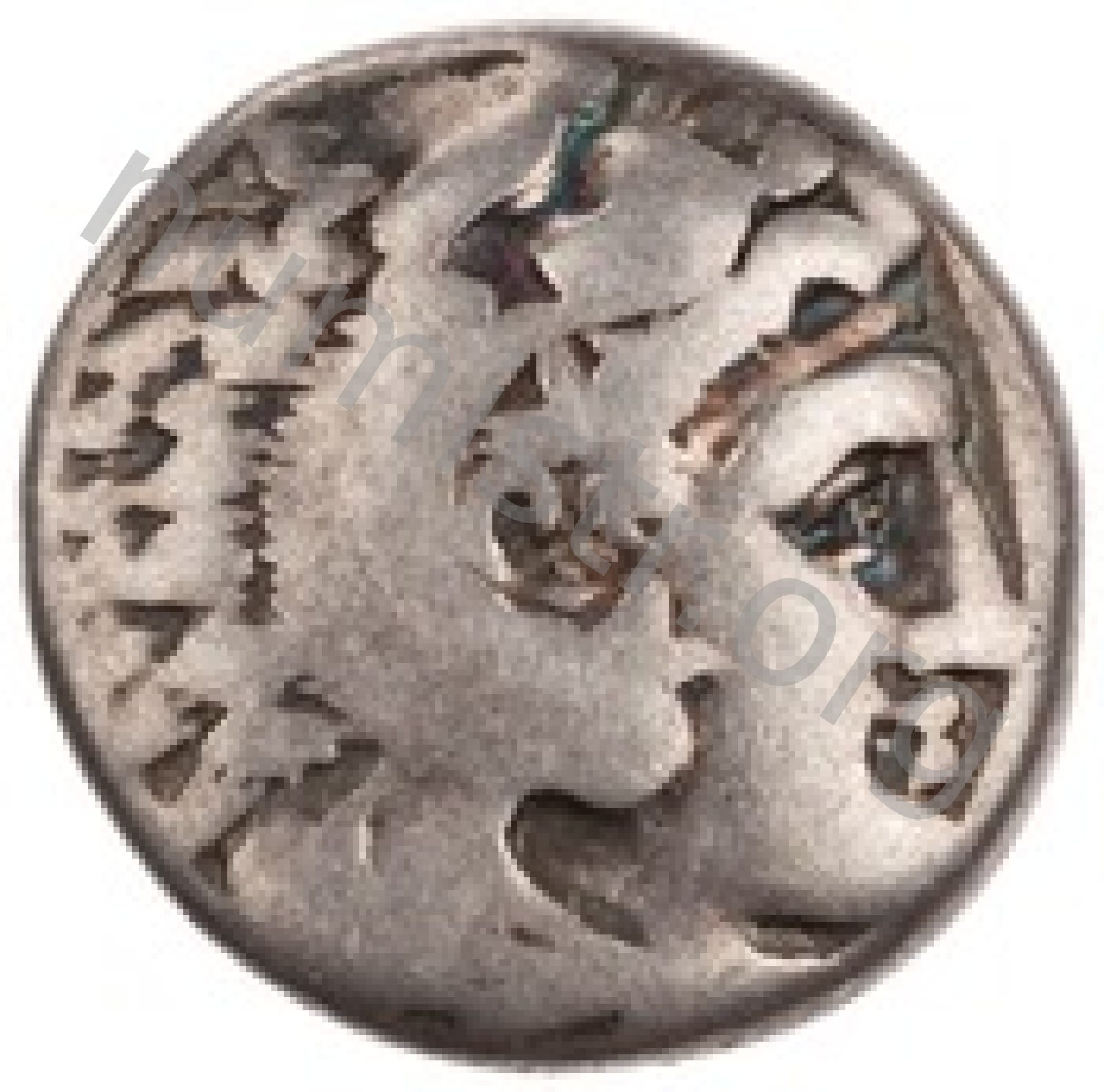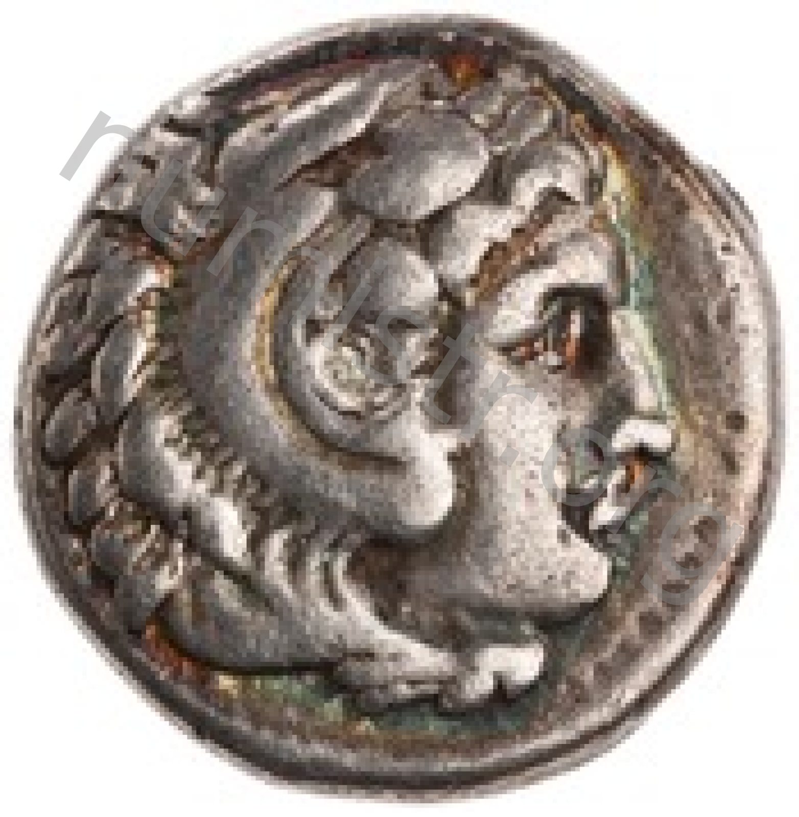 Head of beardless Heracles right wearing lion skin headdress -[en]