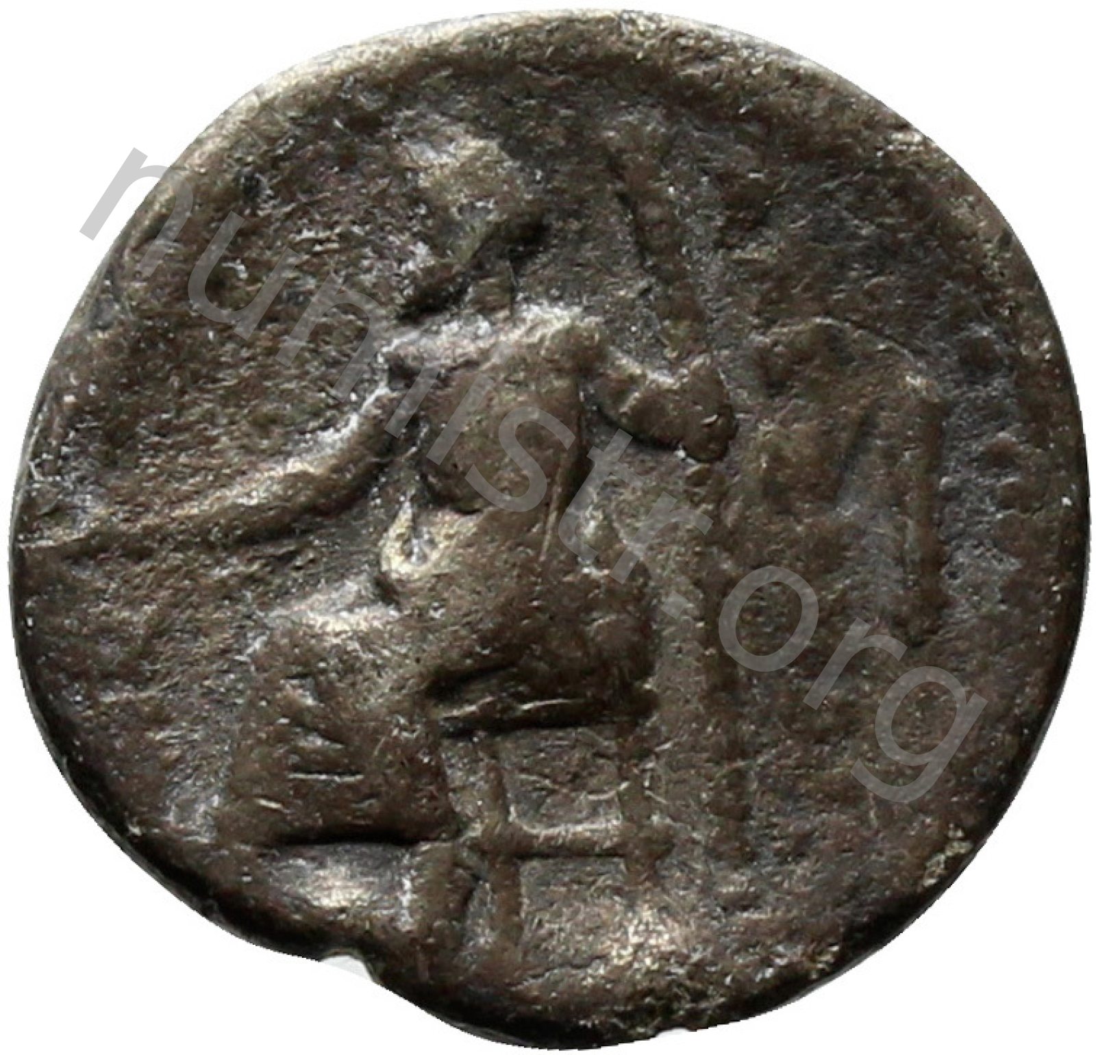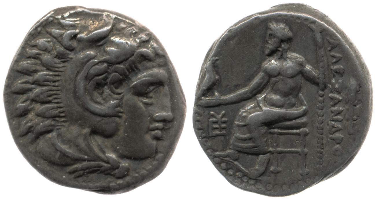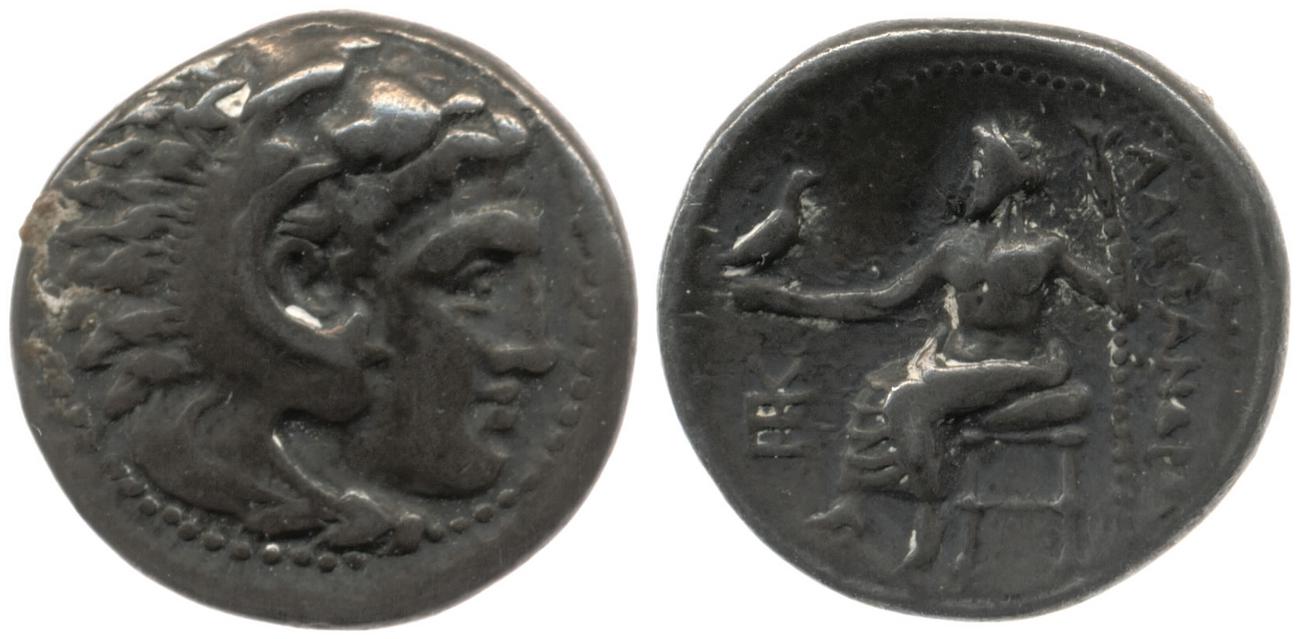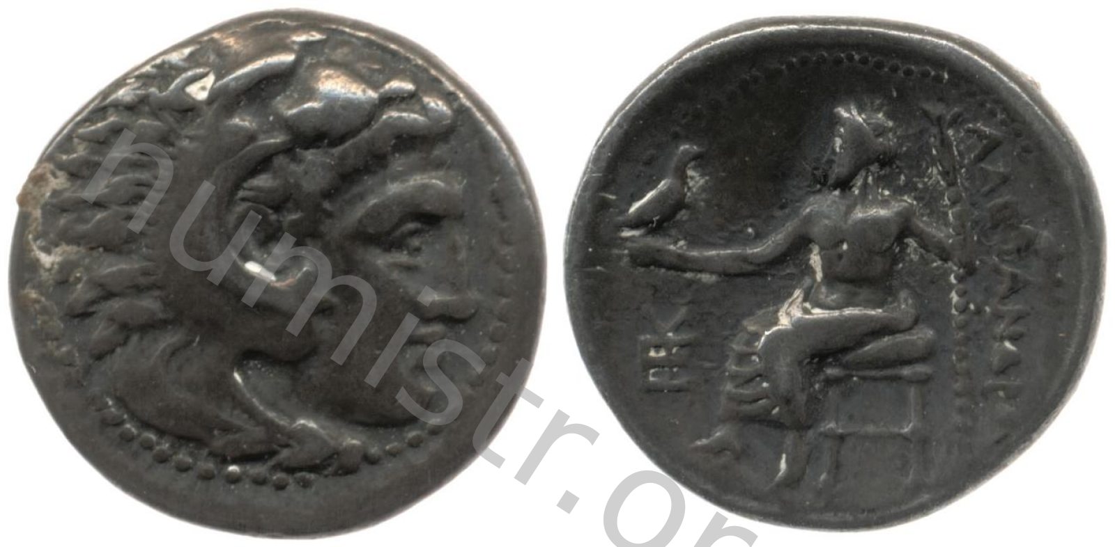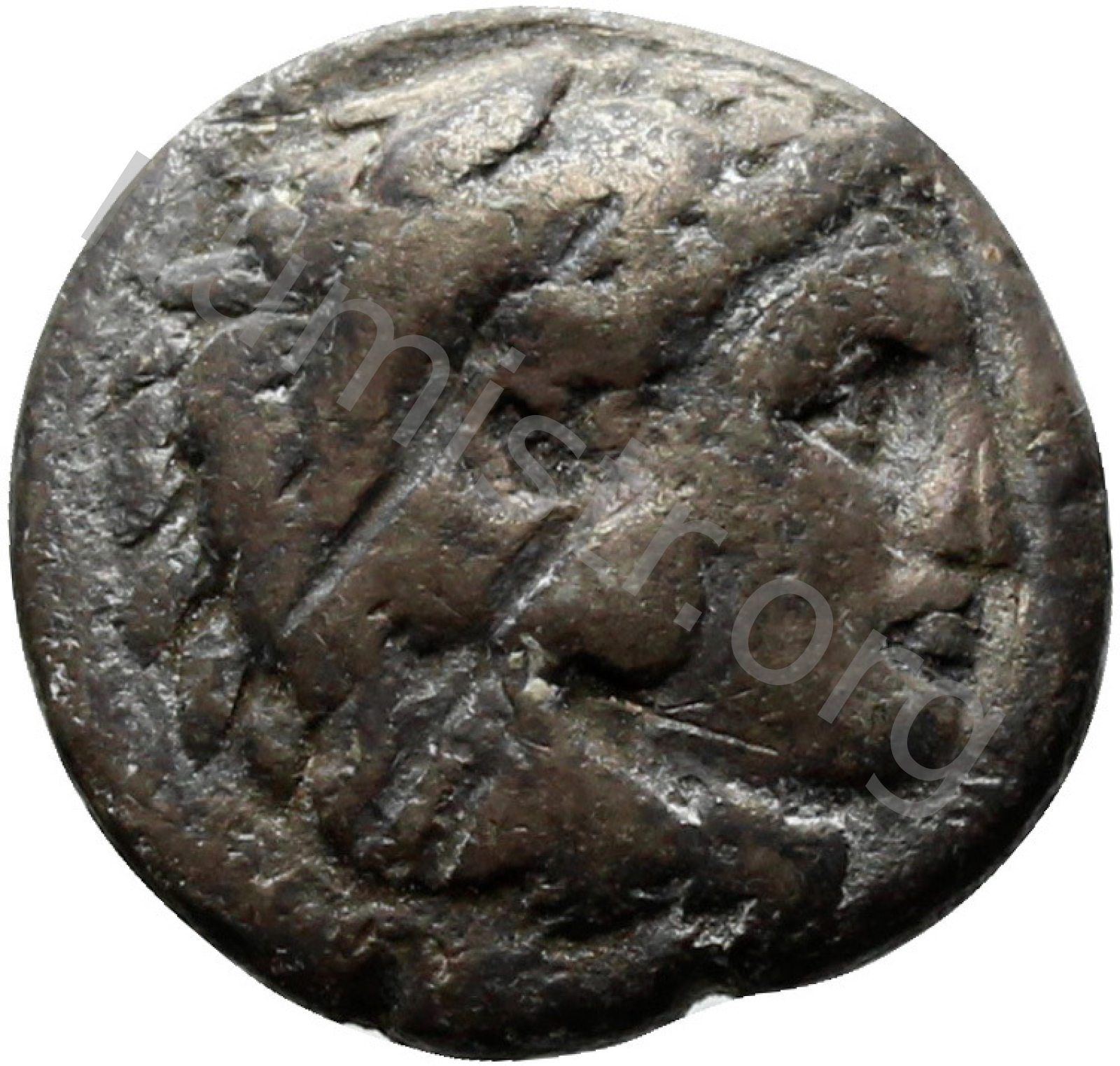 Head of beardless Heracles right wearing lion skin headdress -[en]
