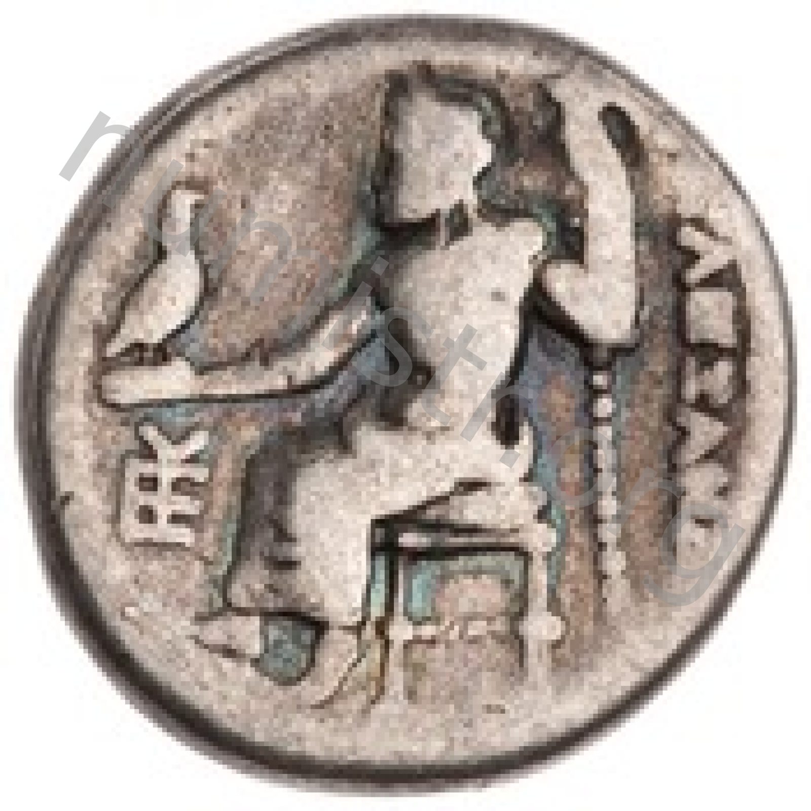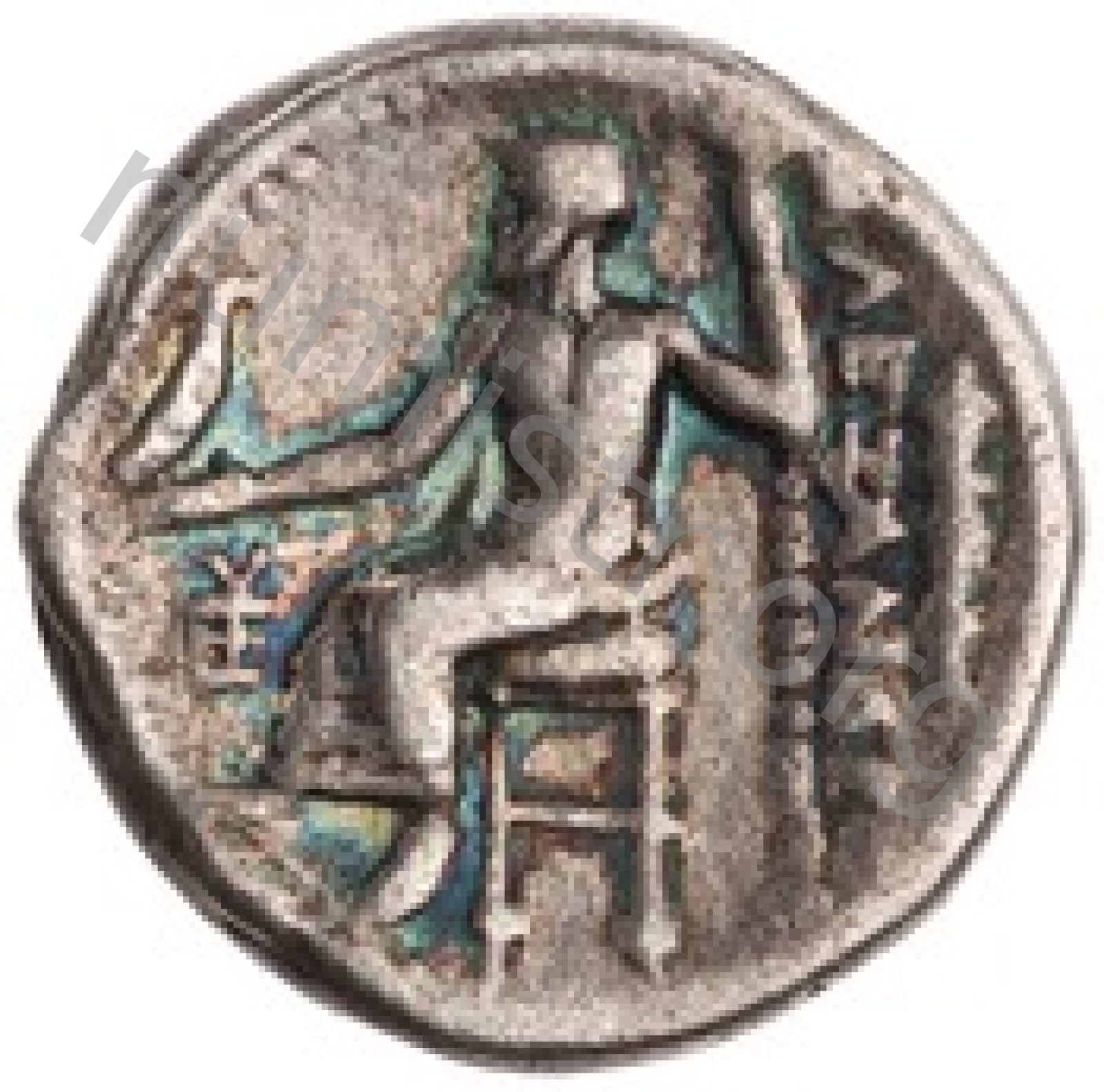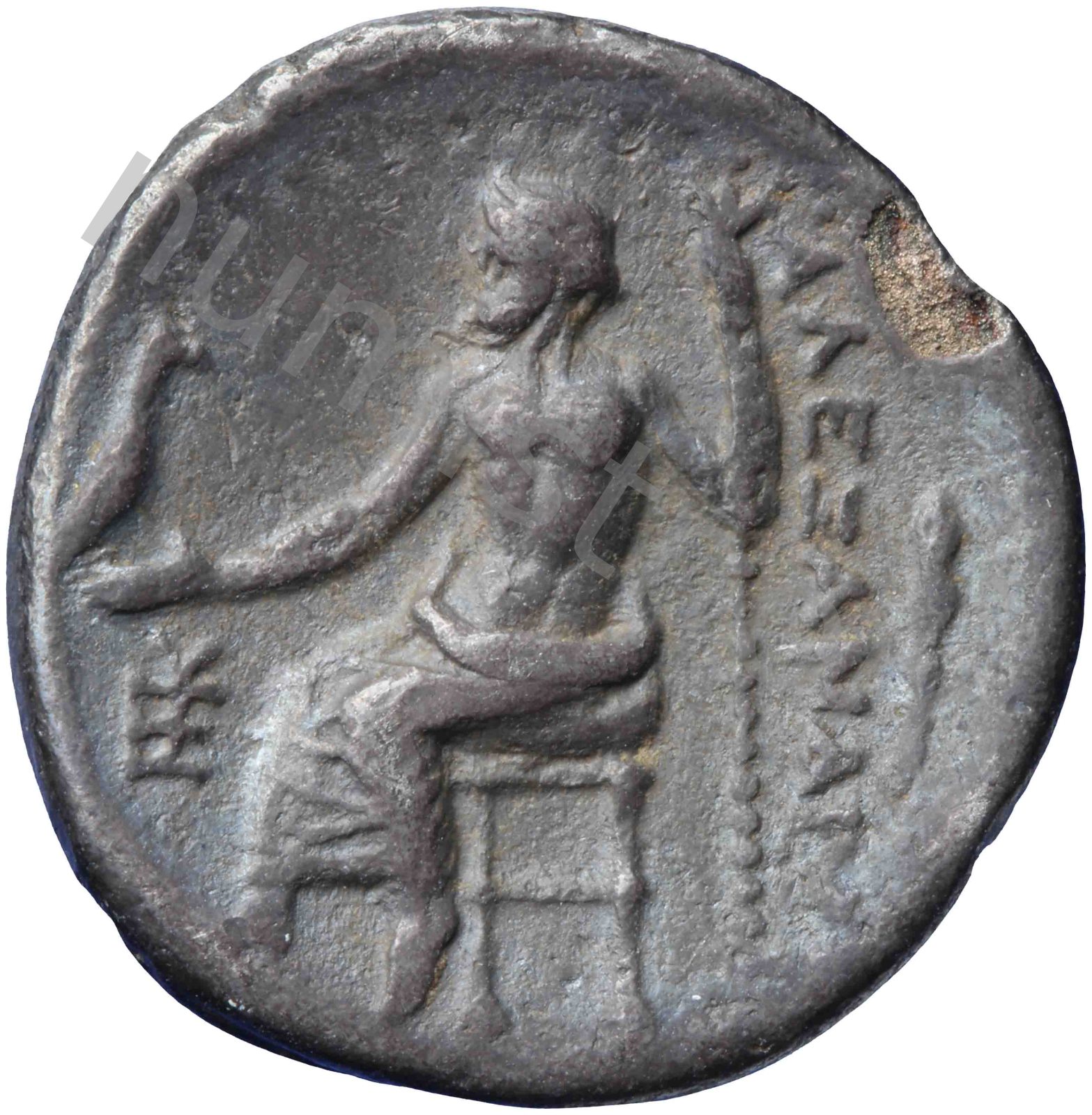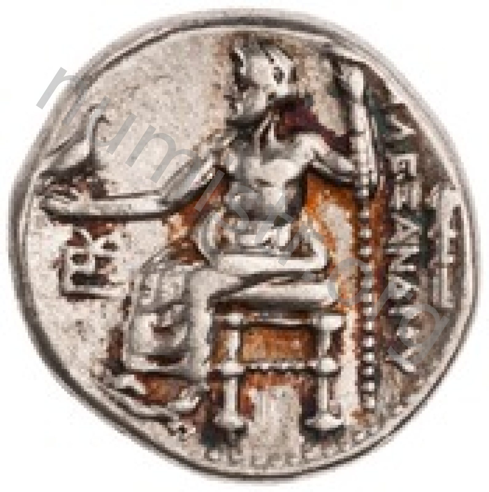 Zeus tabure-tahtta oturuyor sol elinde kartal sağ elinde asa var.