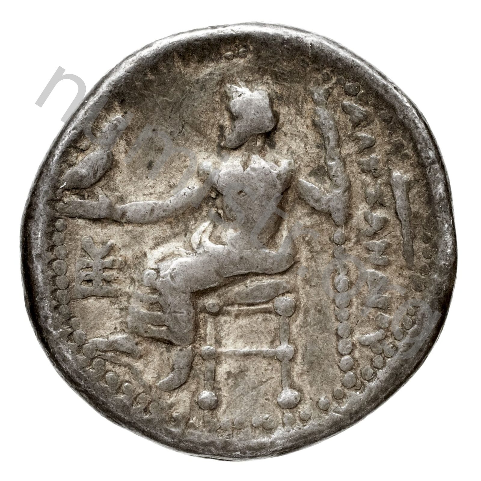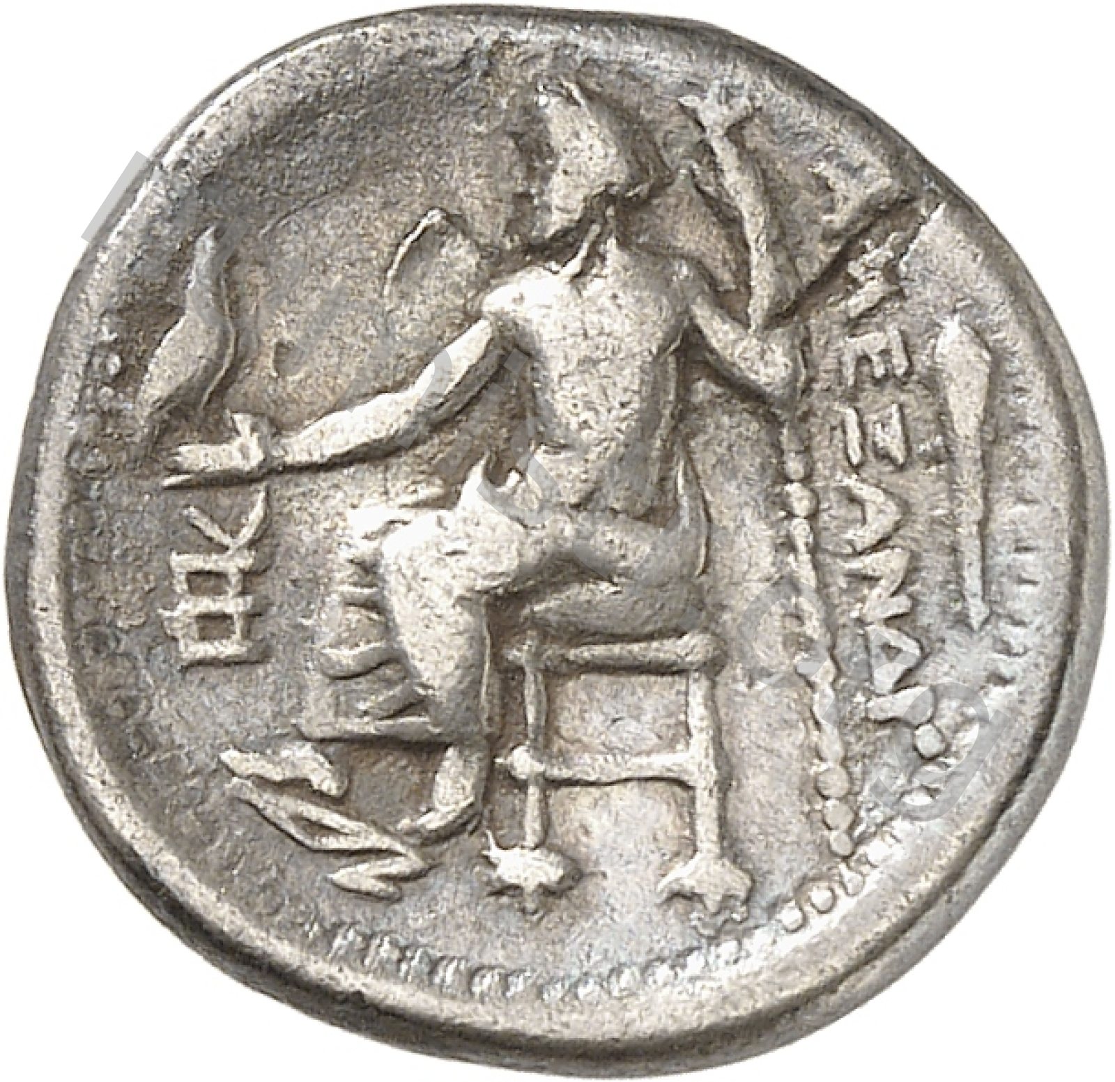 Zeus seated on stool-throne left eagle on outstretched right hand sceptre in left hand -[en]