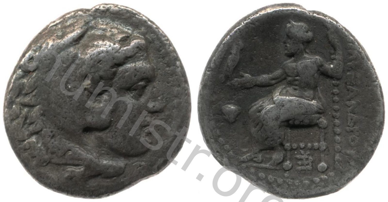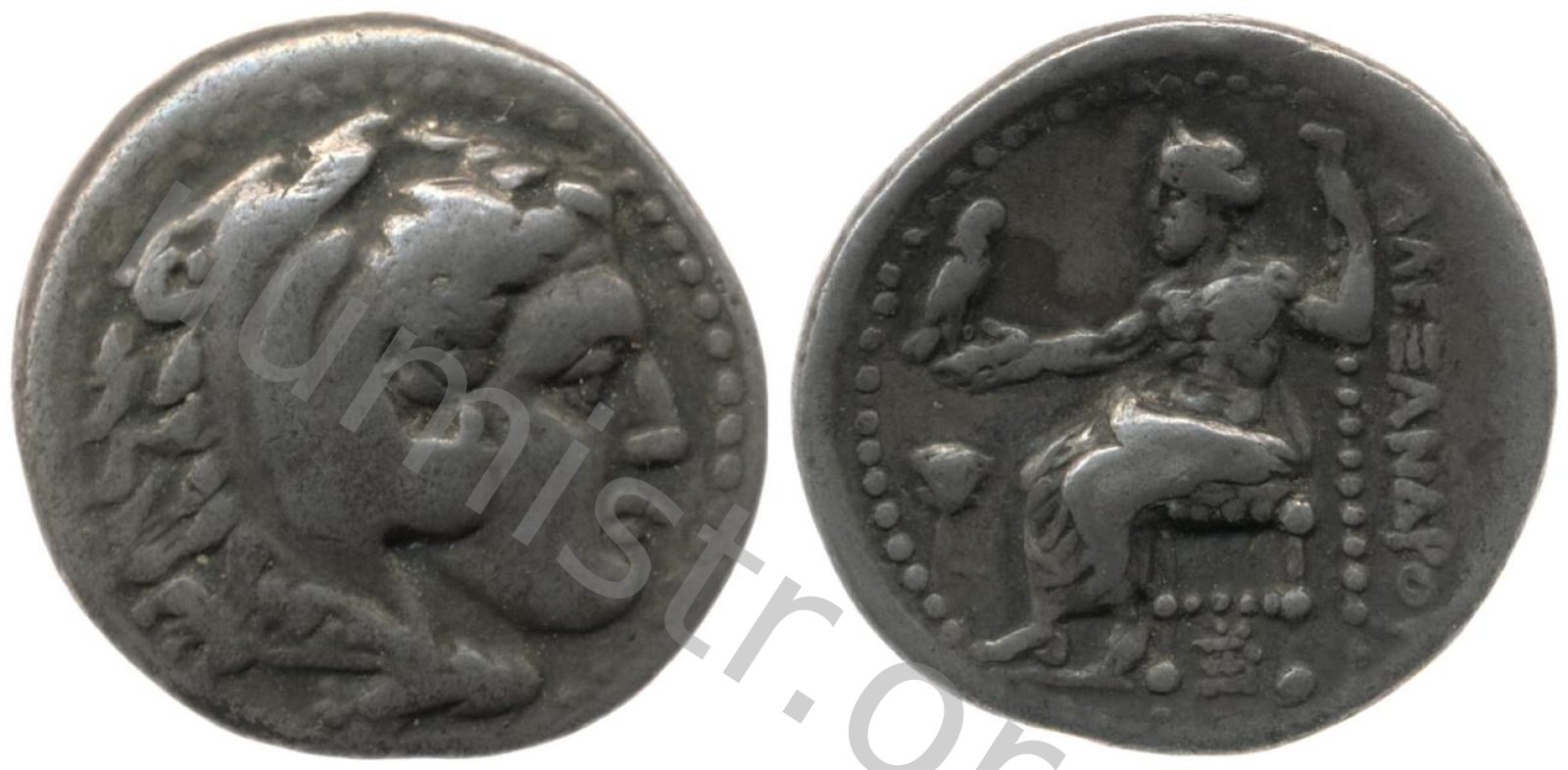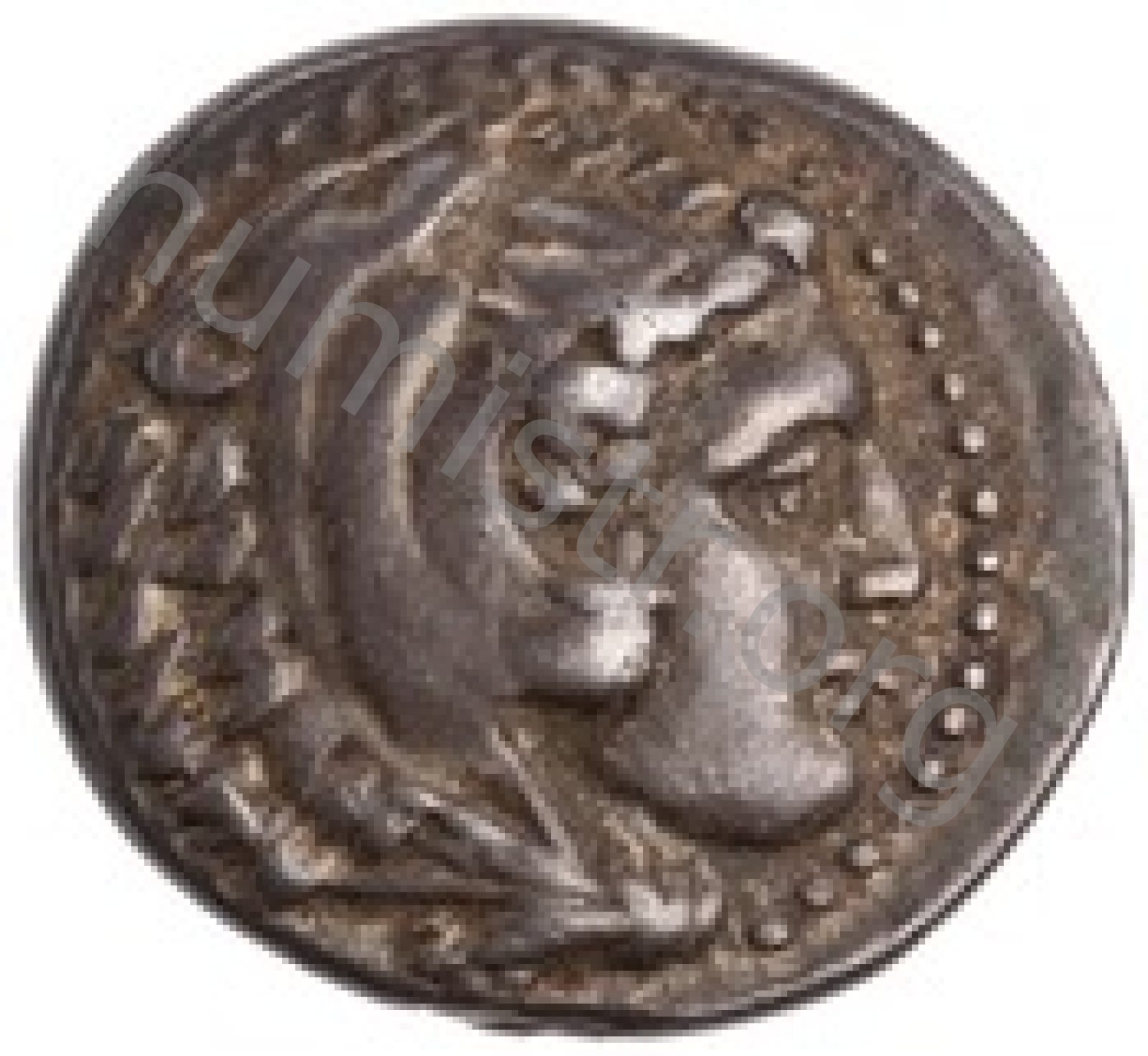 Head of beardless Heracles right wearing lion skin headdress -[en]
