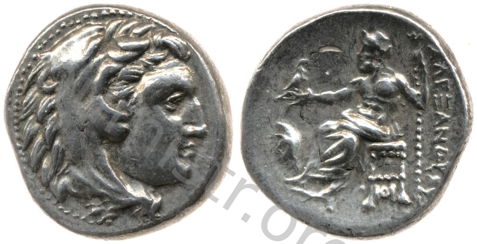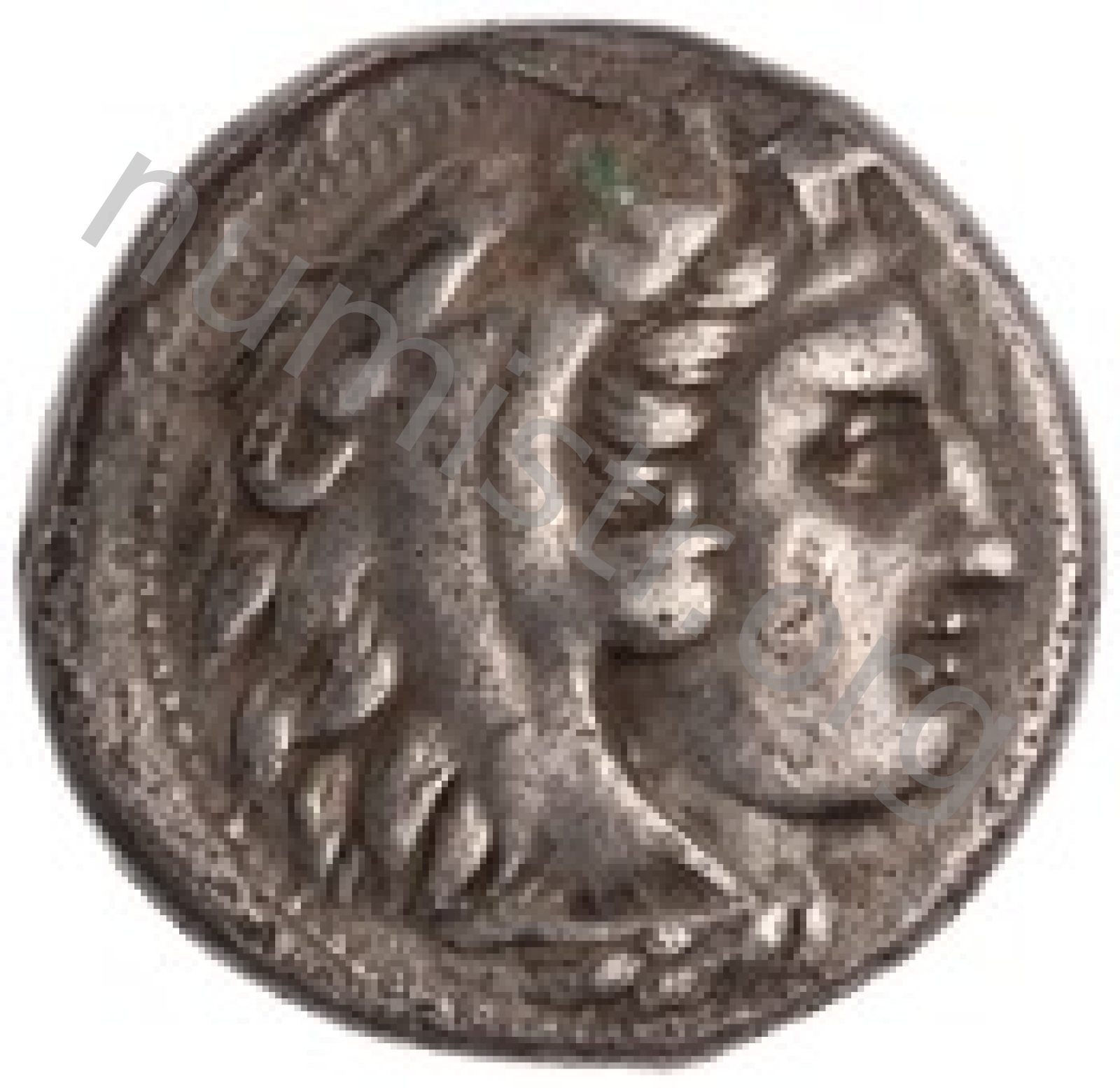 Head of beardless Heracles right wearing lion skin headdress -[en]