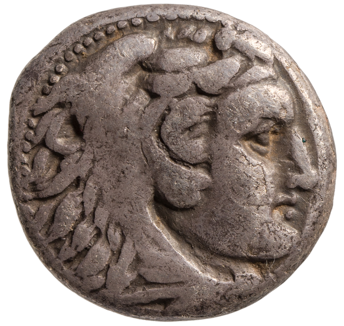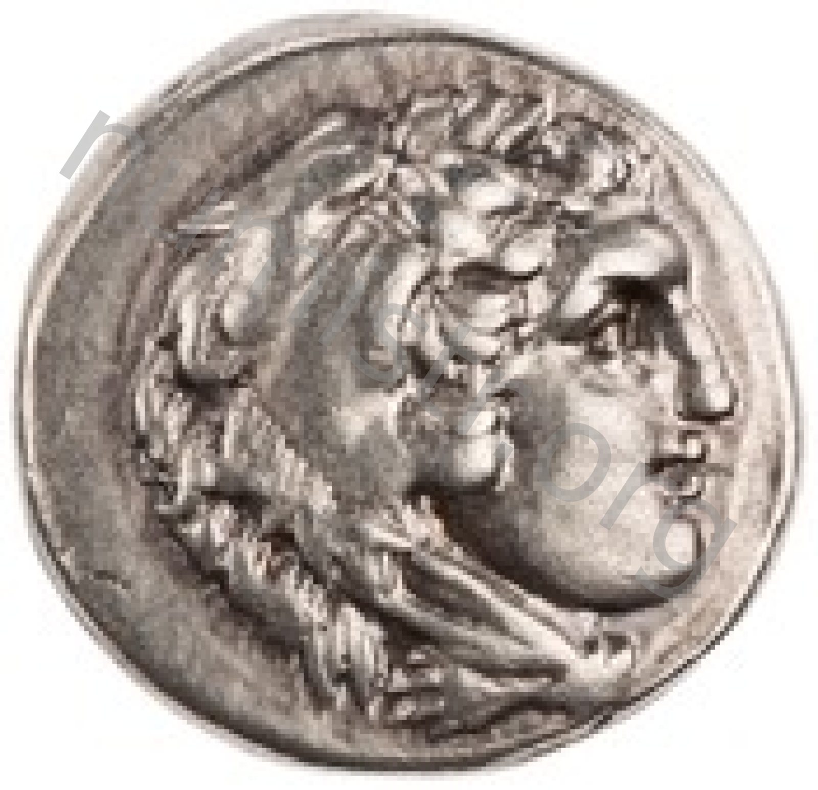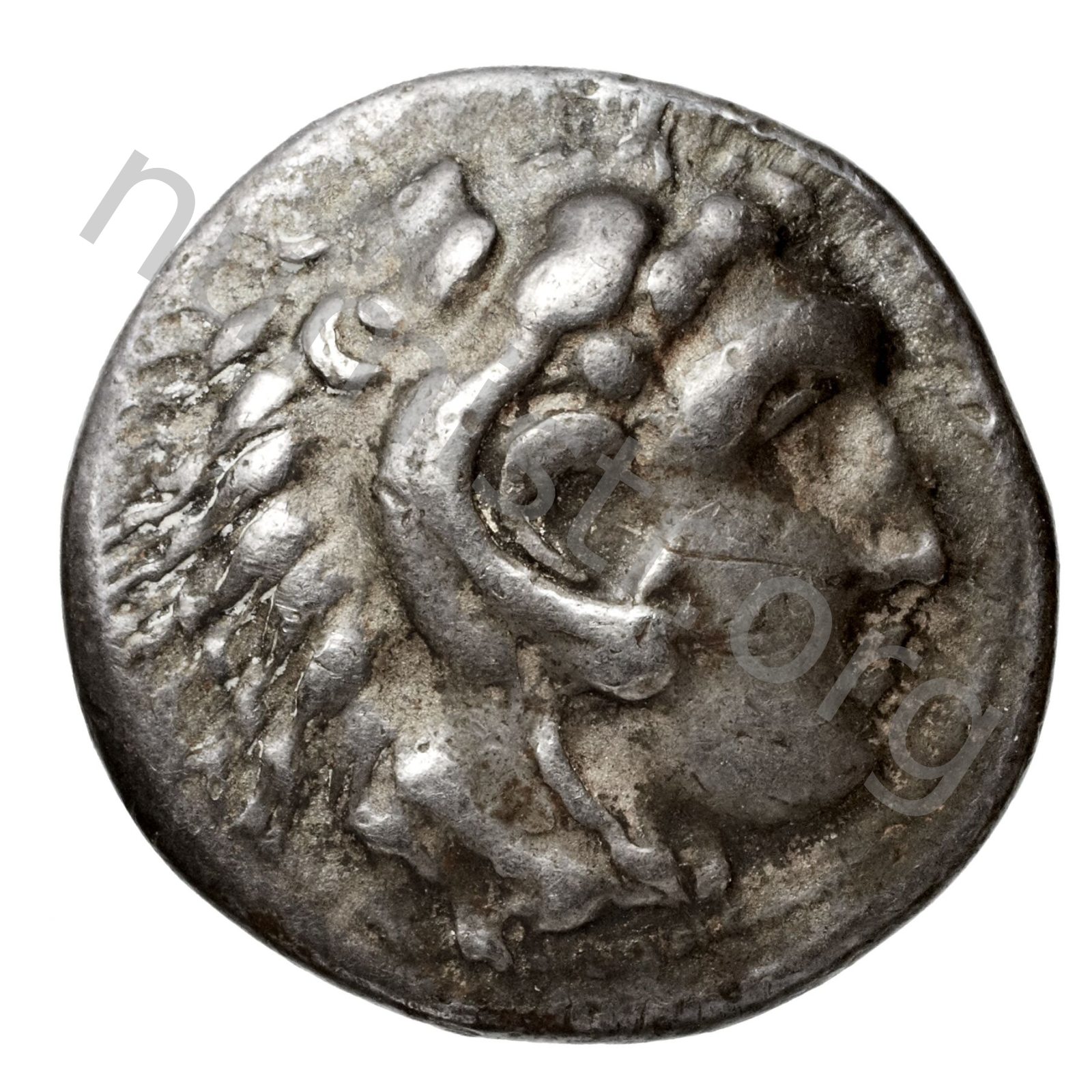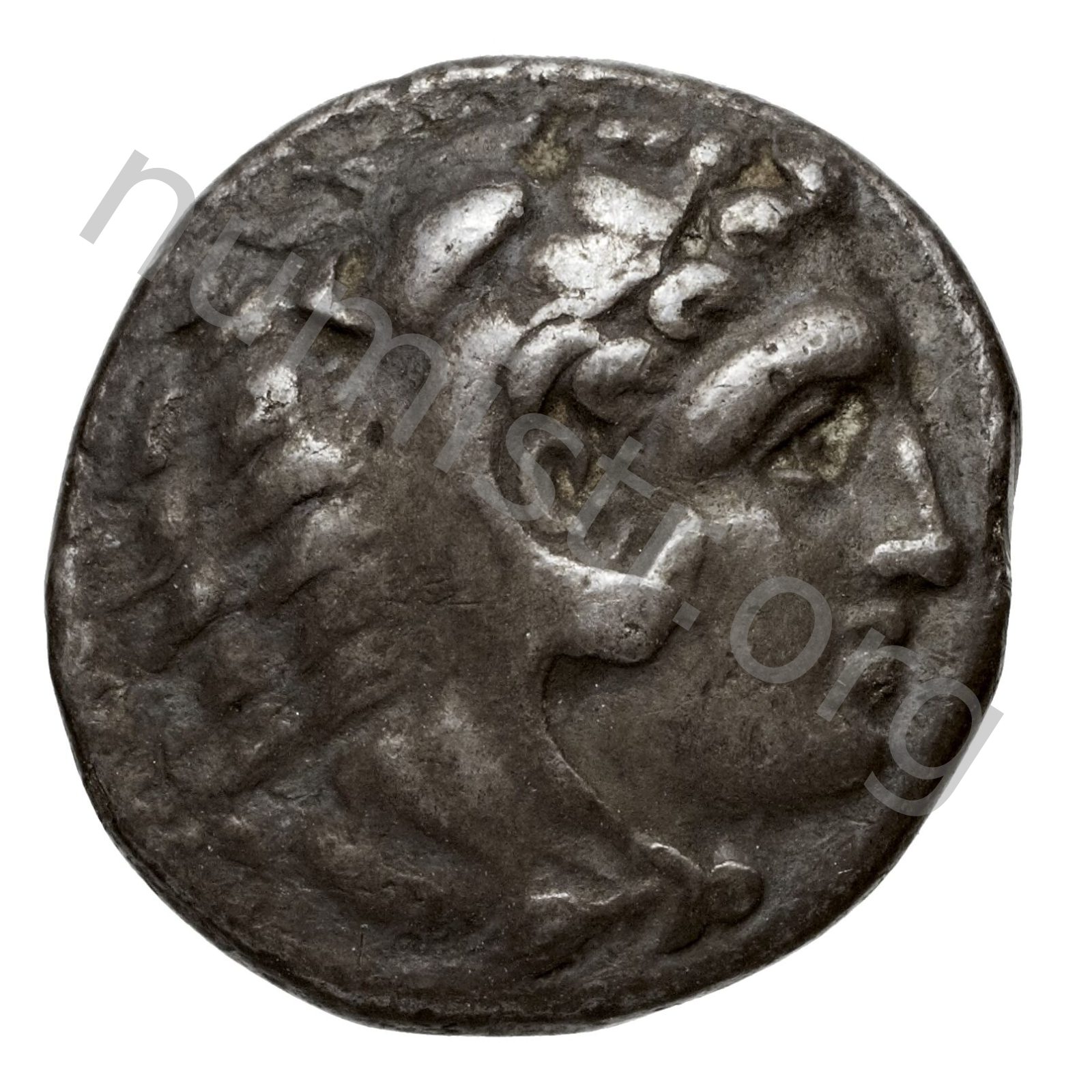 Head of beardless Heracles right wearing lion skin headdress -[en]