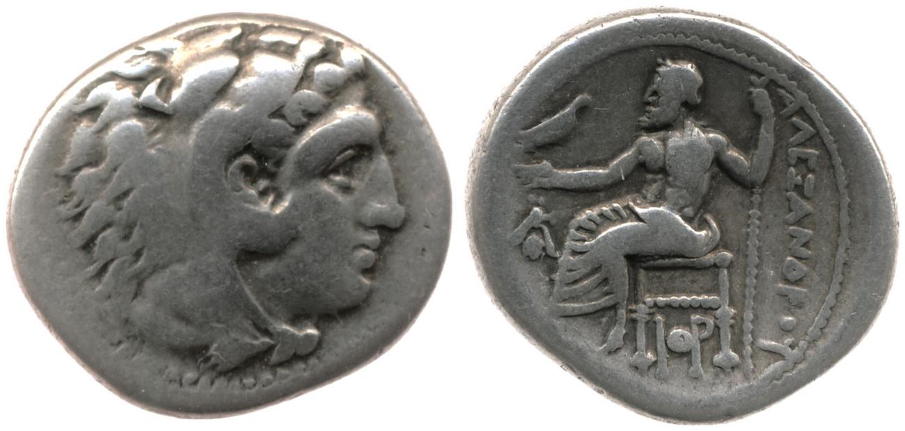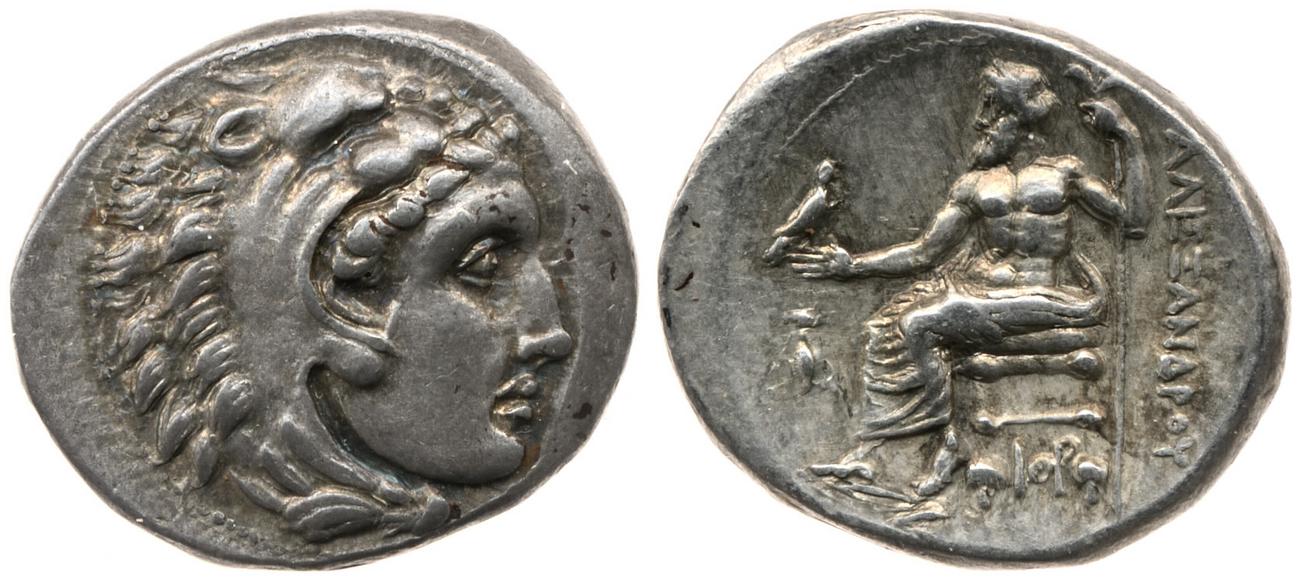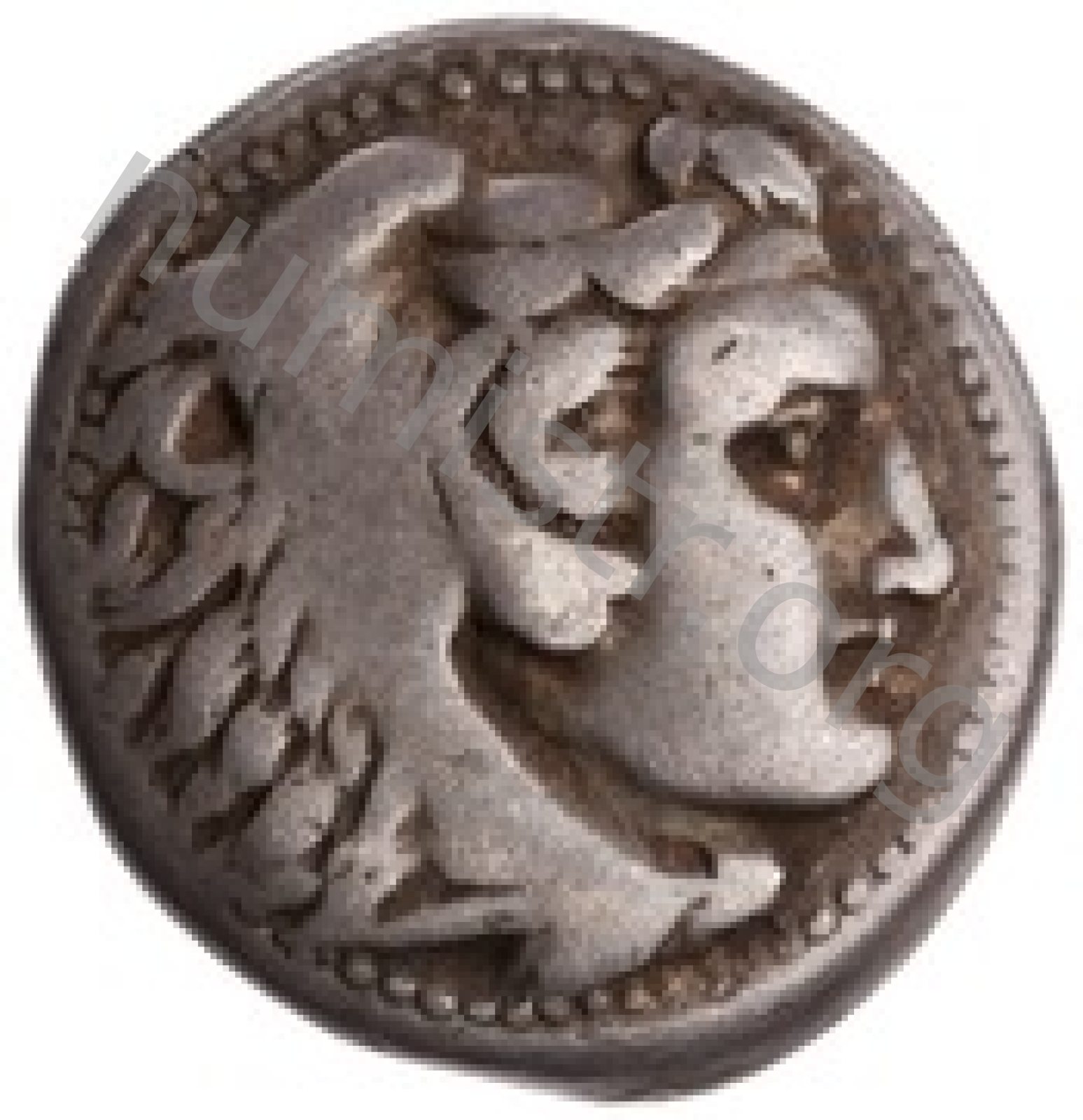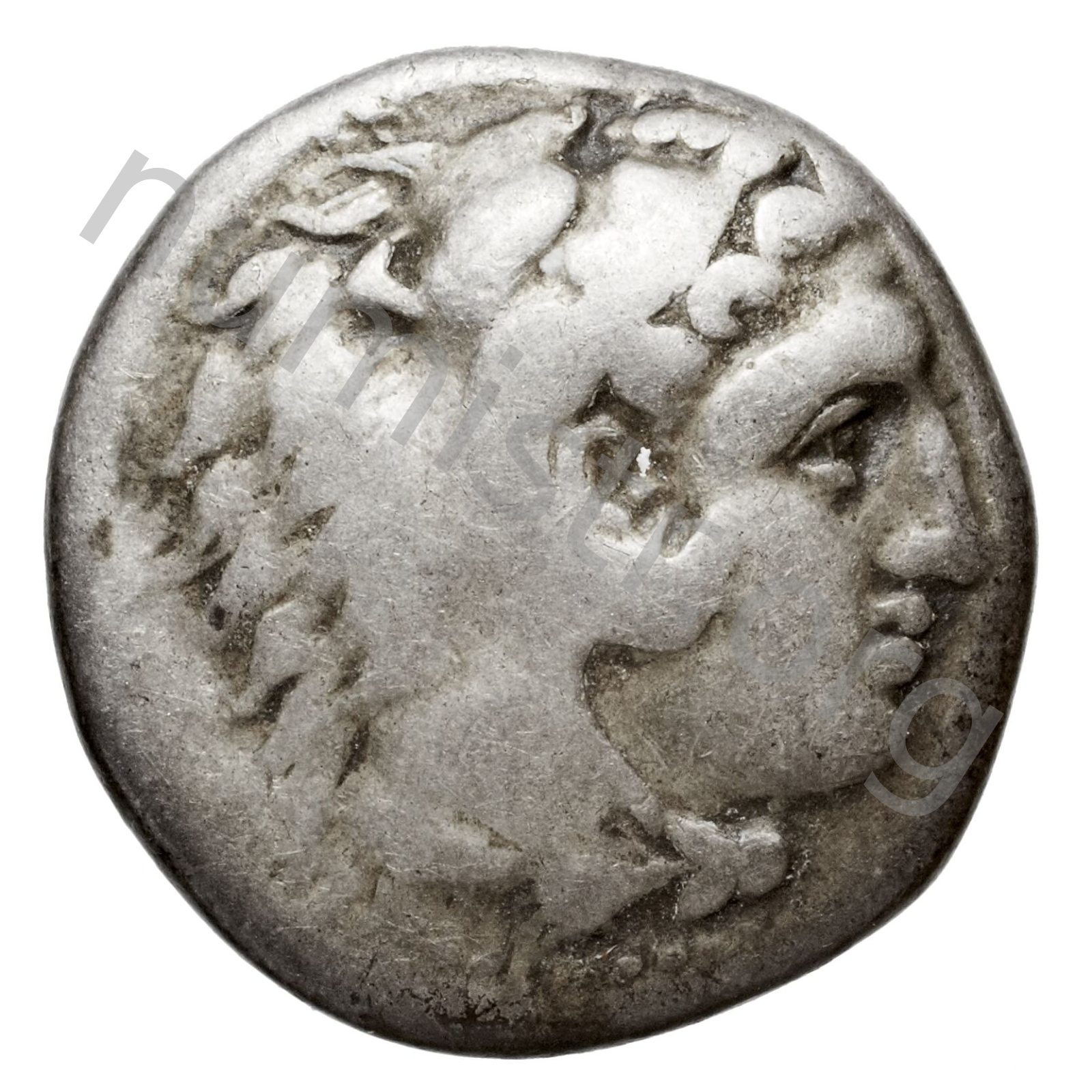 Head of beardless Heracles right wearing lion skin headdress -[en]