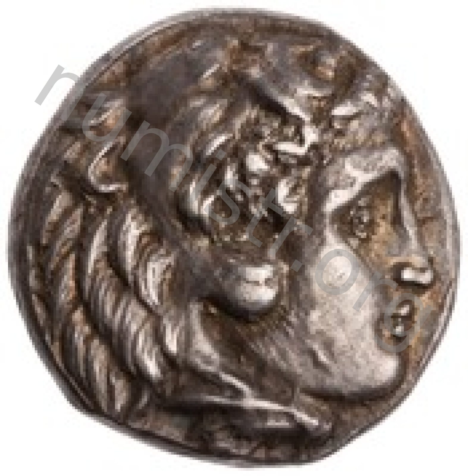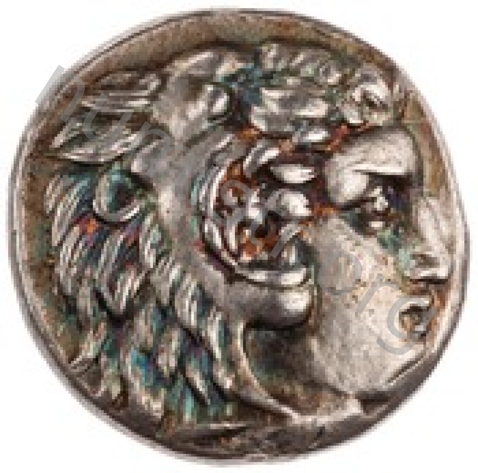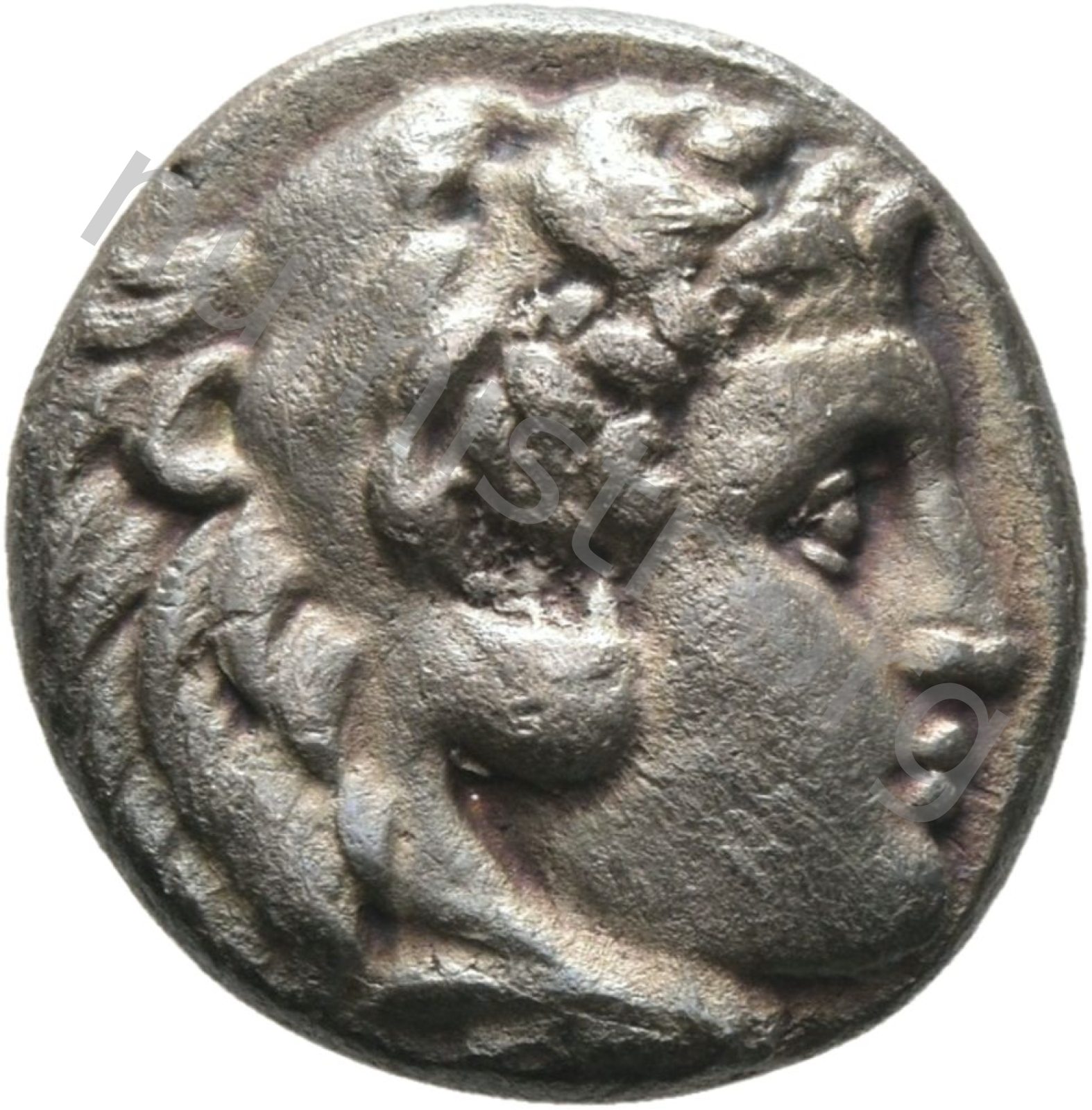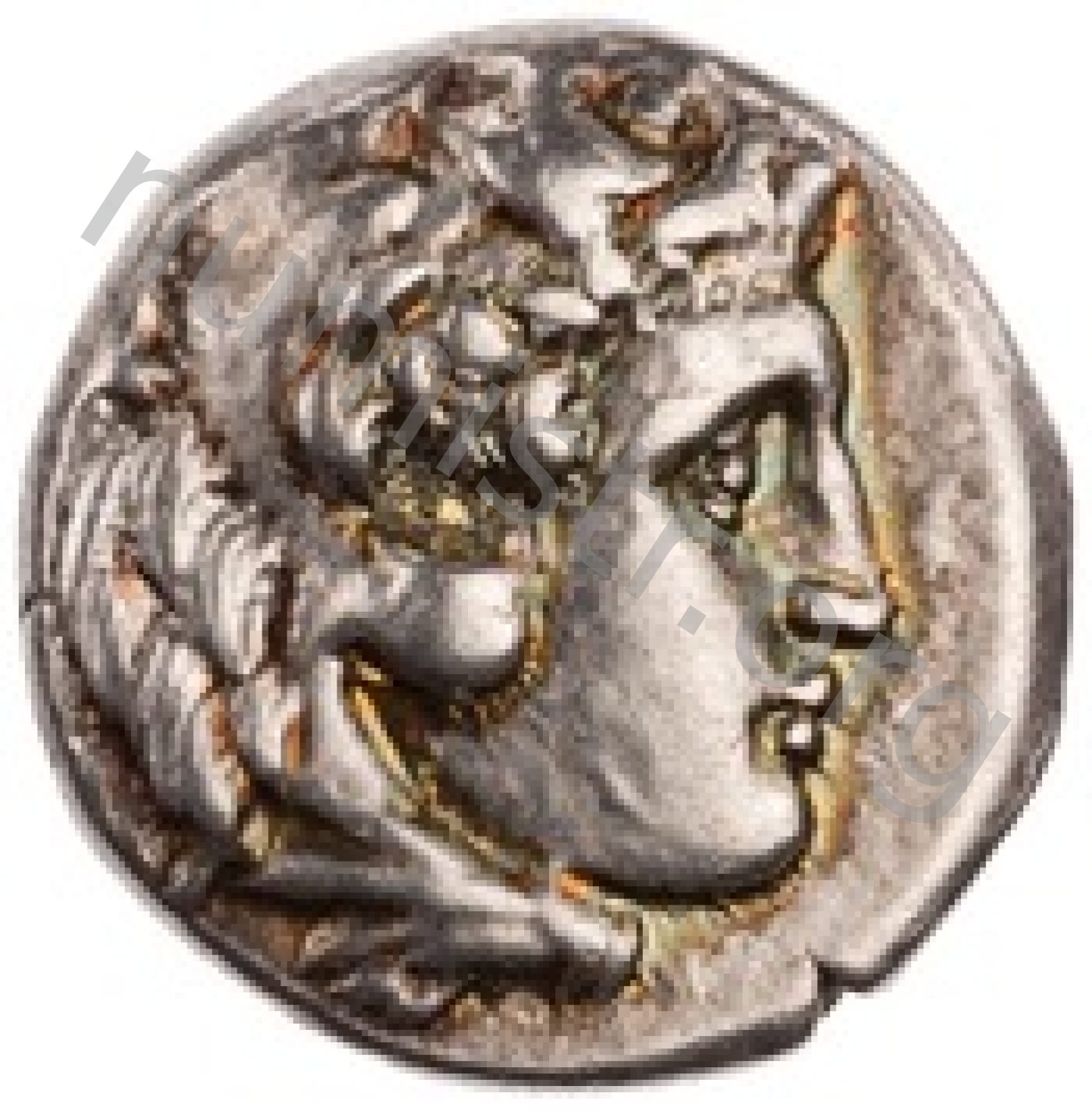Head of beardless Heracles right wearing lion skin headdress -[en]
