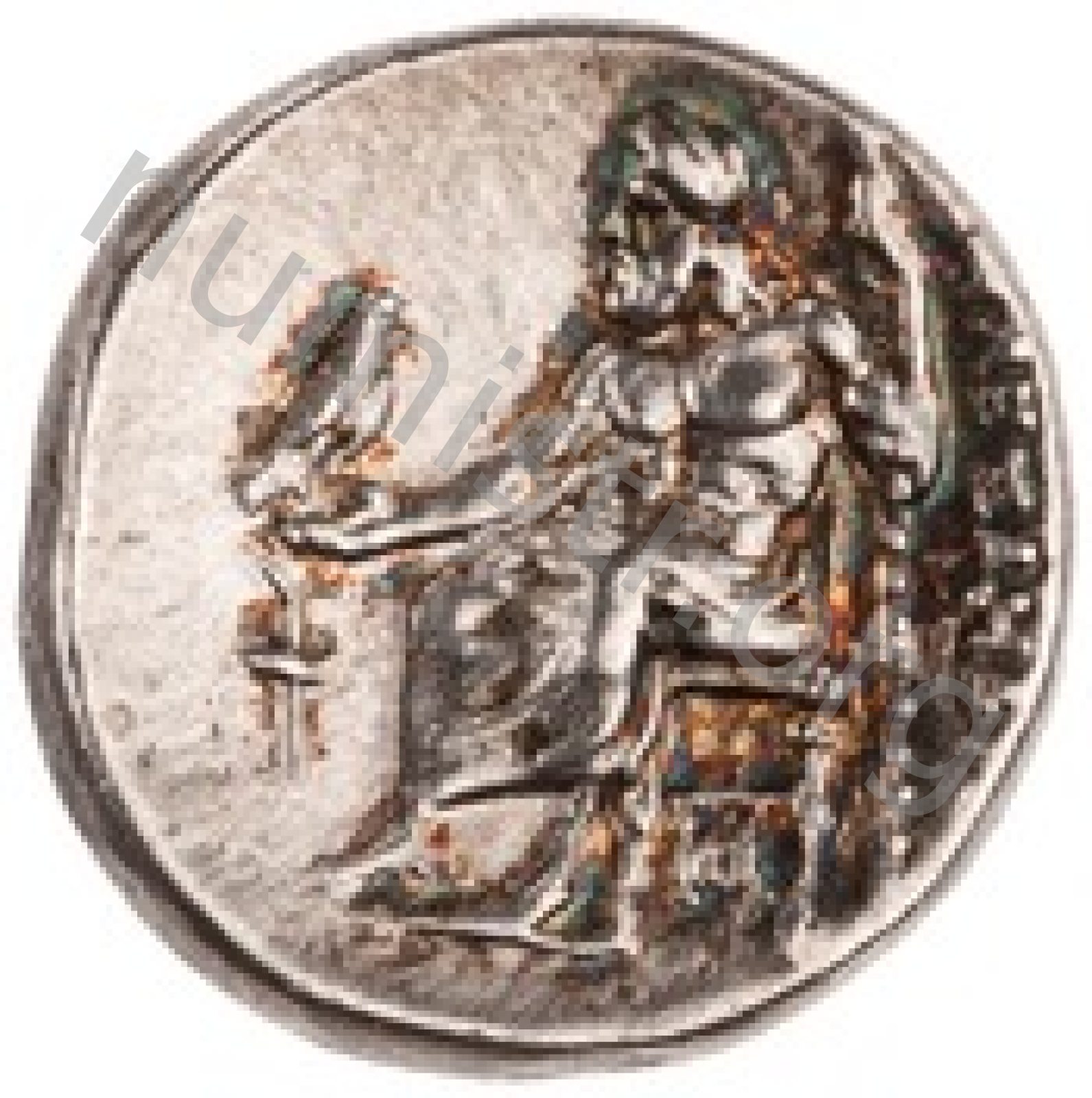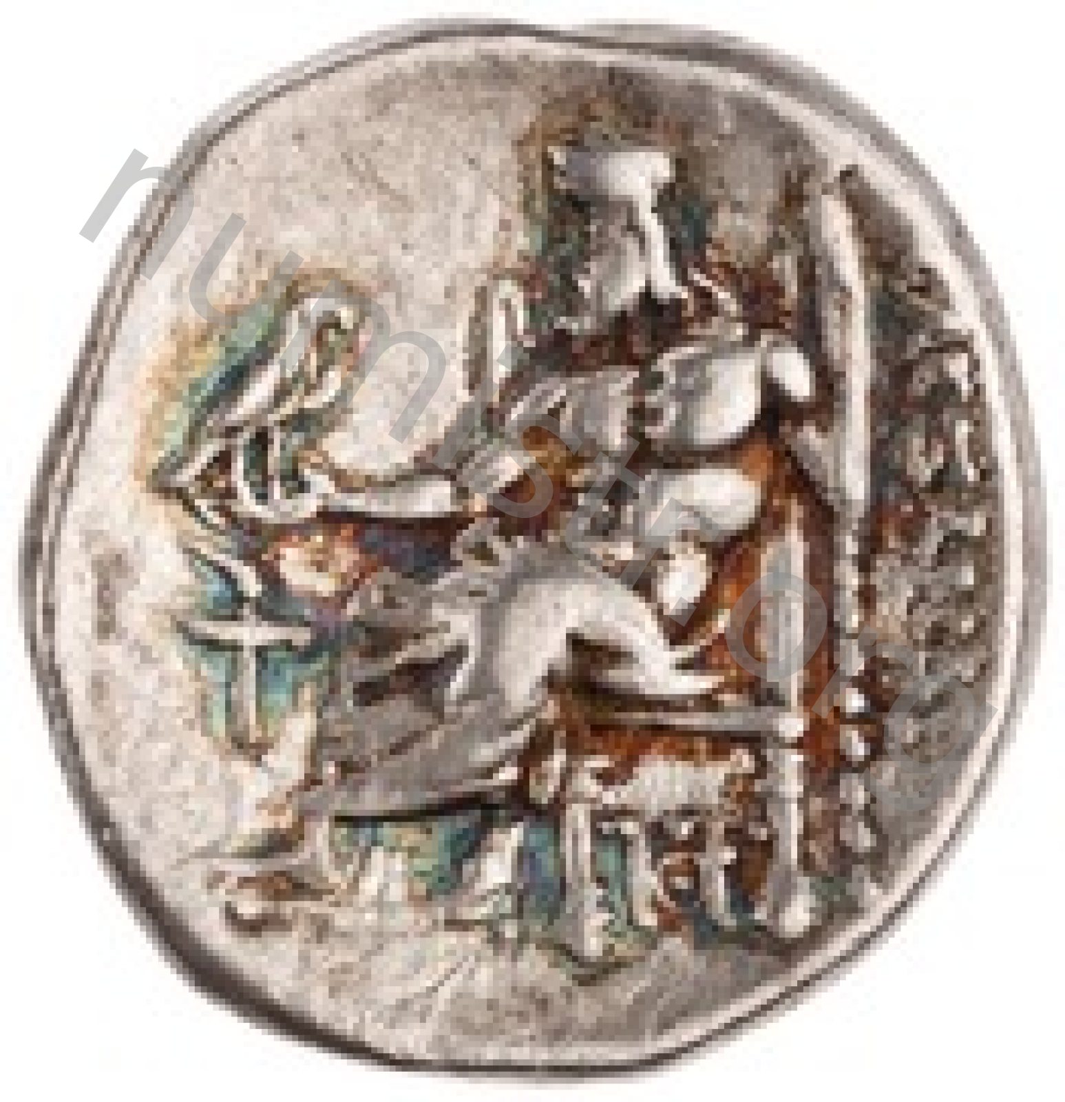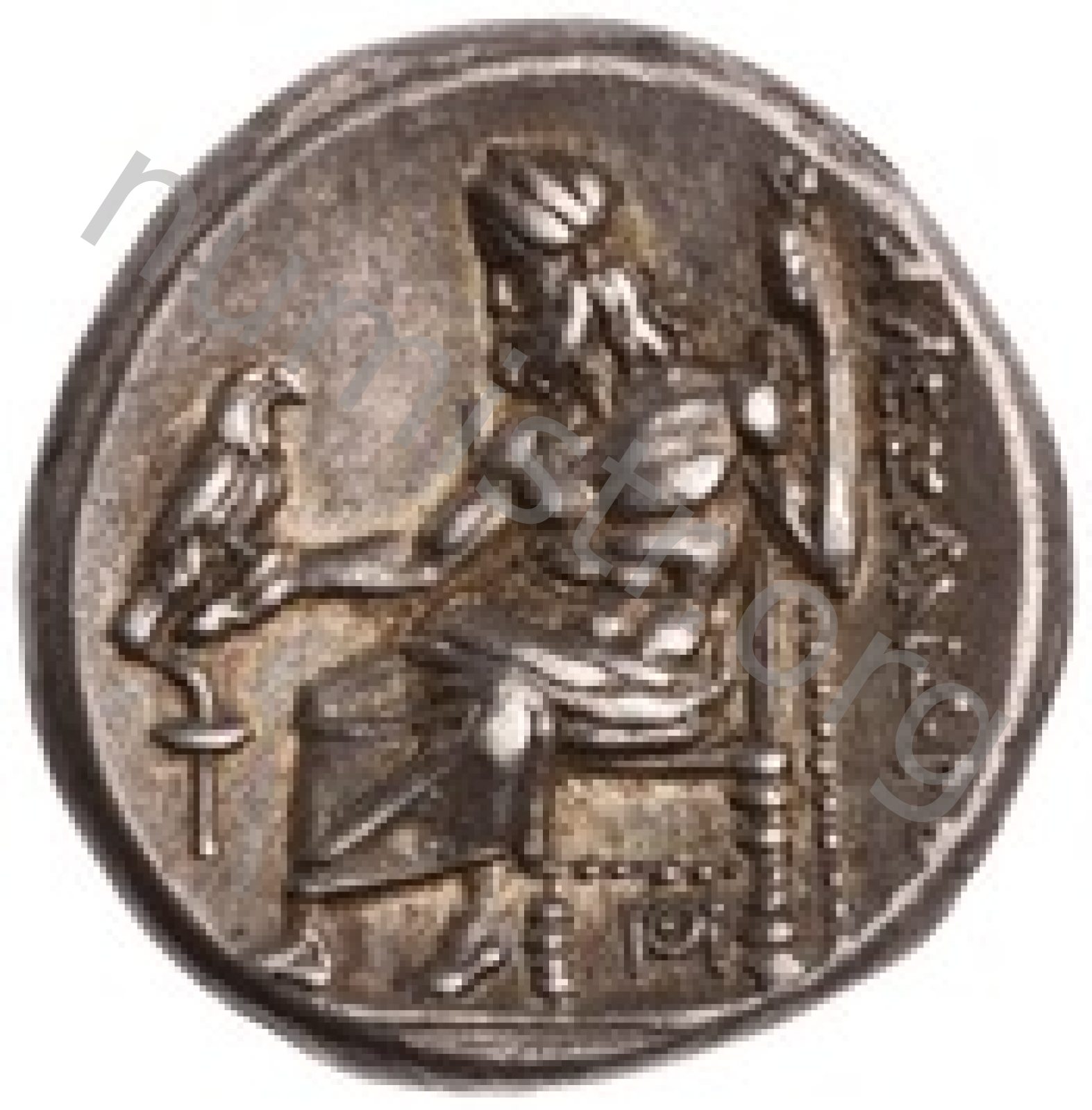 Zeus tabure-tahtta oturuyor sol elinde kartal sağ elinde asa var.