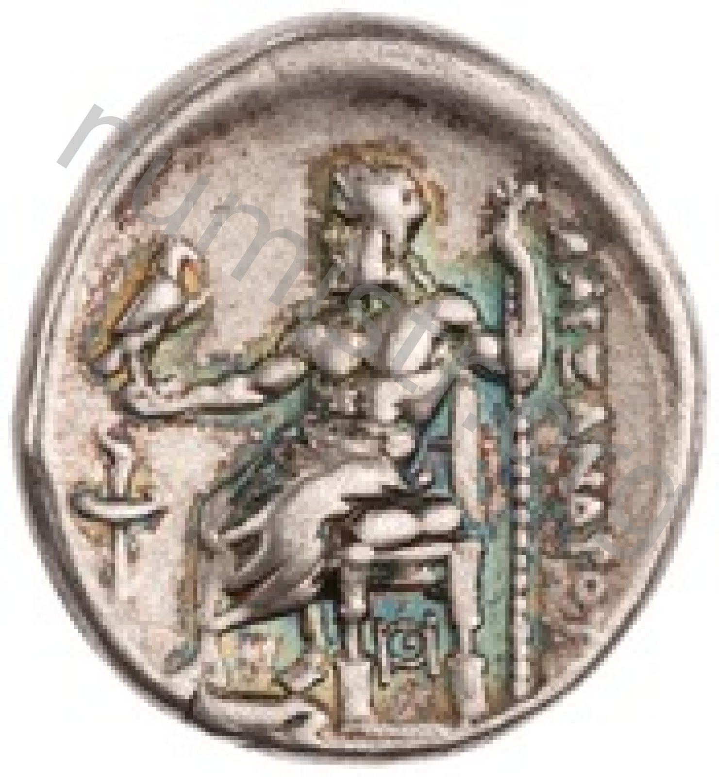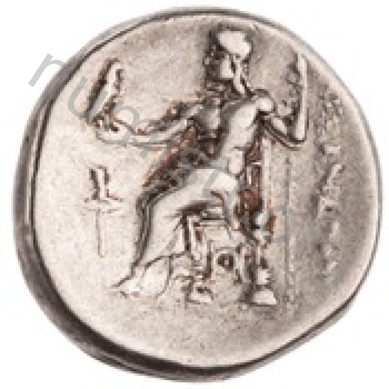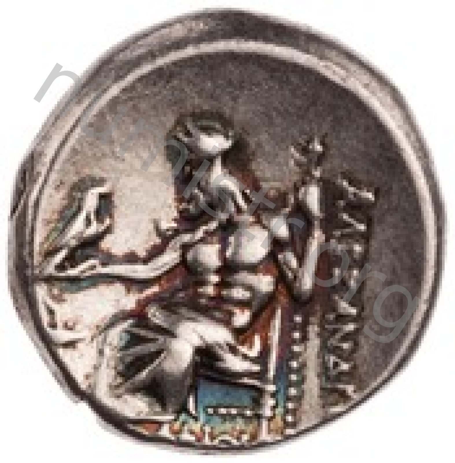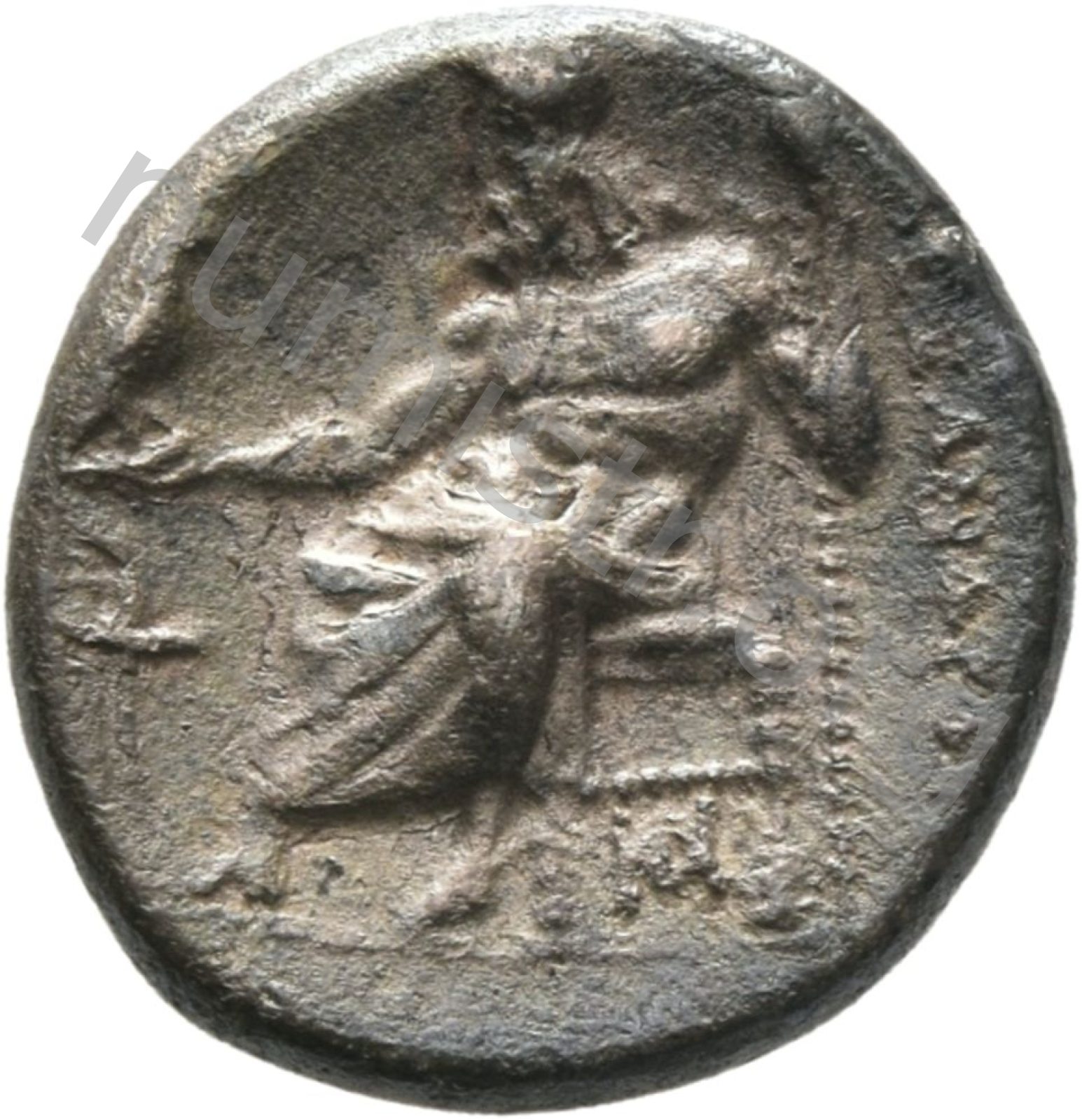 Zeus tabure-tahtta oturuyor sol elinde kartal sağ elinde asa var.