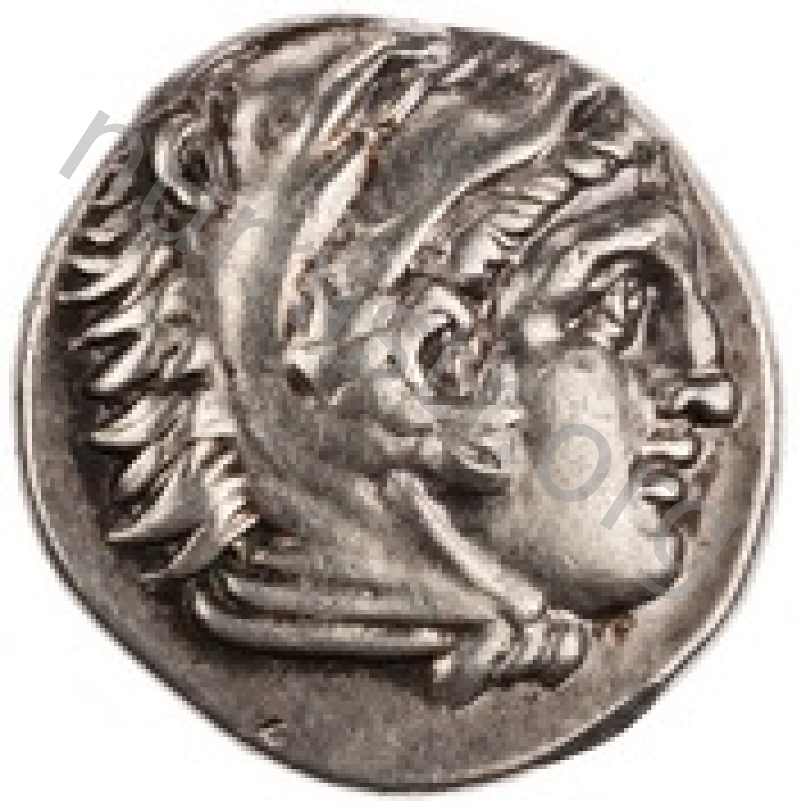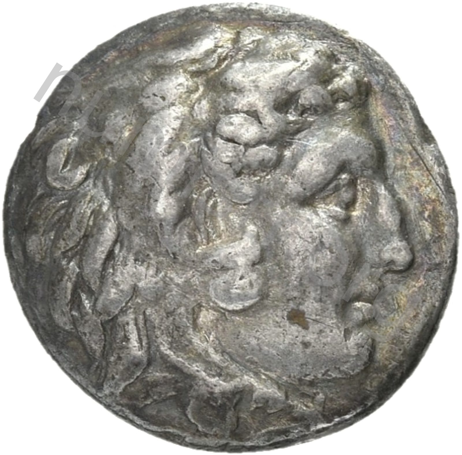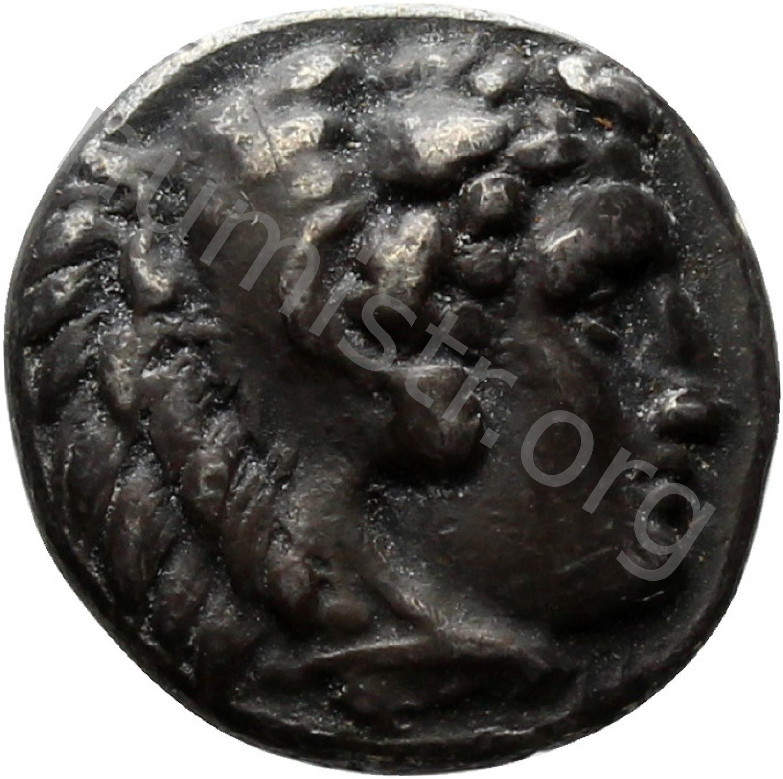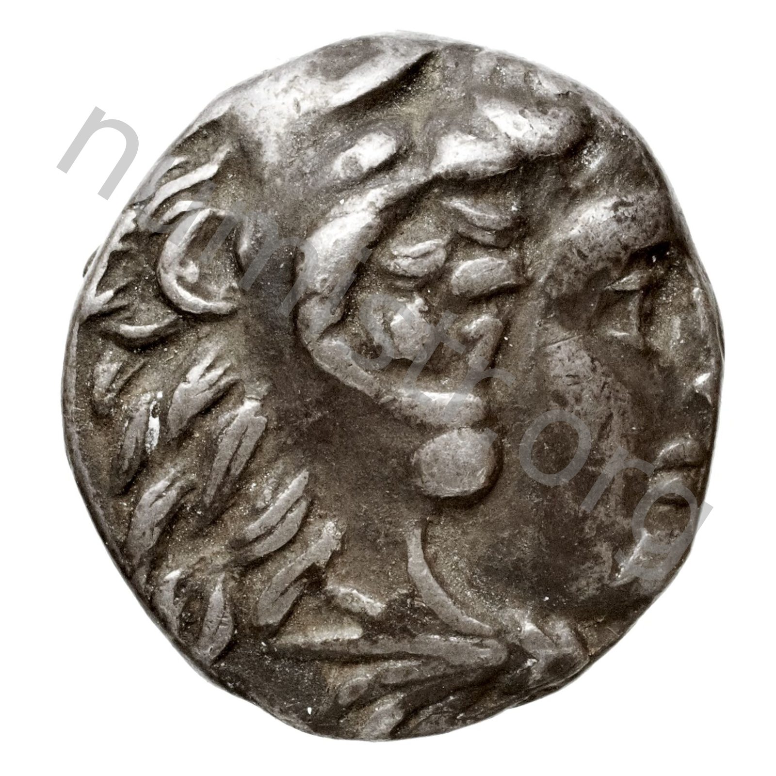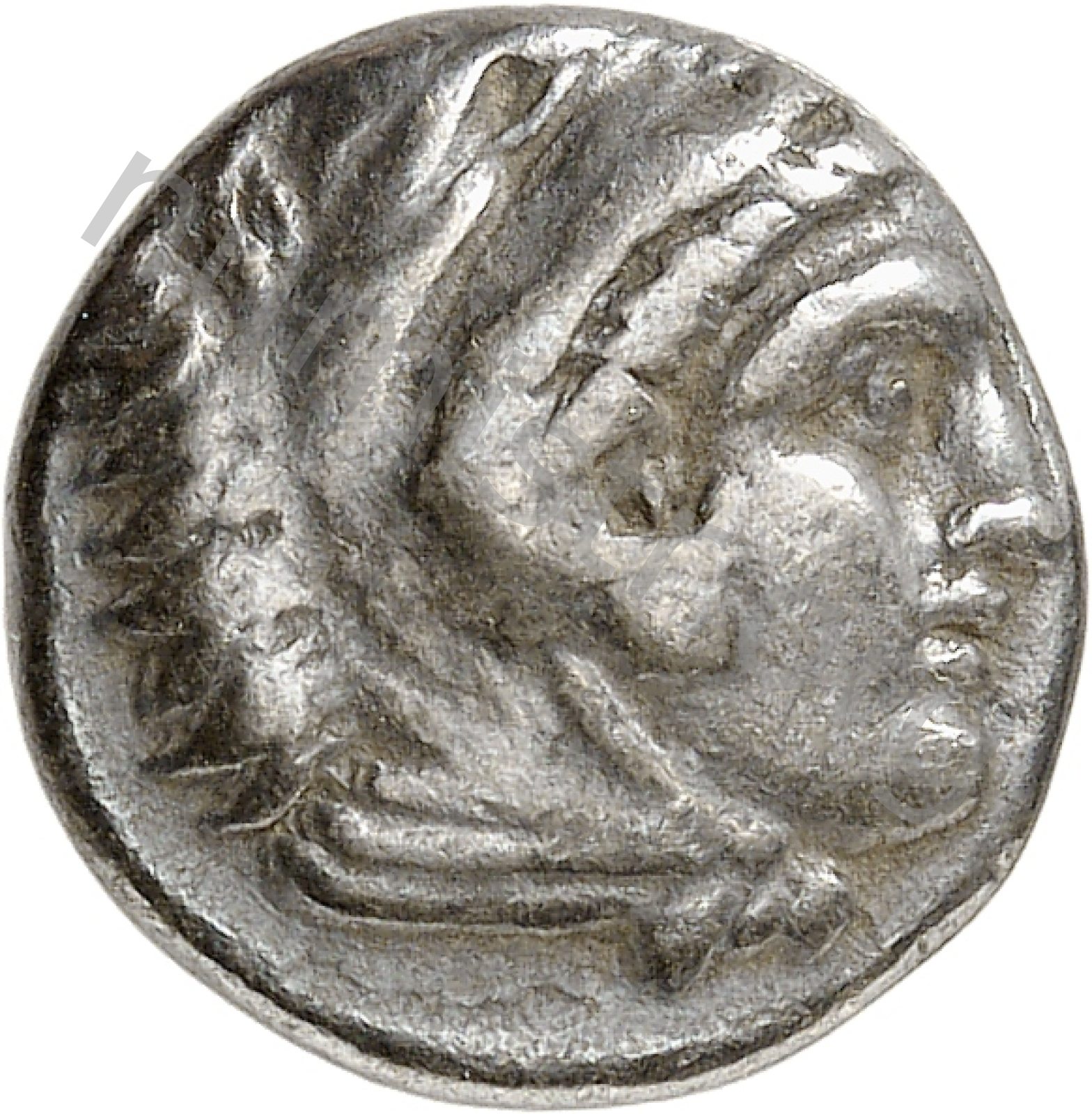 Head of beardless Heracles right wearing lion skin headdress -[en]