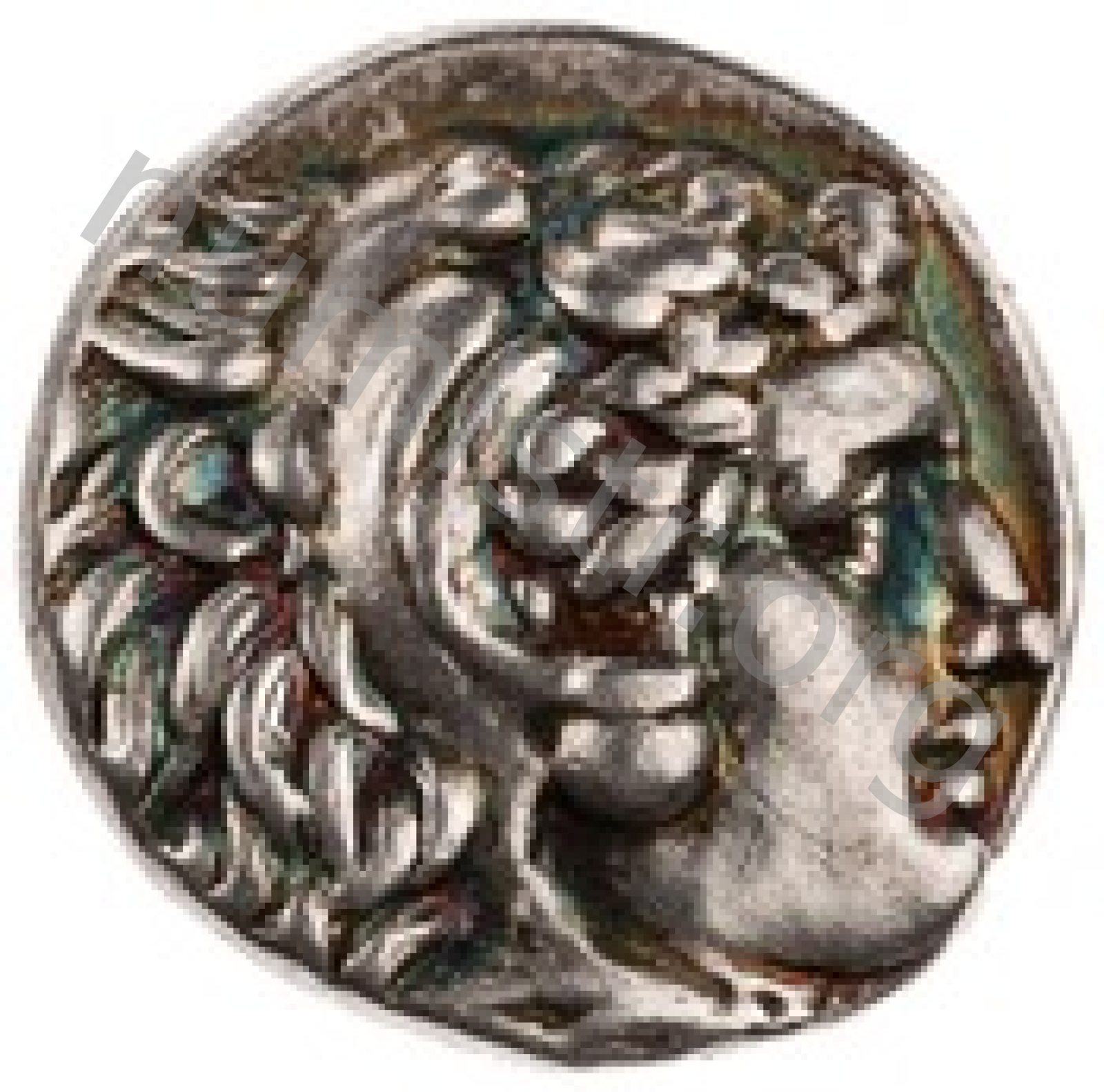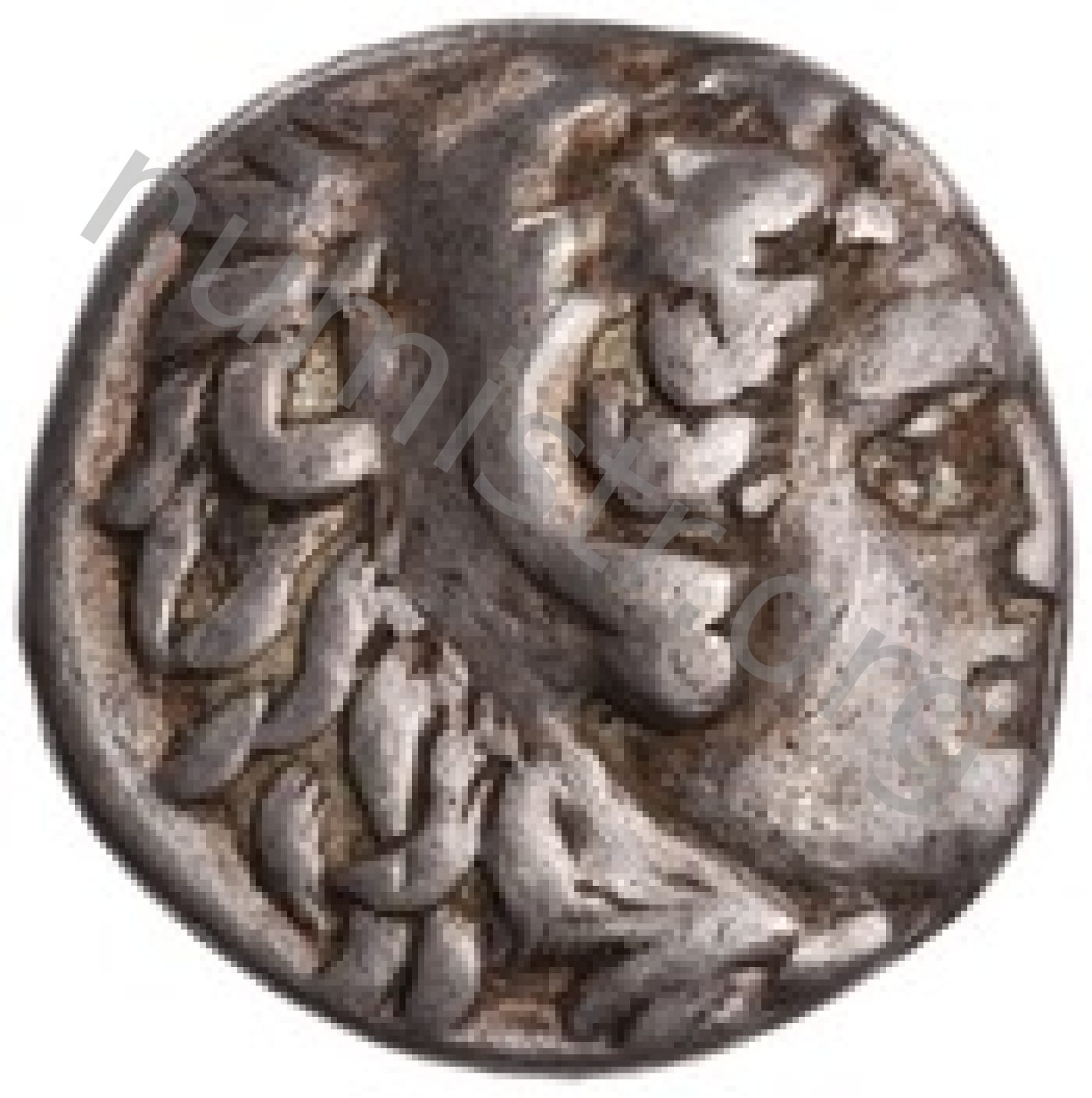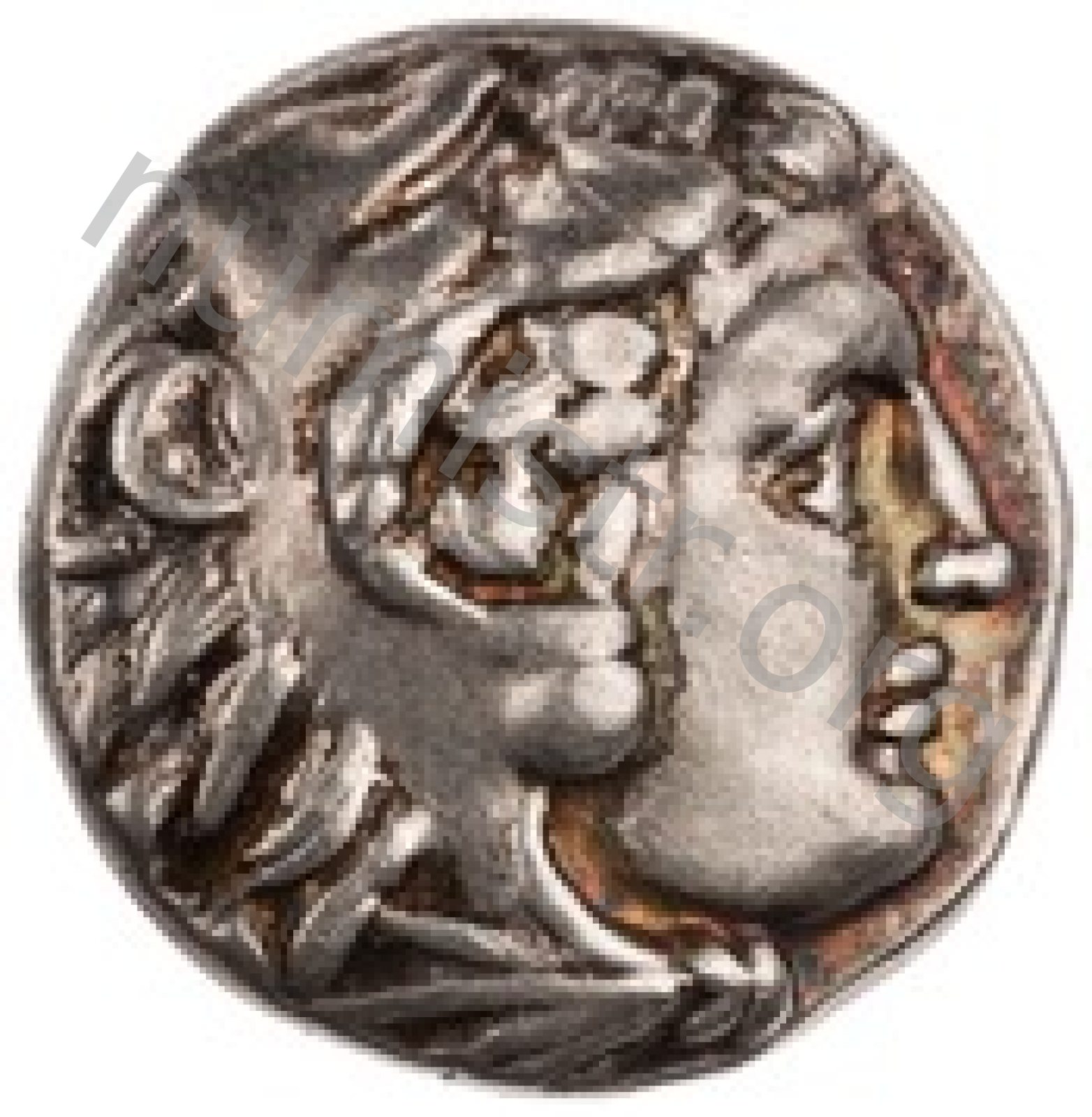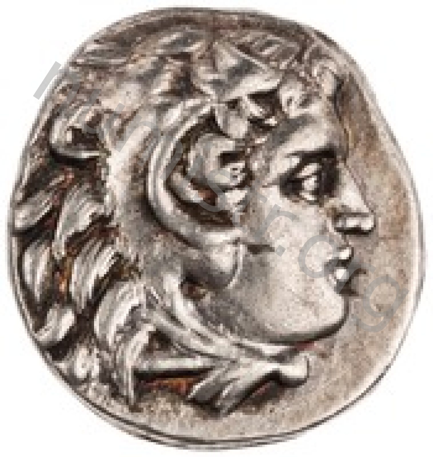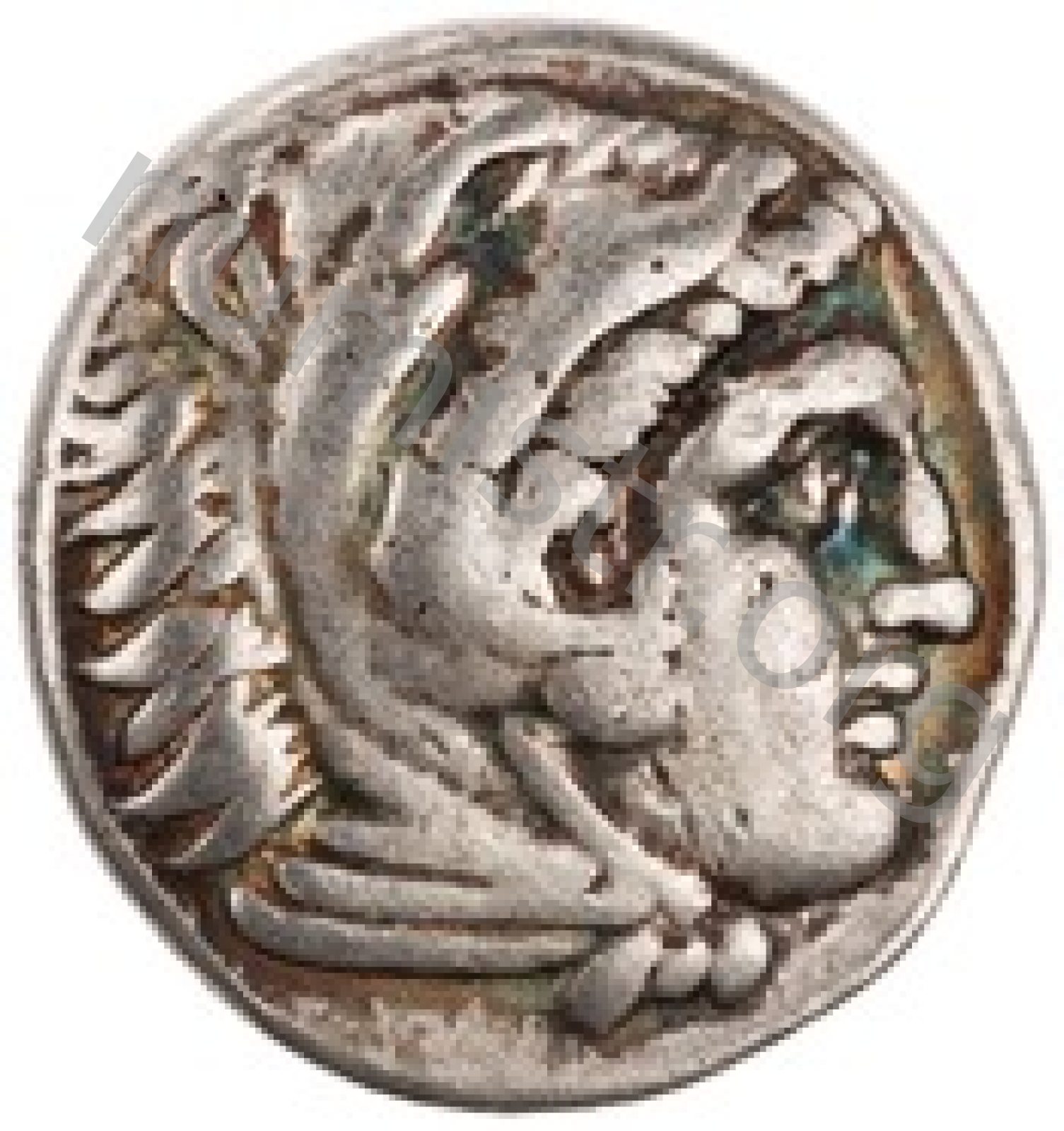 Head of beardless Heracles right wearing lion skin headdress -[en]