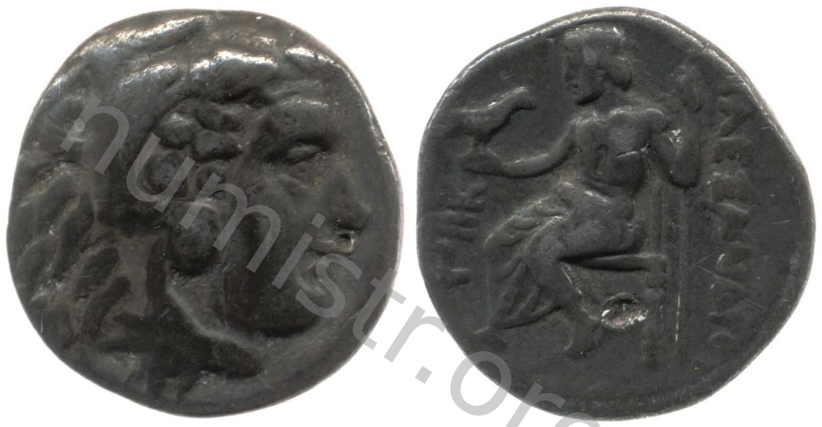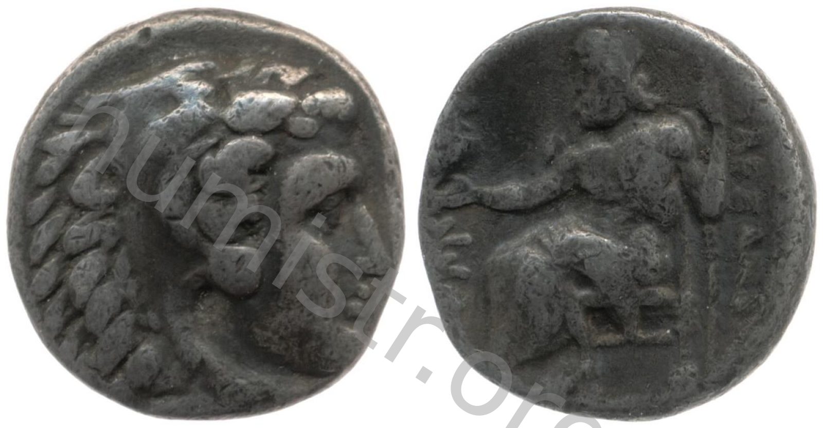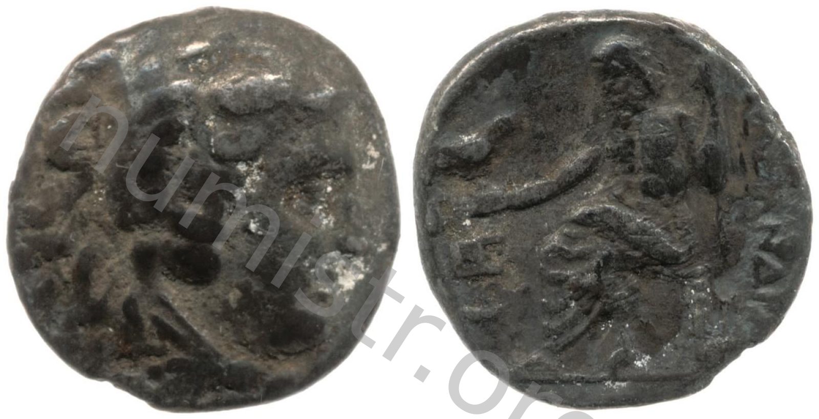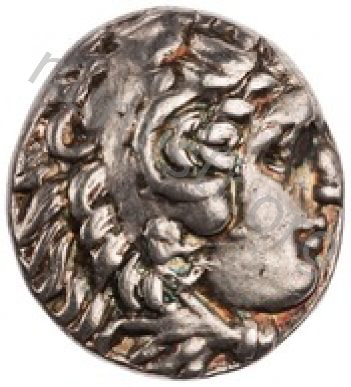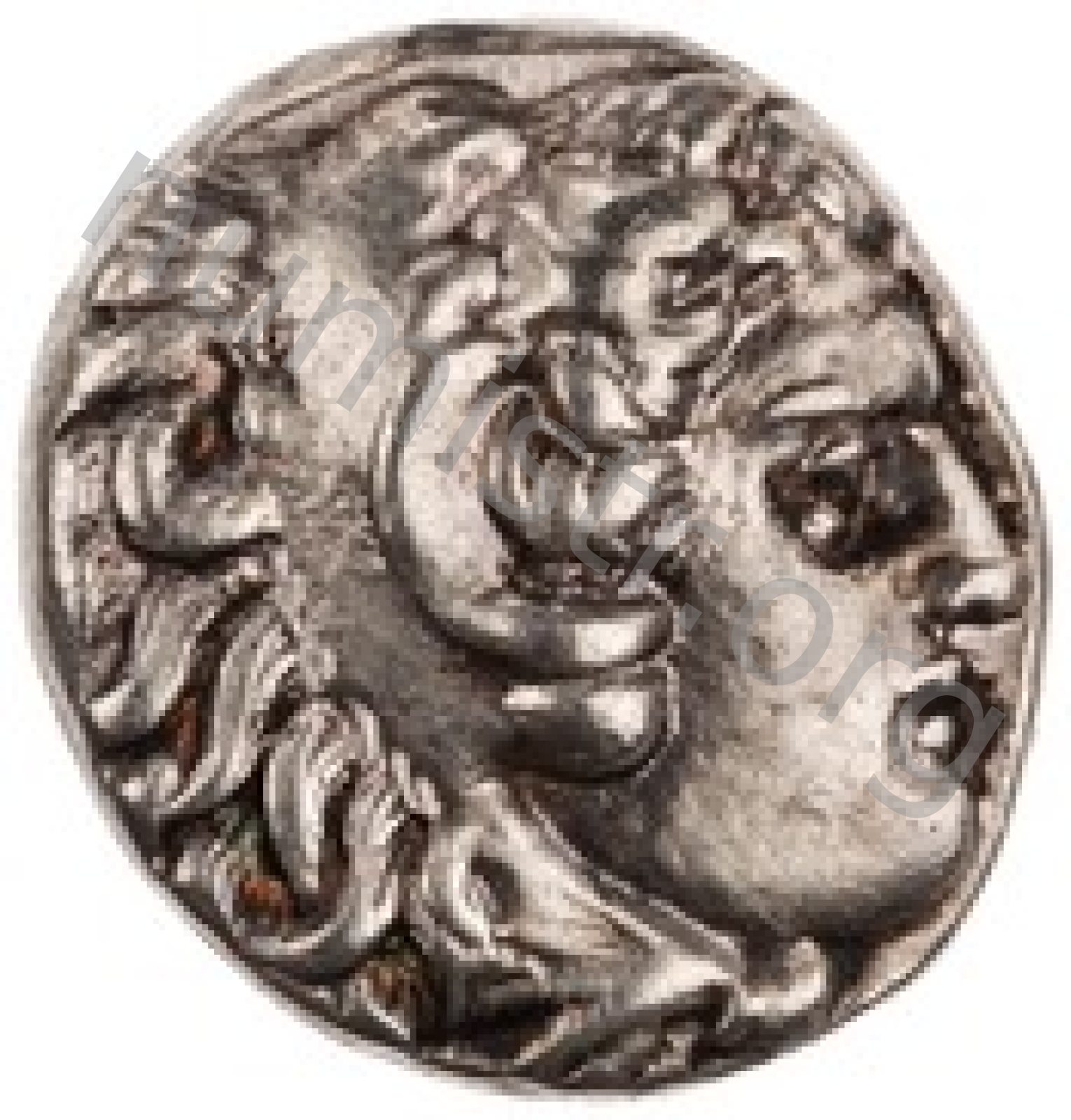 Head of beardless Heracles right wearing lion skin headdress -[en]