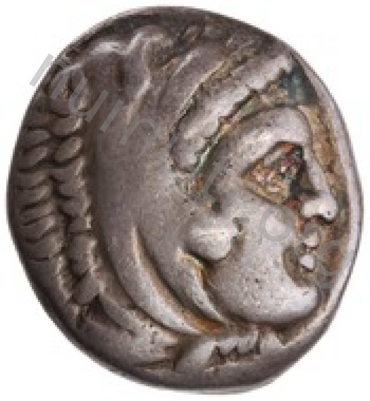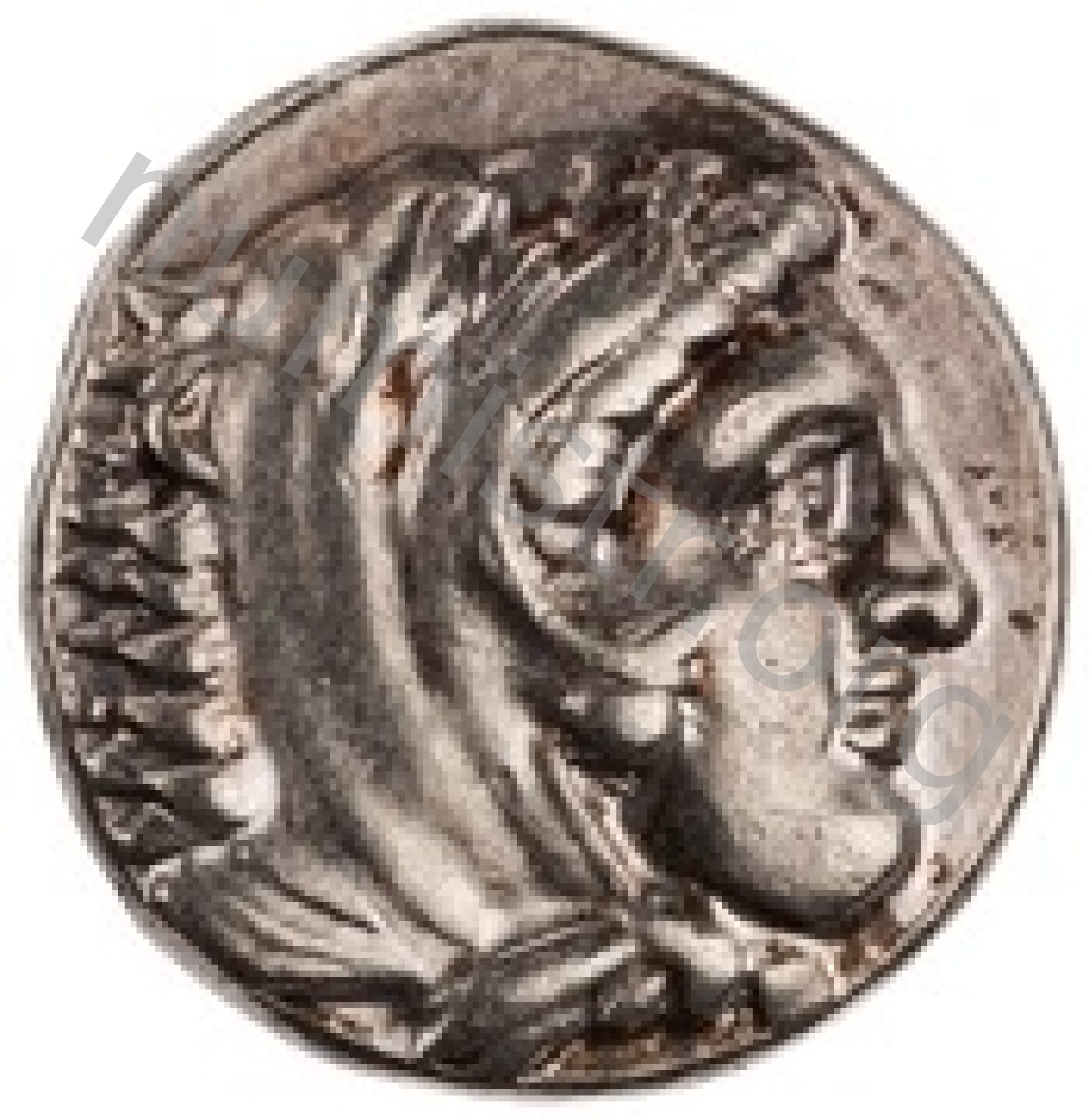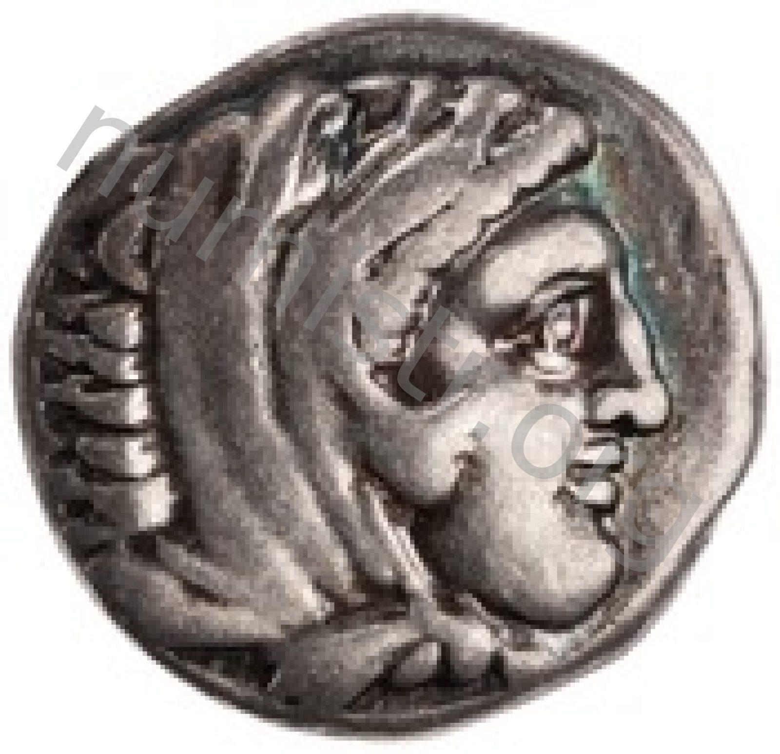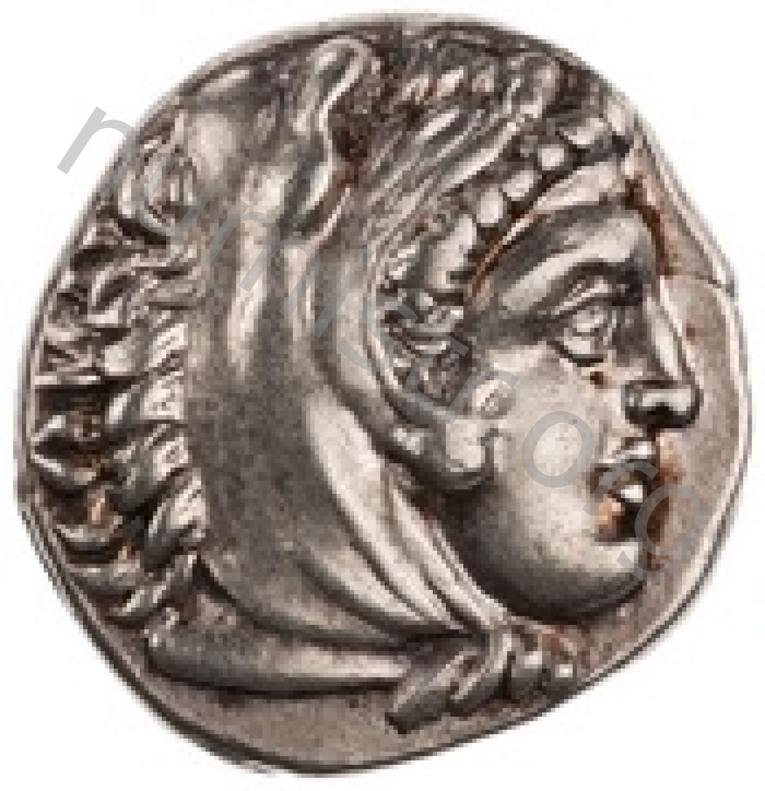 Head of beardless Heracles right wearing lion skin headdress -[en]