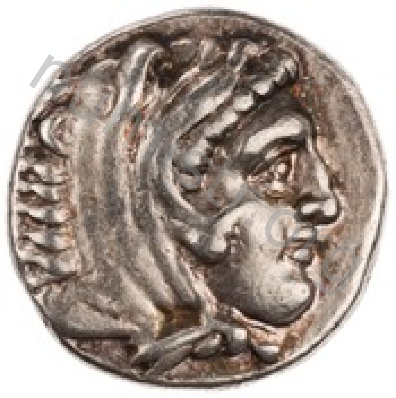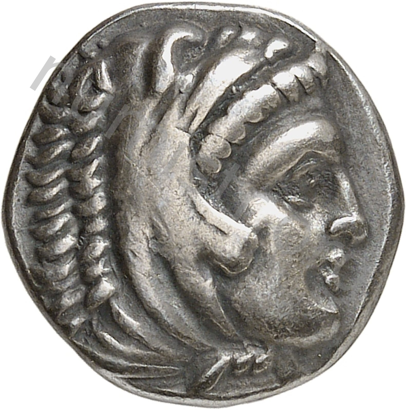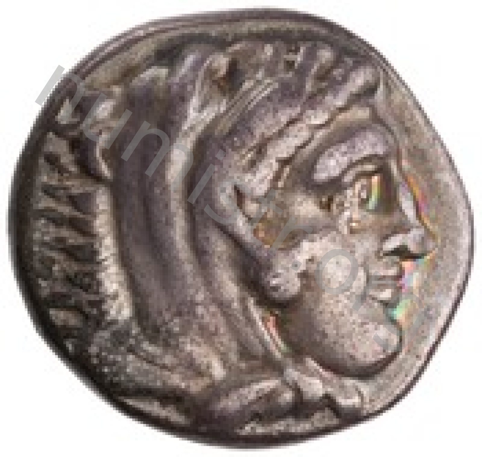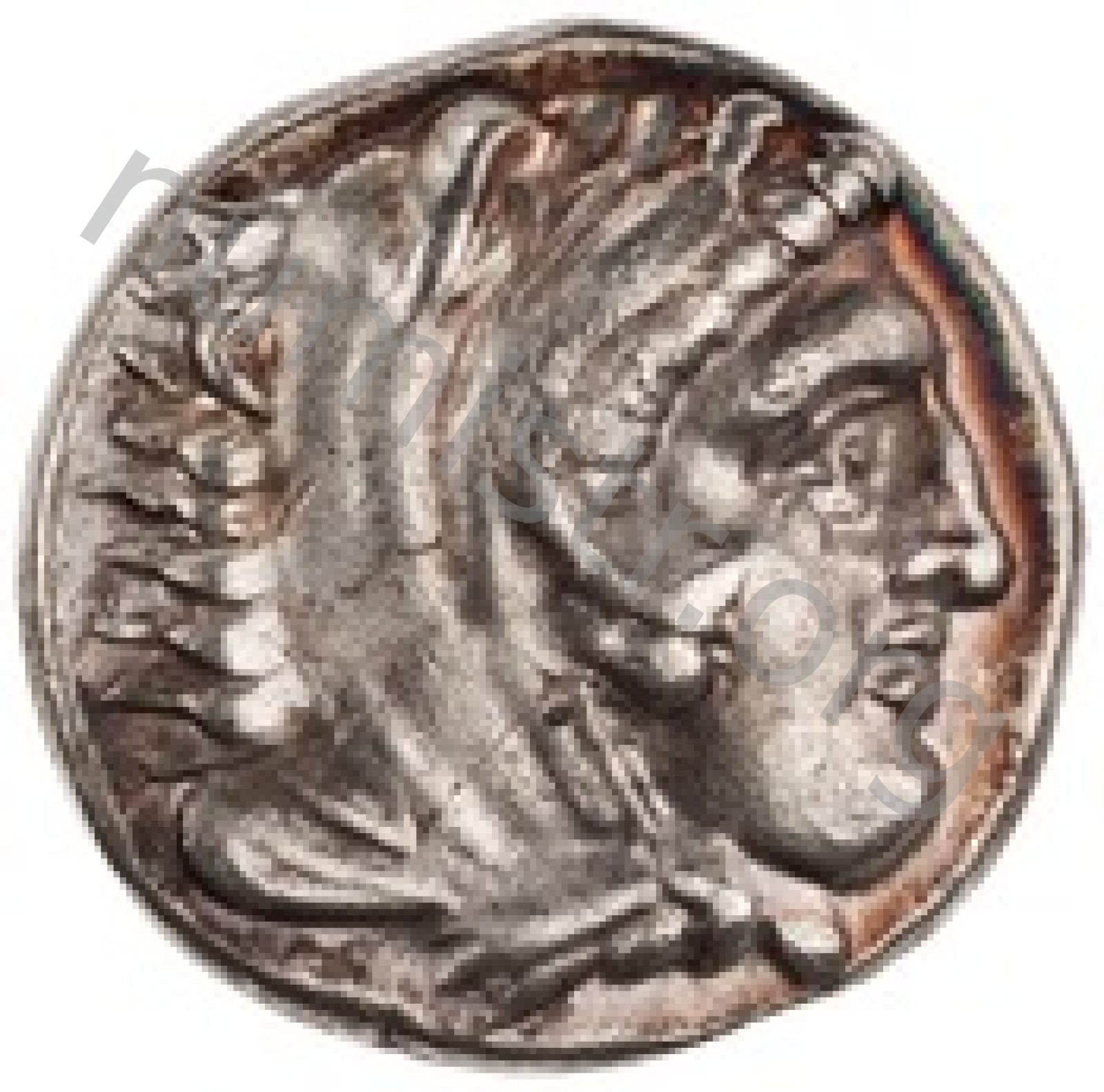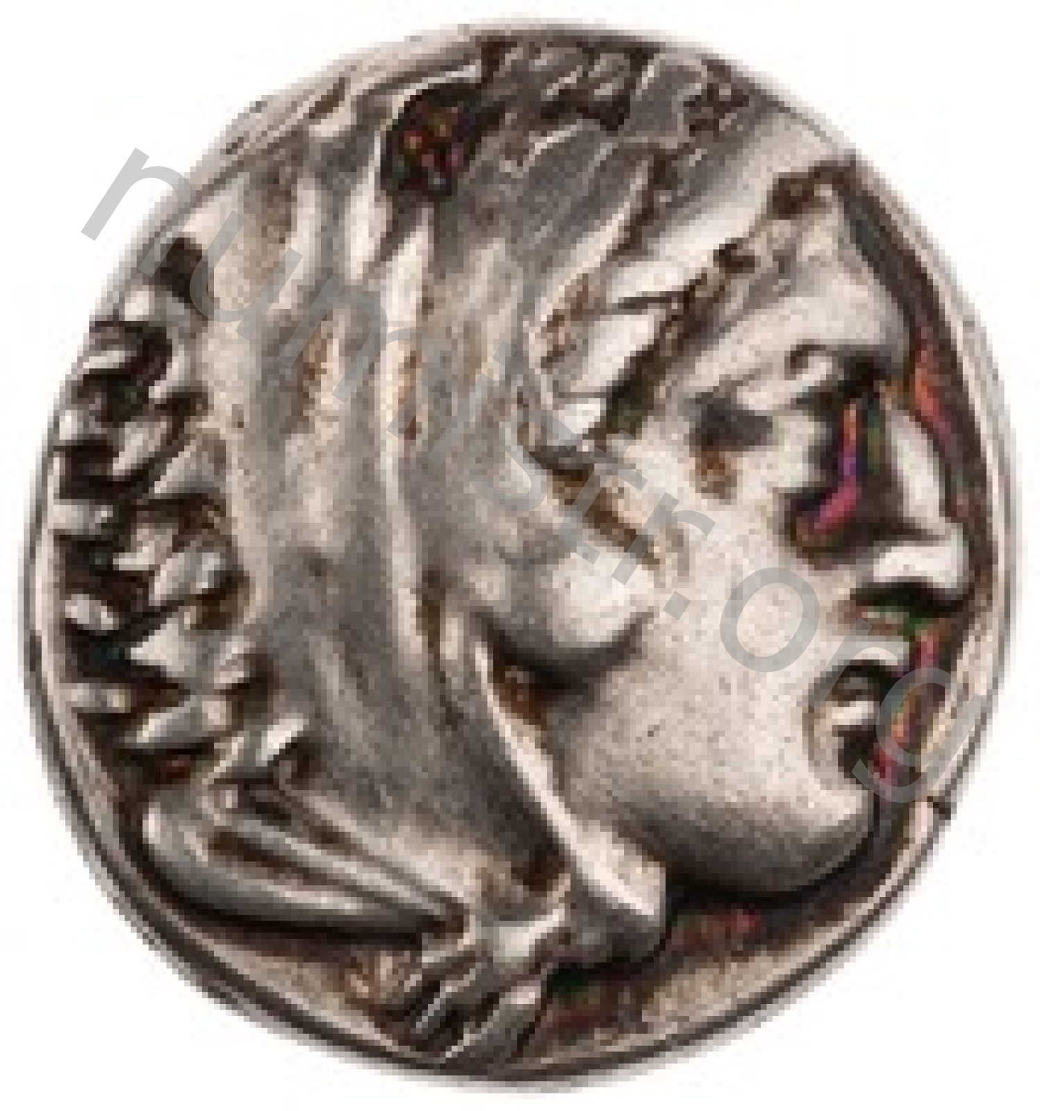 Head of beardless Heracles right wearing lion skin headdress -[en]