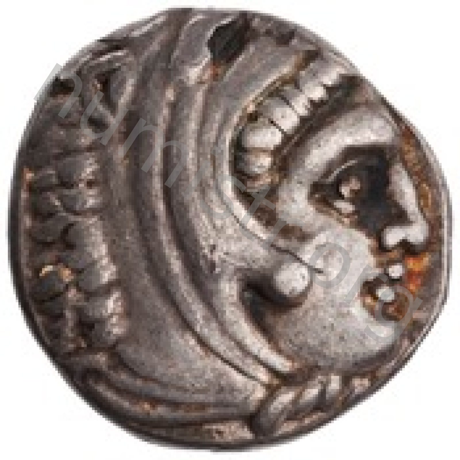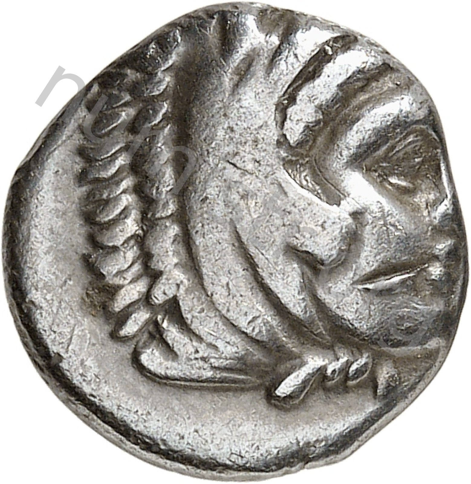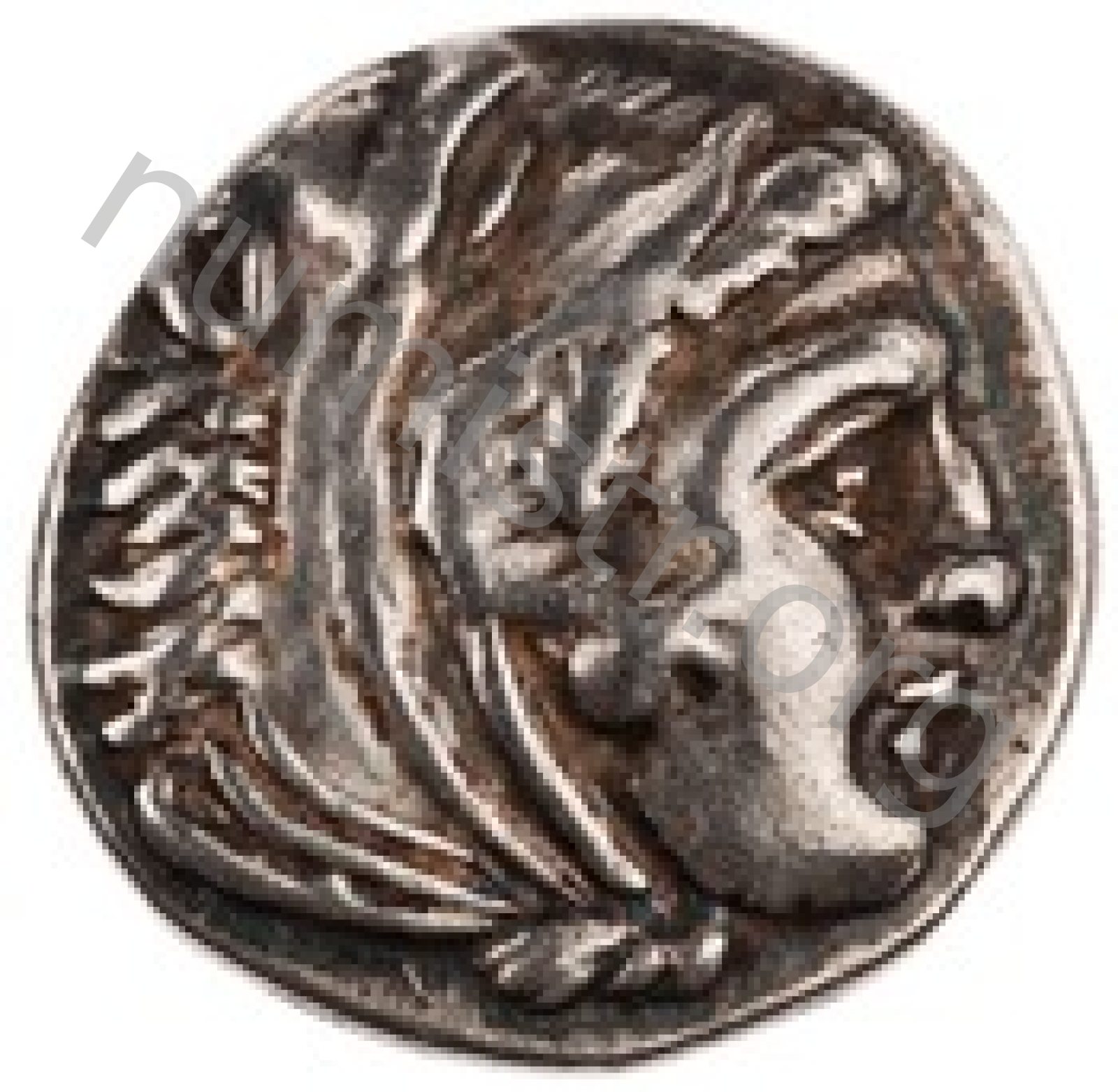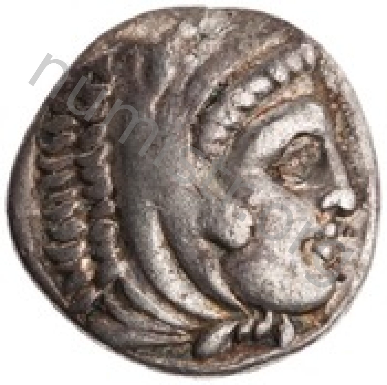 Head of beardless Heracles right wearing lion skin headdress -[en]