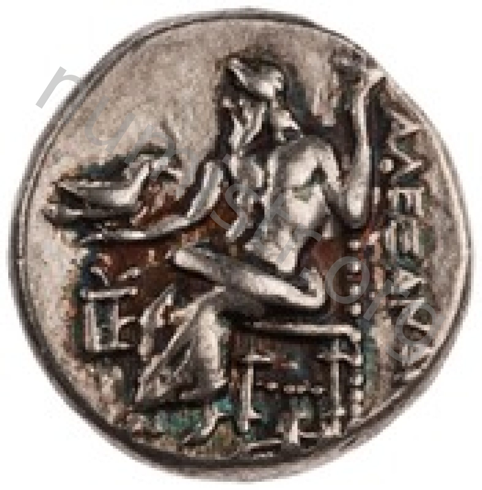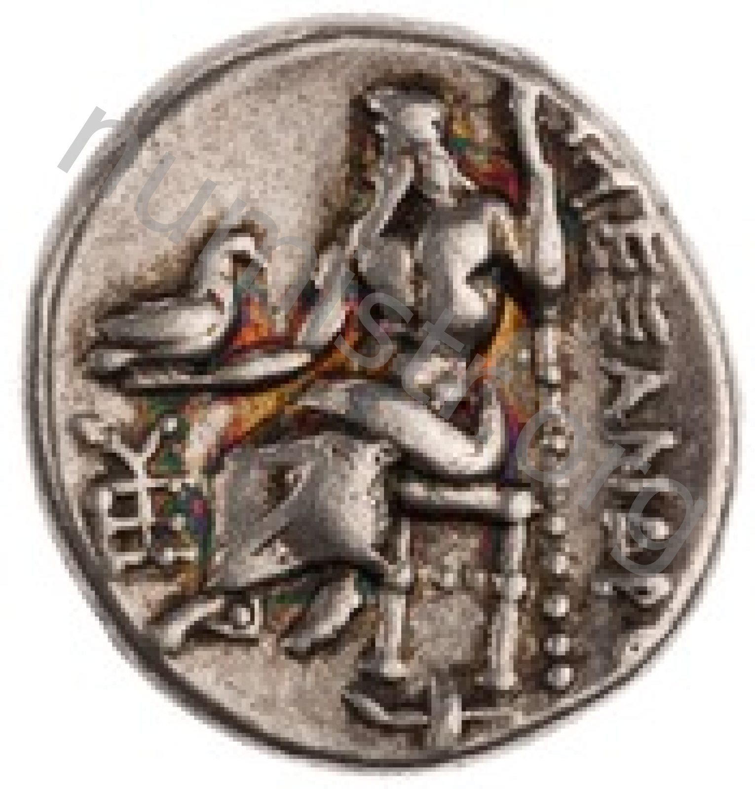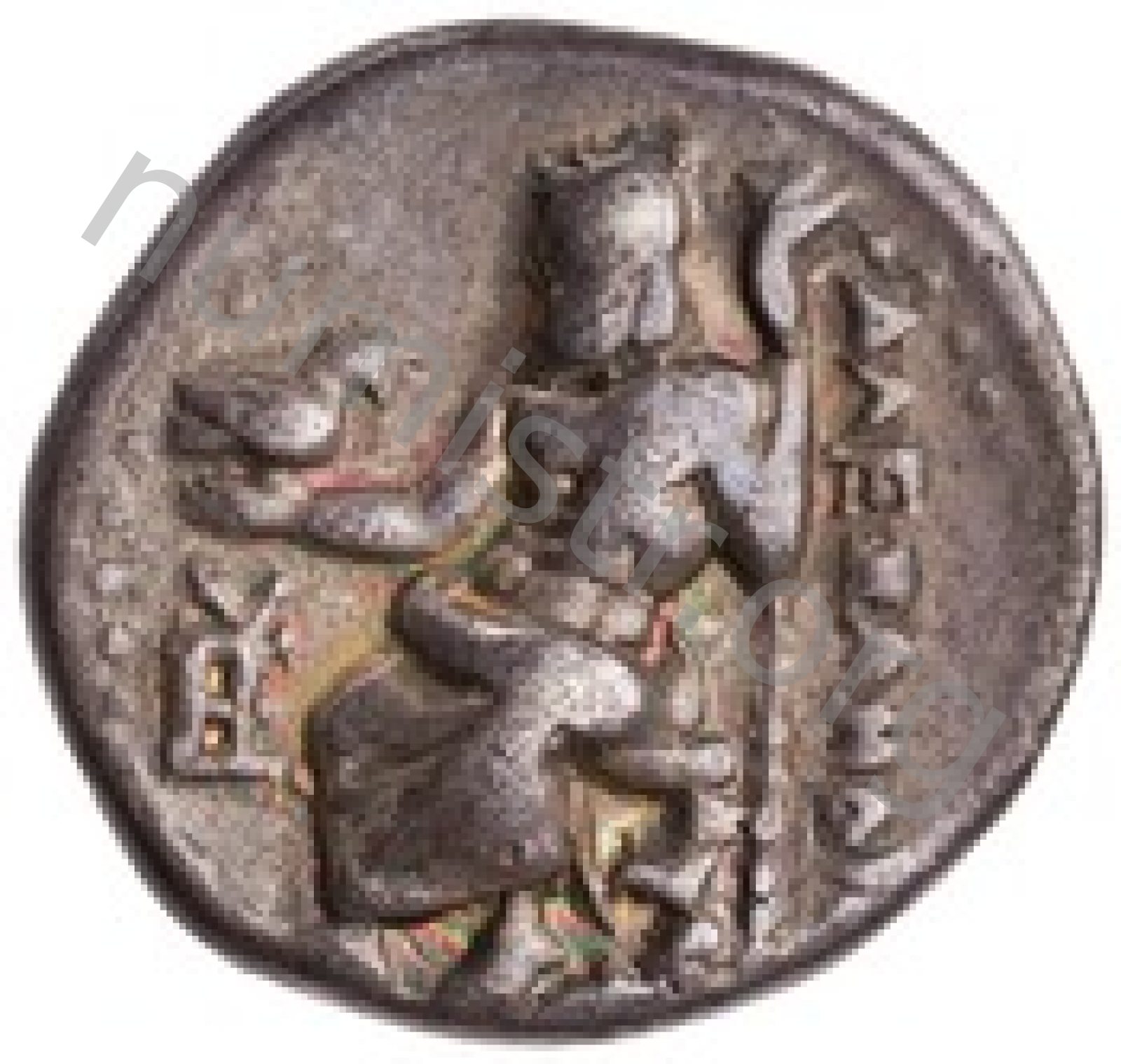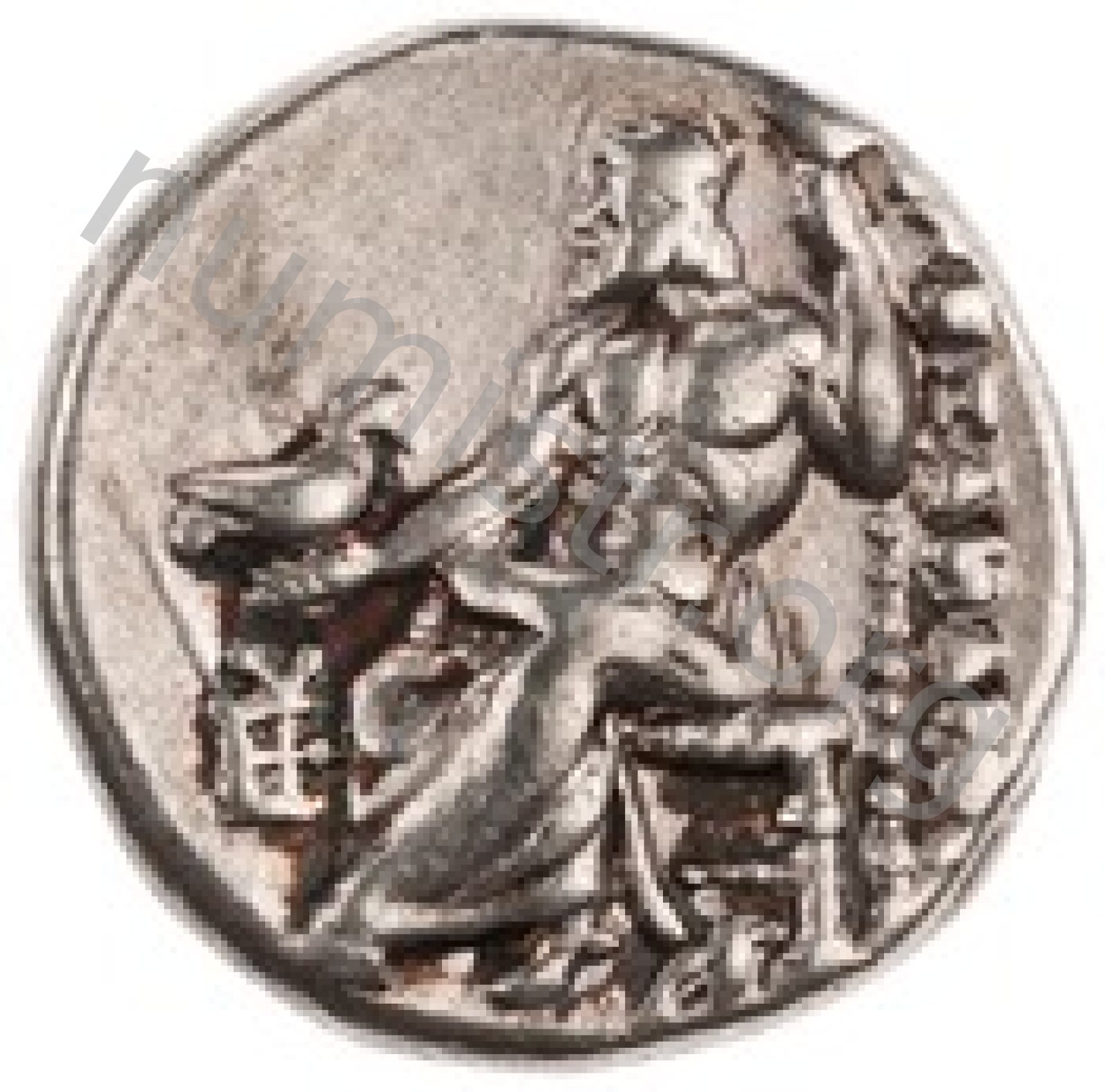 Zeus tabure-tahtta oturuyor sol elinde kartal sağ elinde asa var.