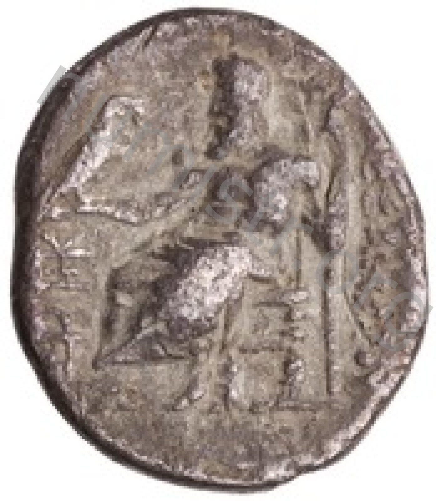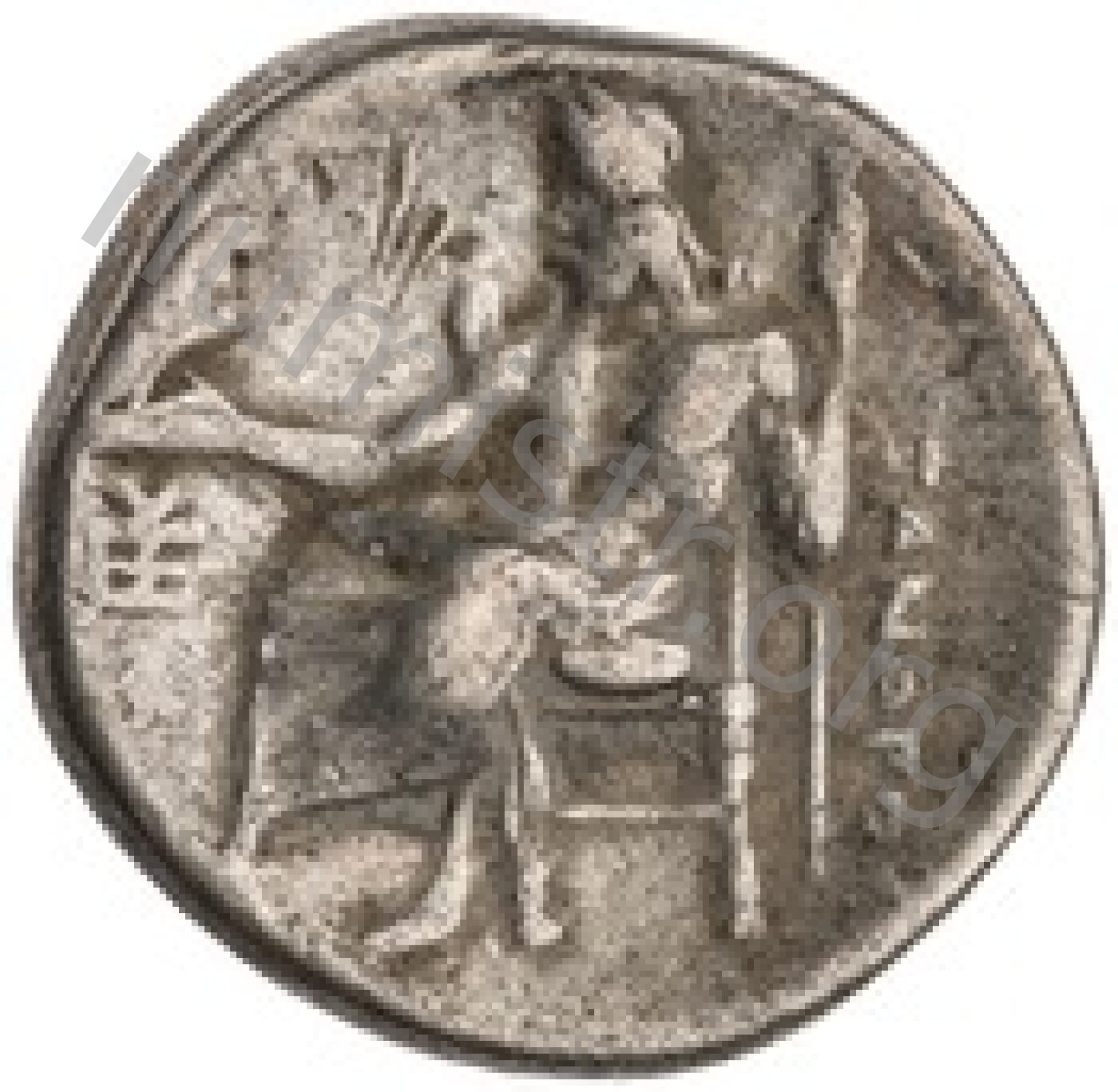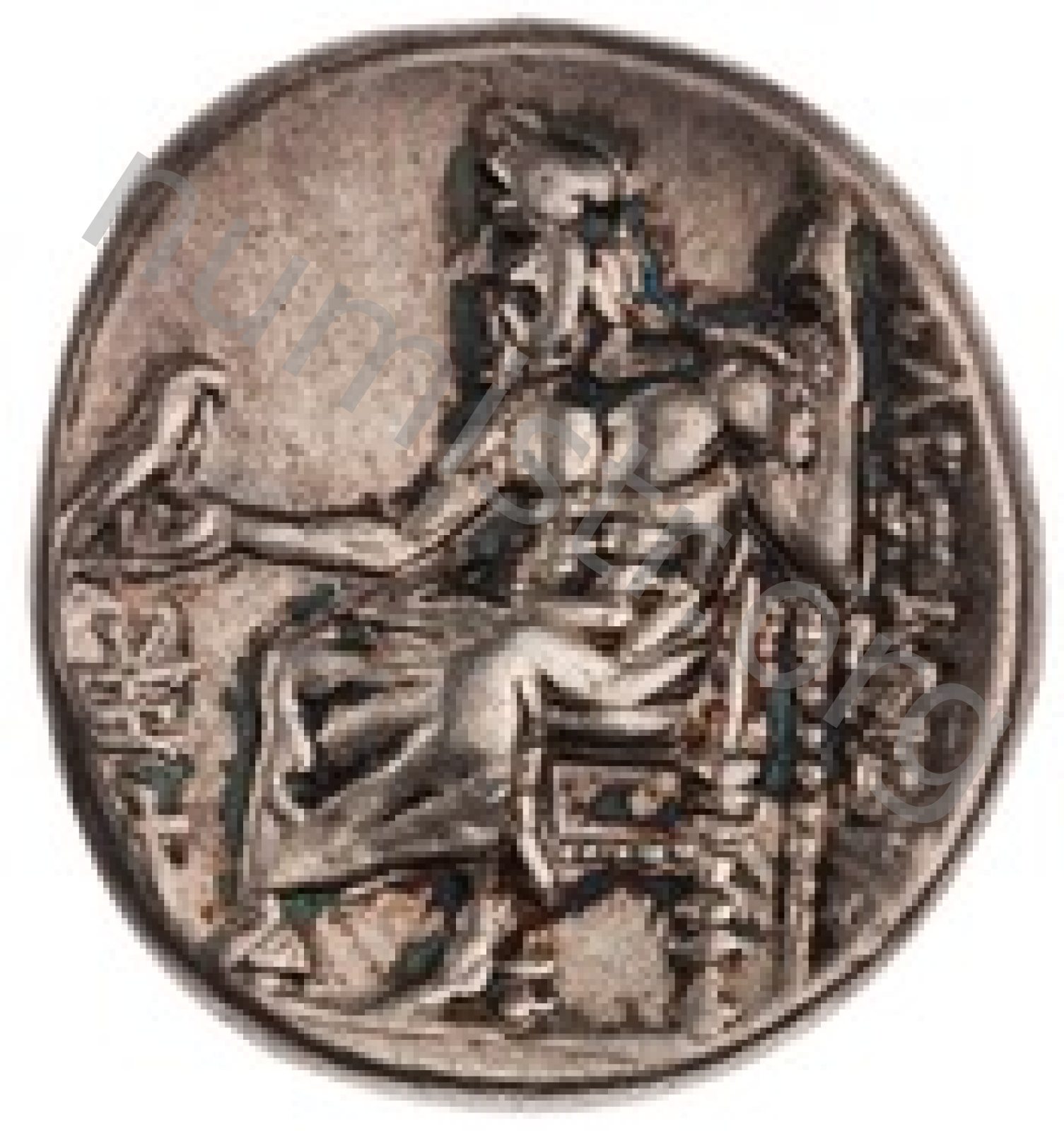 Zeus tabure-tahtta oturuyor sol elinde kartal sağ elinde asa var.
