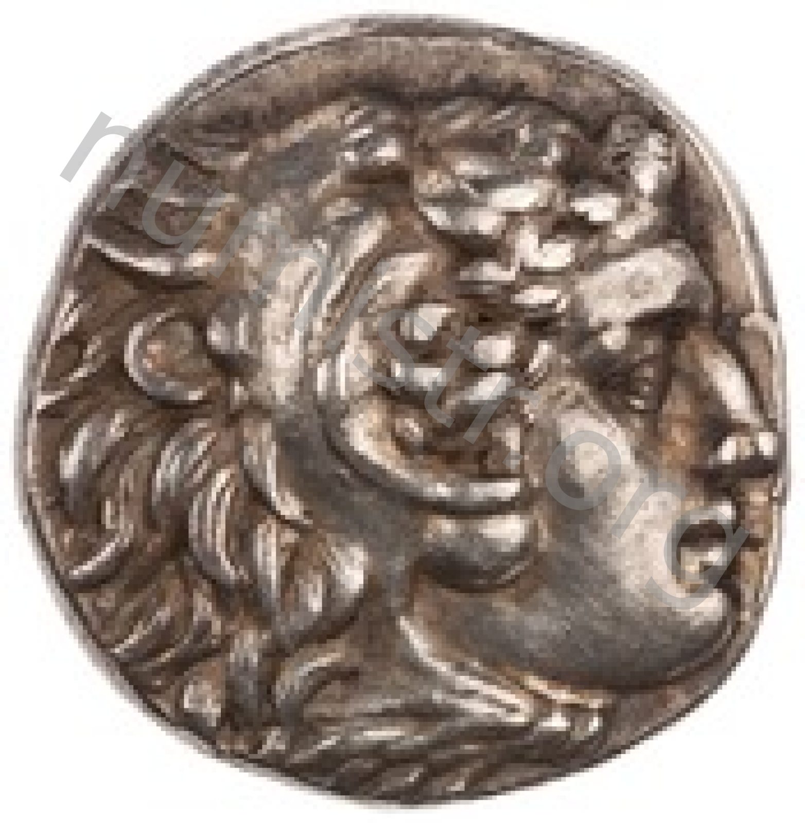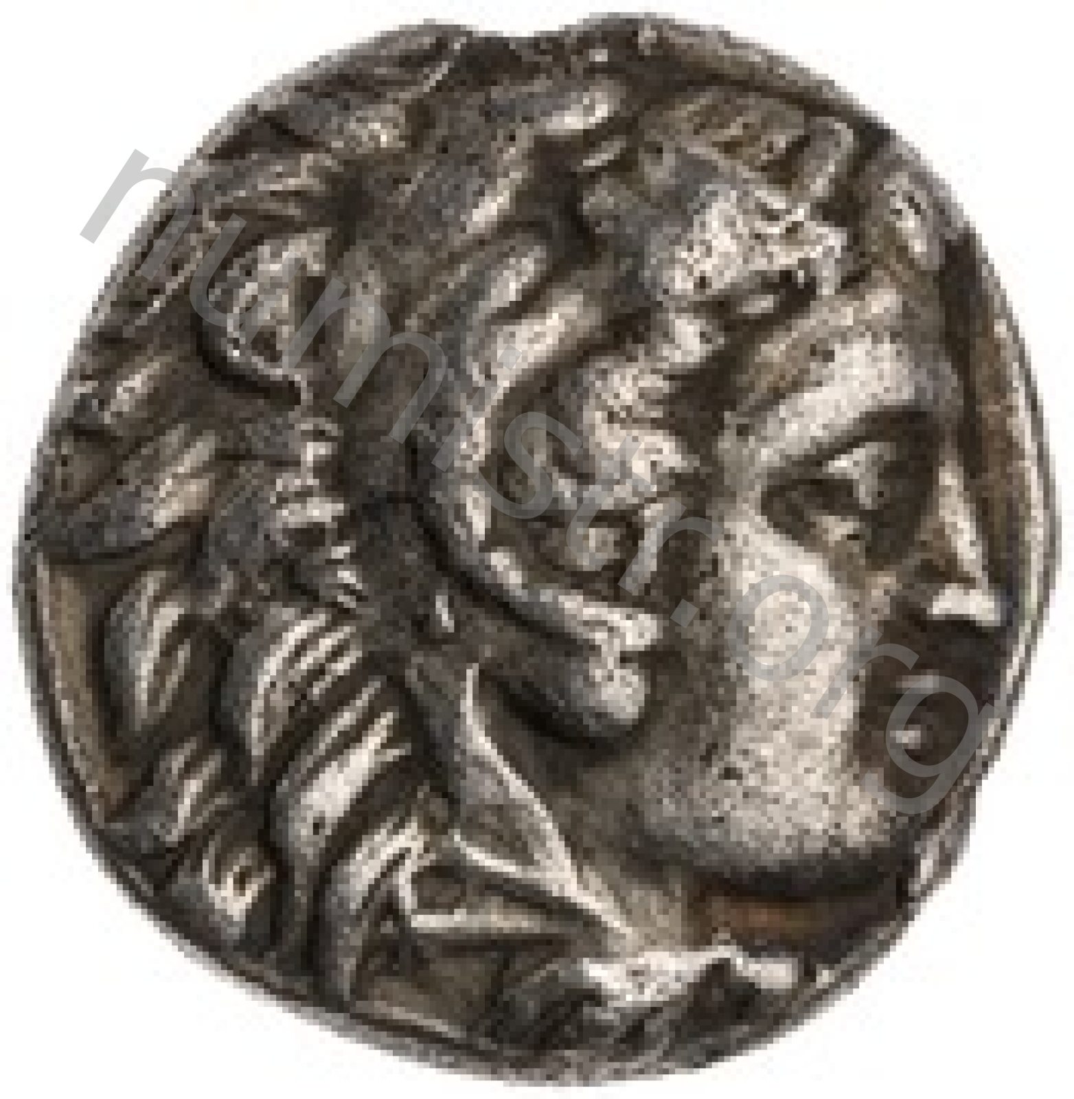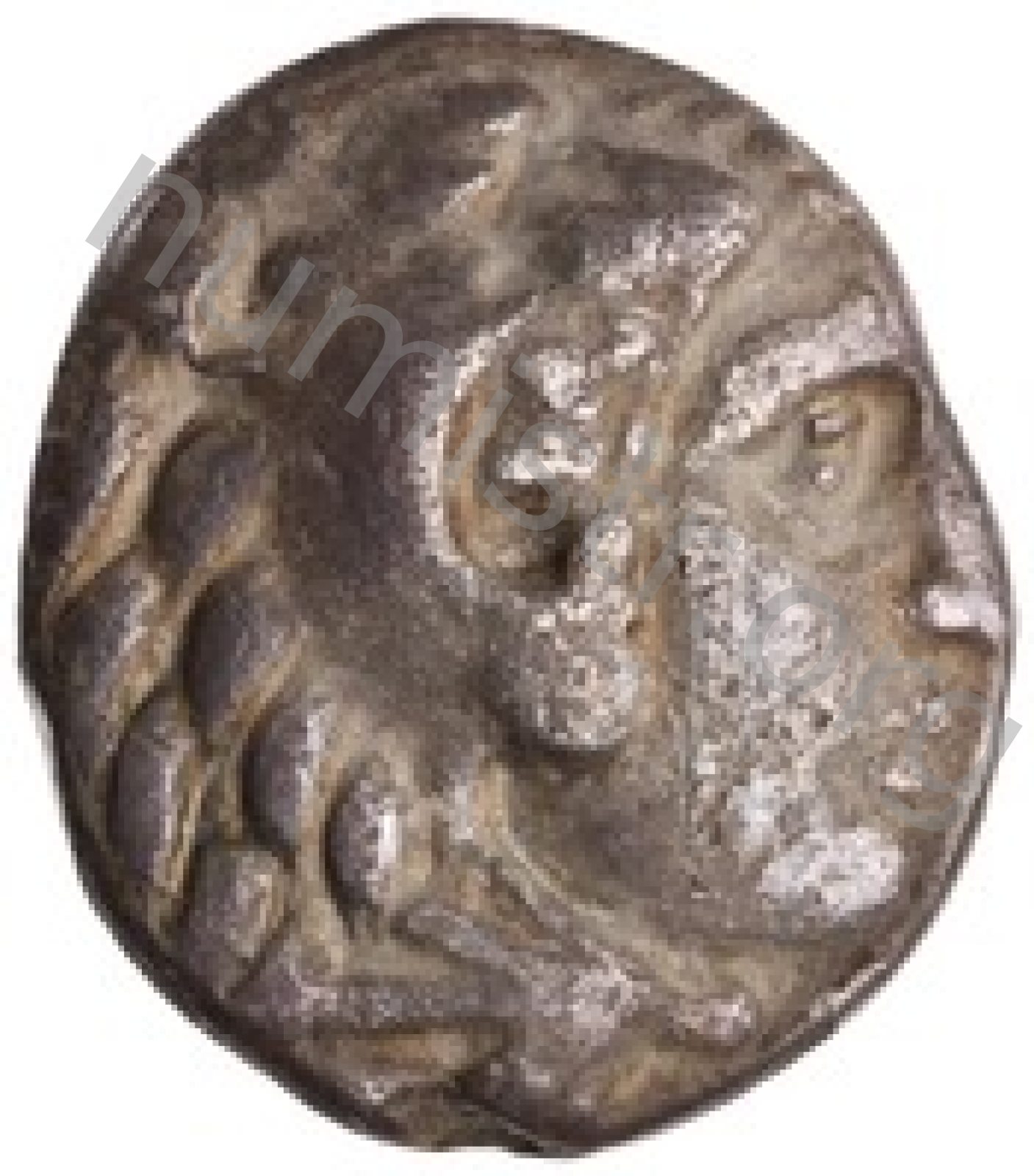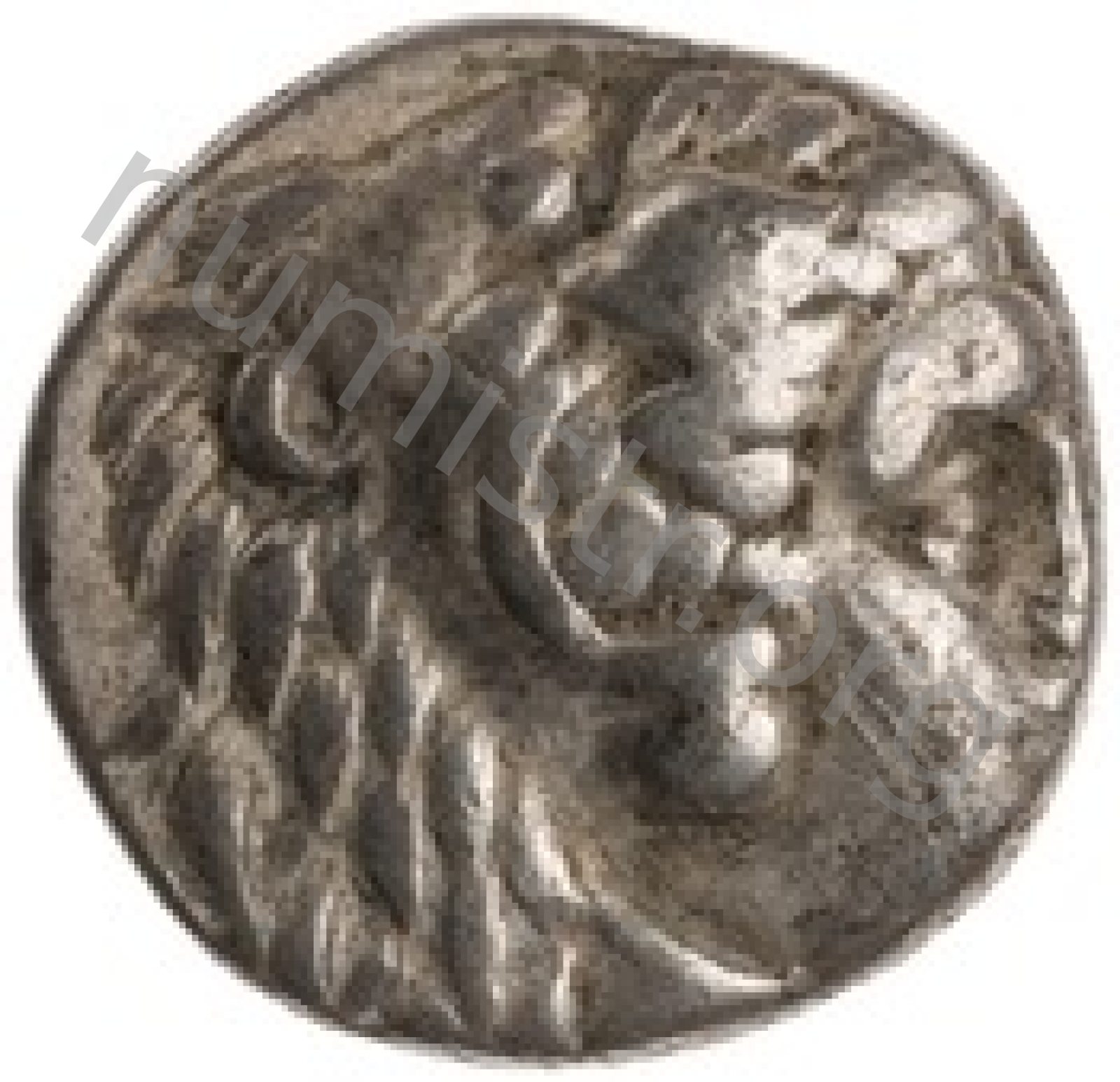 Head of beardless Heracles right wearing lion skin headdress -[en]