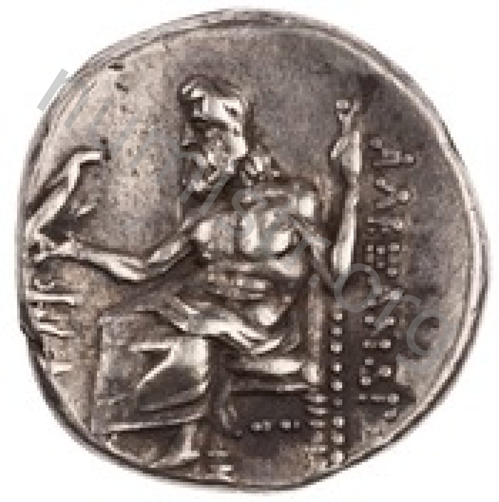 Zeus seated on stool-throne left eagle on outstretched right hand sceptre in left hand -[en]