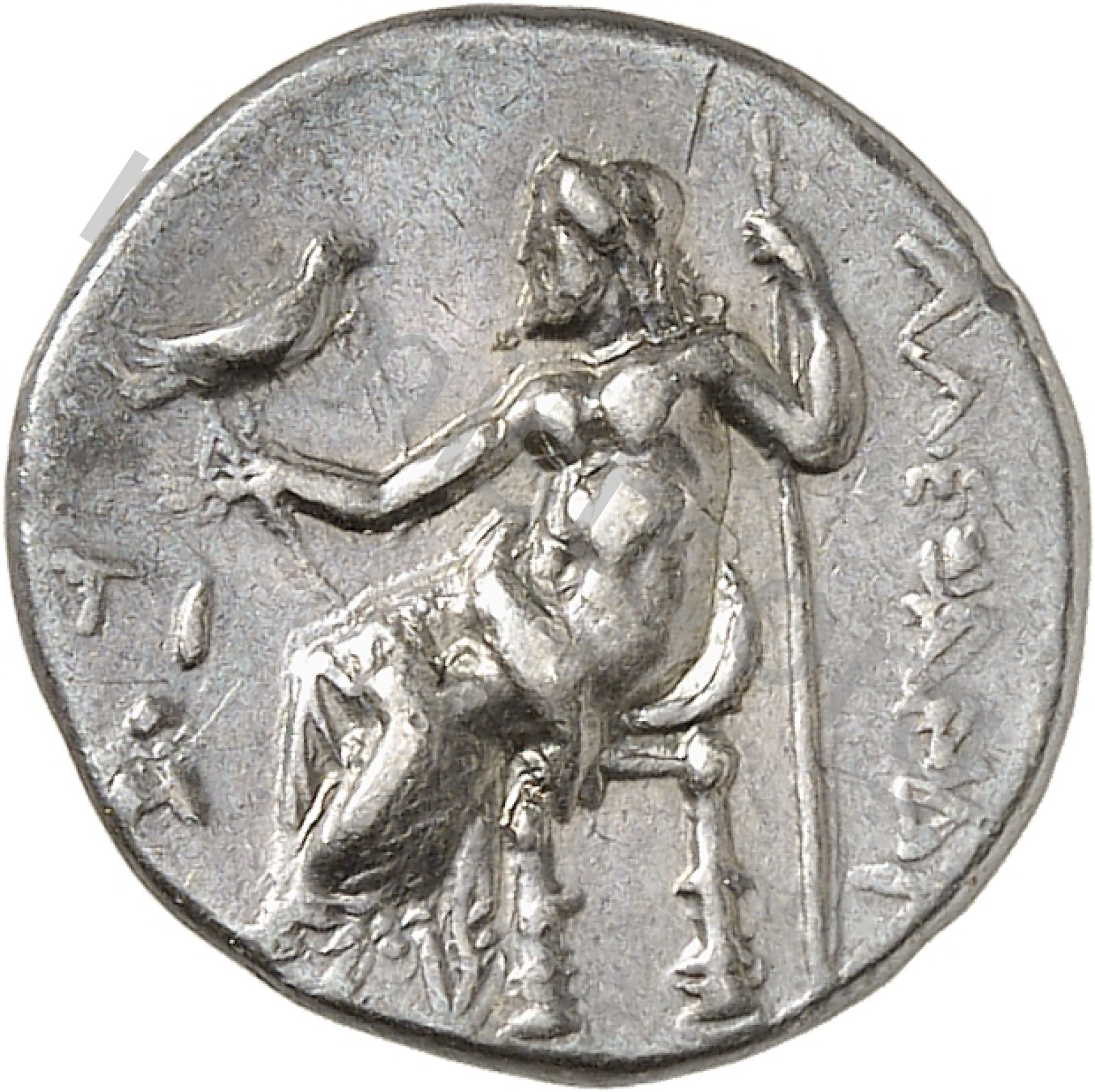 Zeus seated on stool-throne left eagle on outstretched right hand sceptre in left hand -[en]