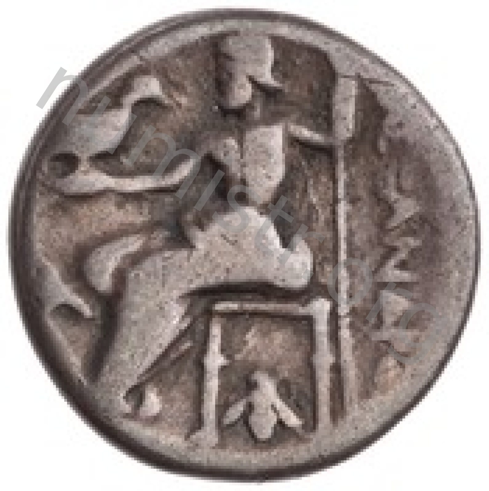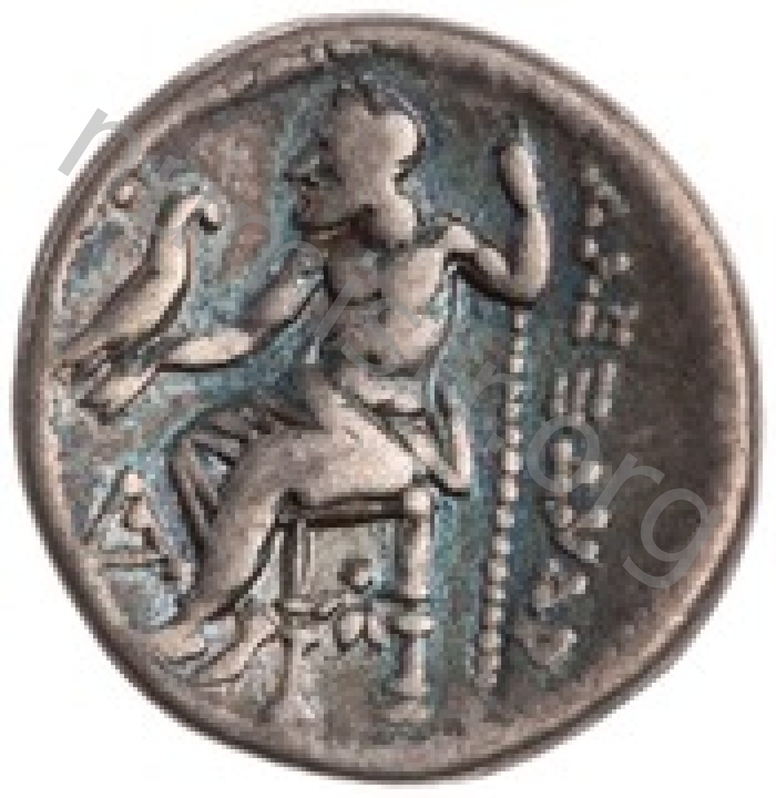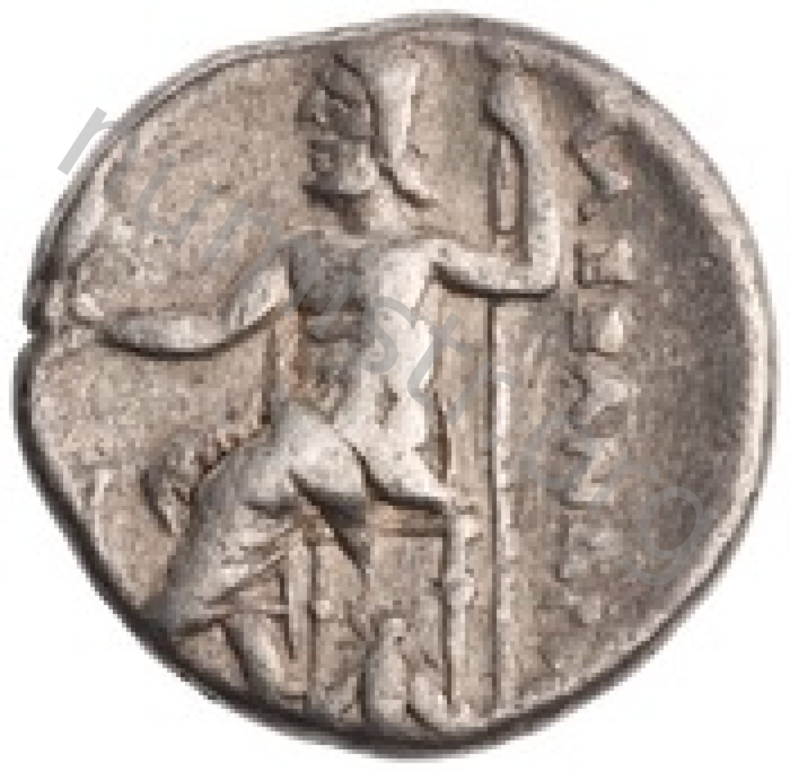 Zeus tabure-tahtta oturuyor sol elinde kartal sağ elinde asa var.