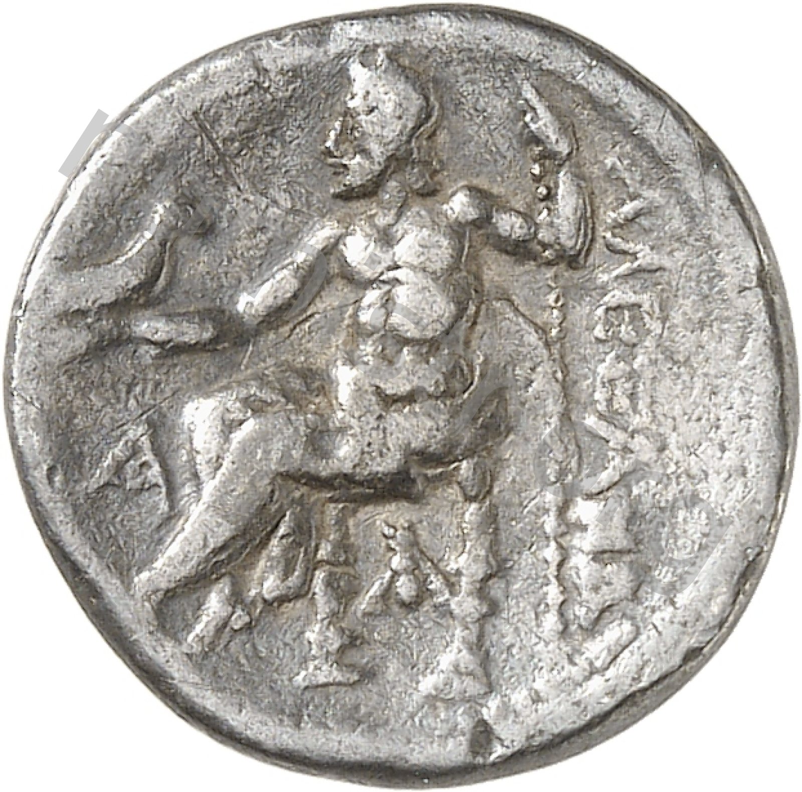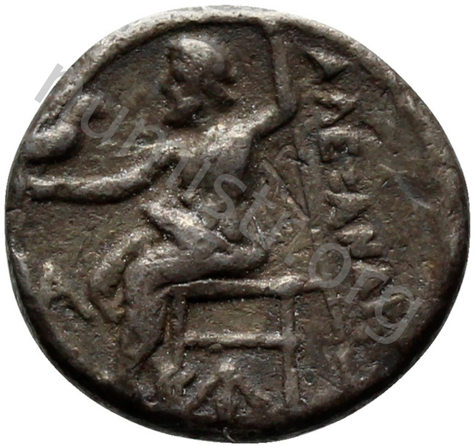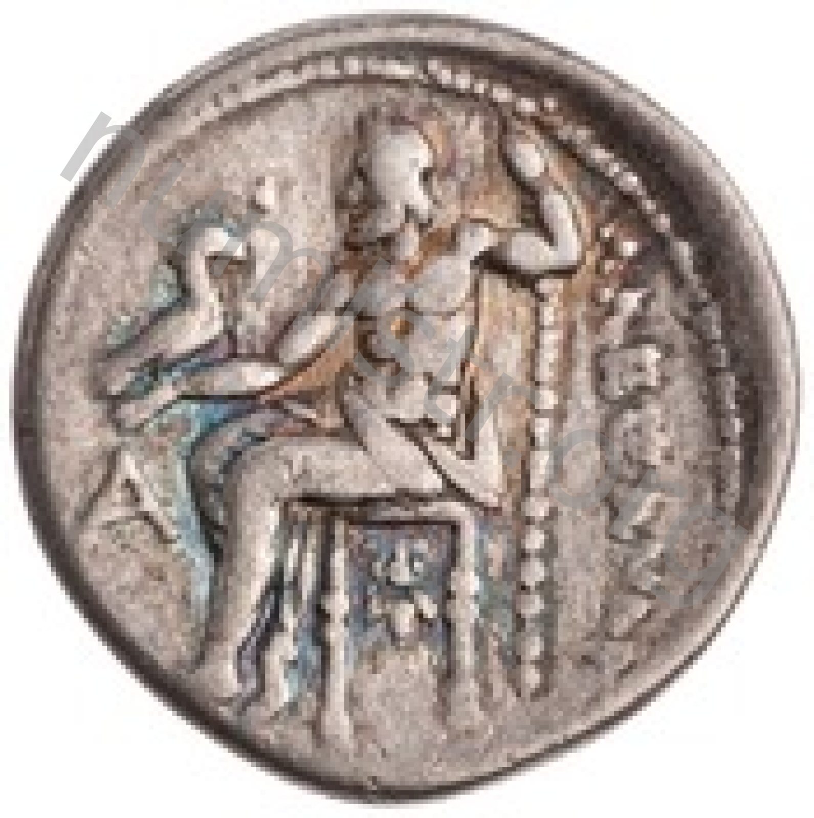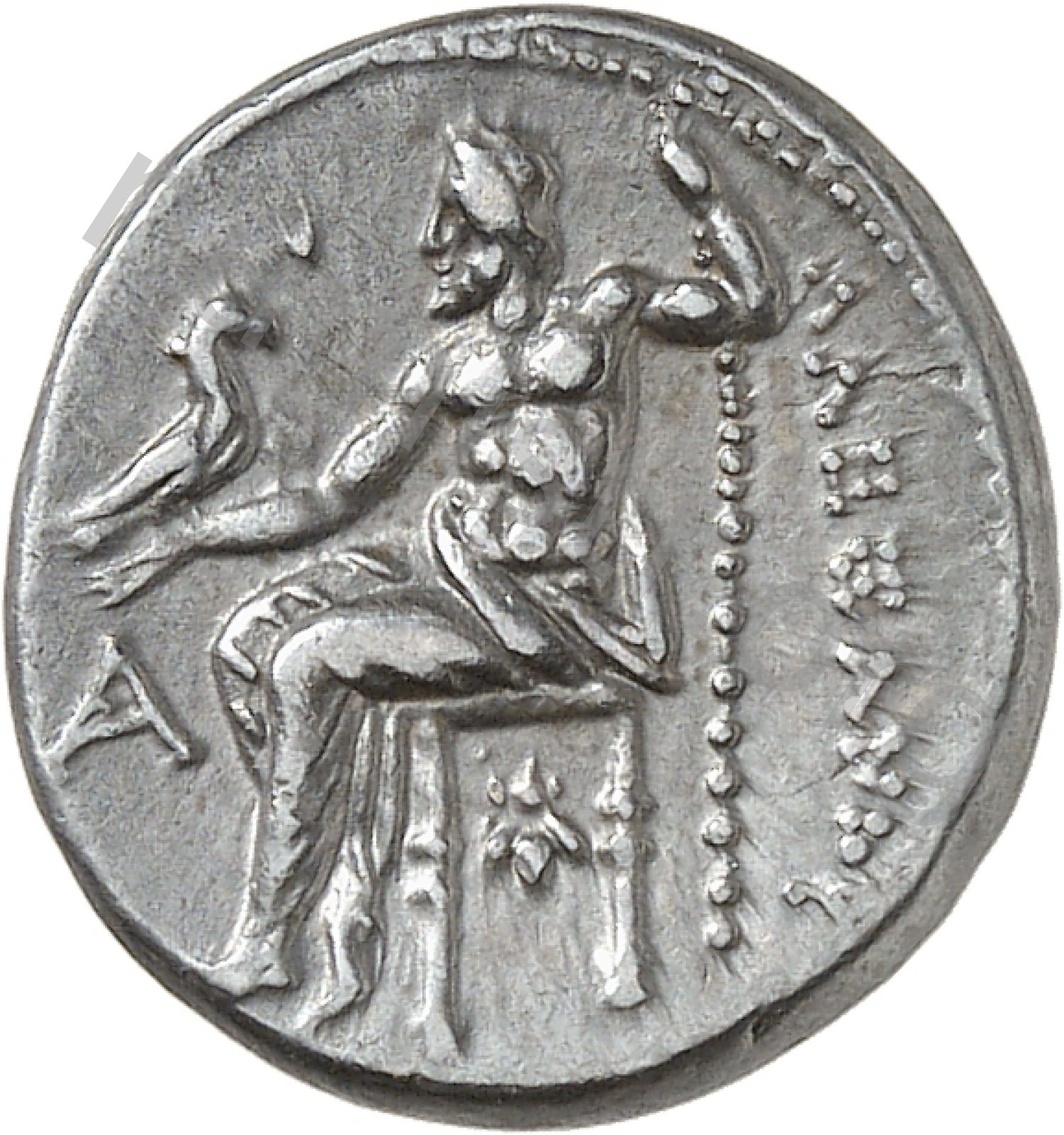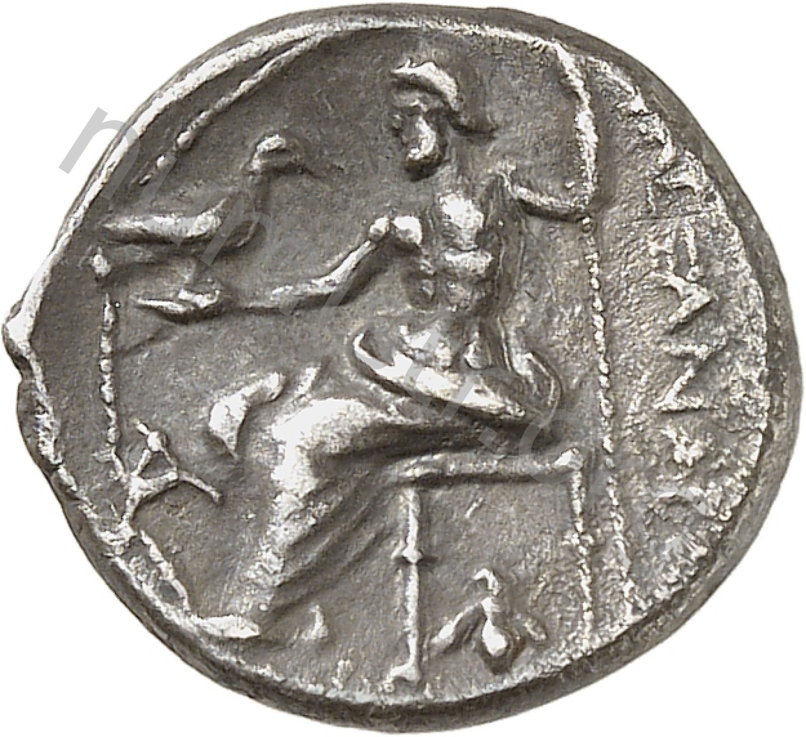 Zeus seated on stool-throne left eagle on outstretched right hand sceptre in left hand -[en]