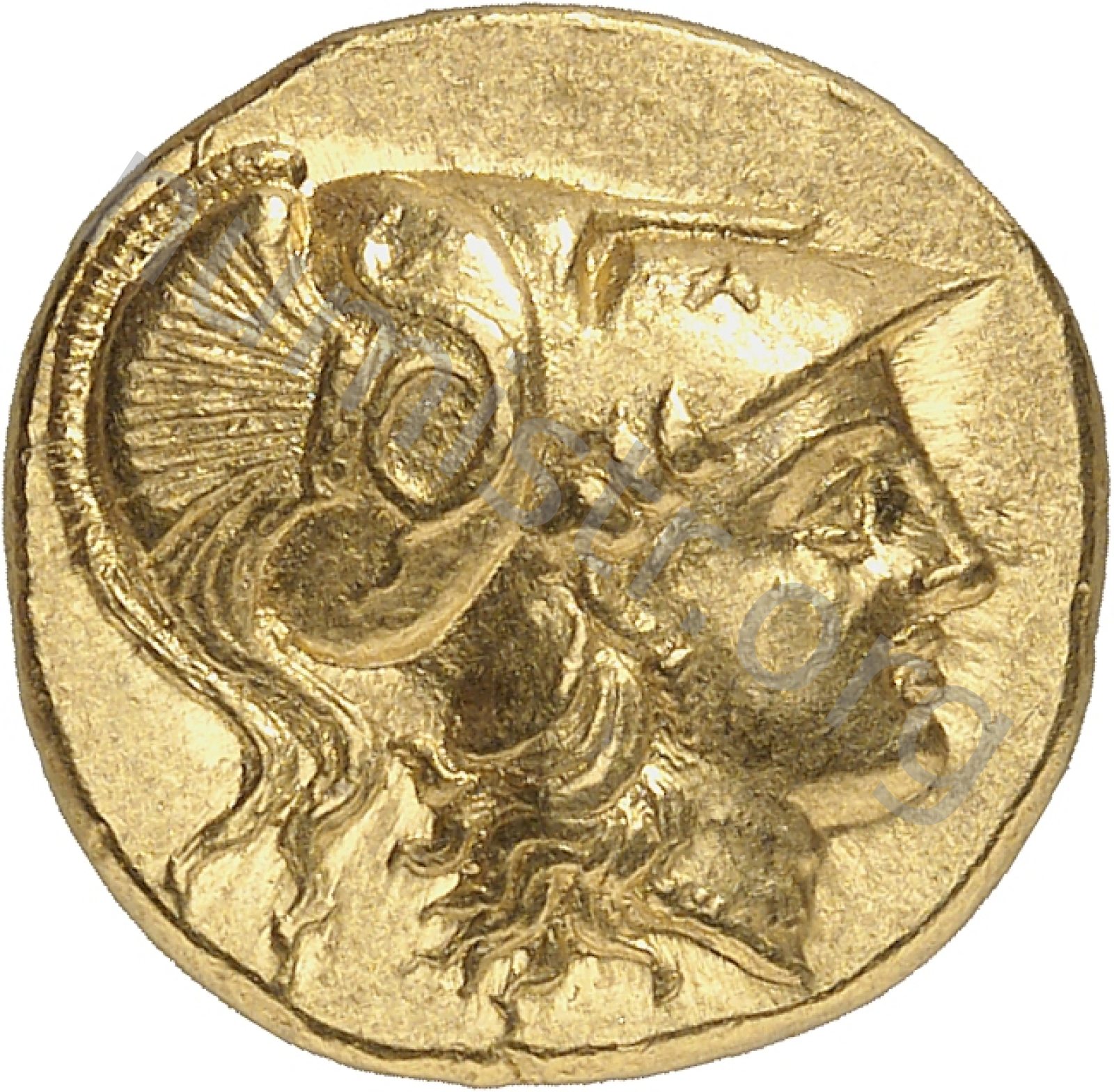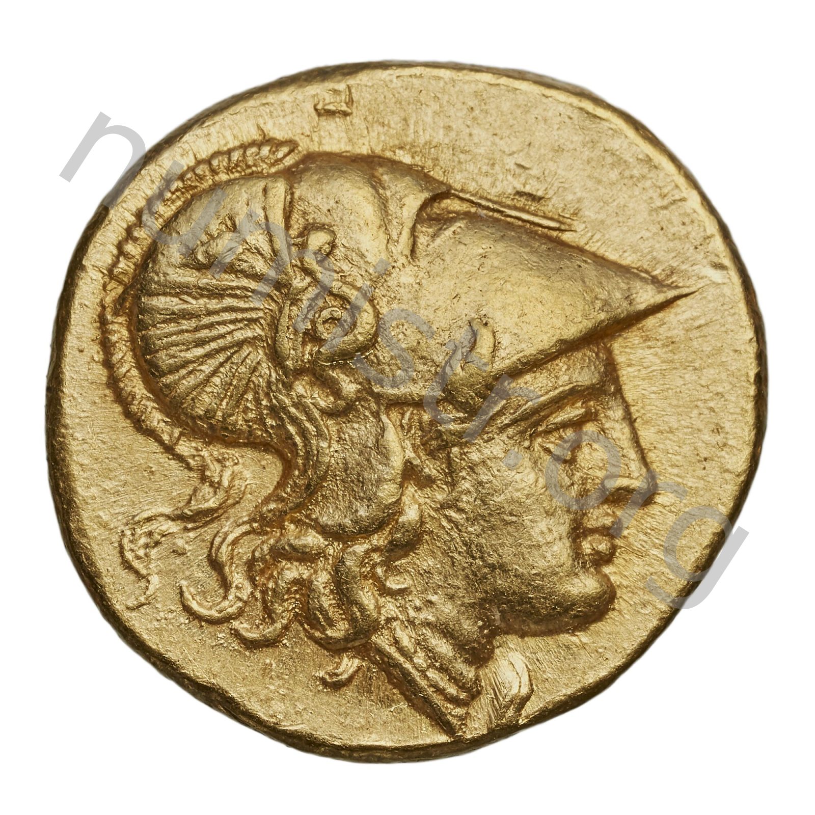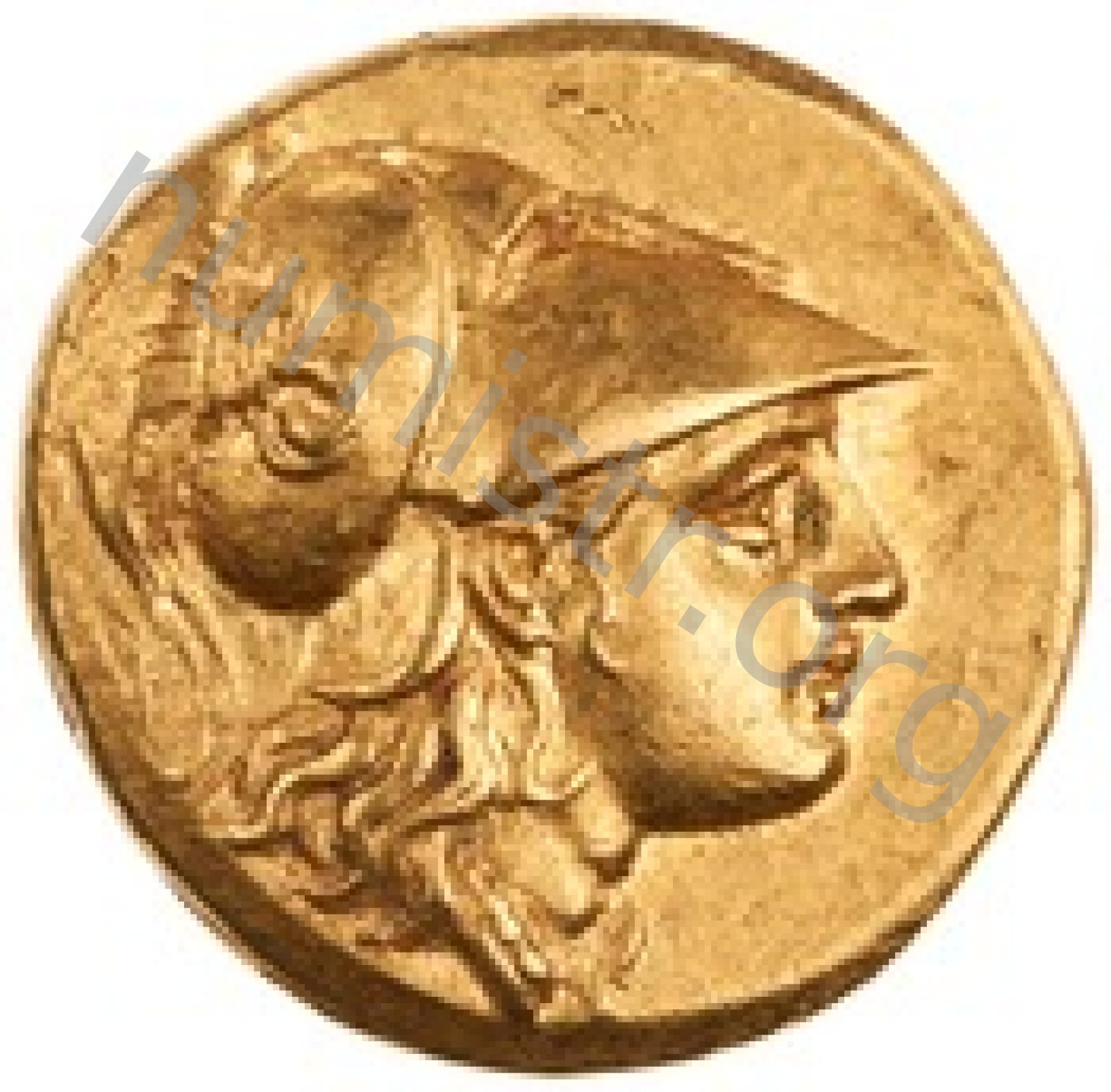 Head of Athena right wearing Corinthian helmet with crest -[en]