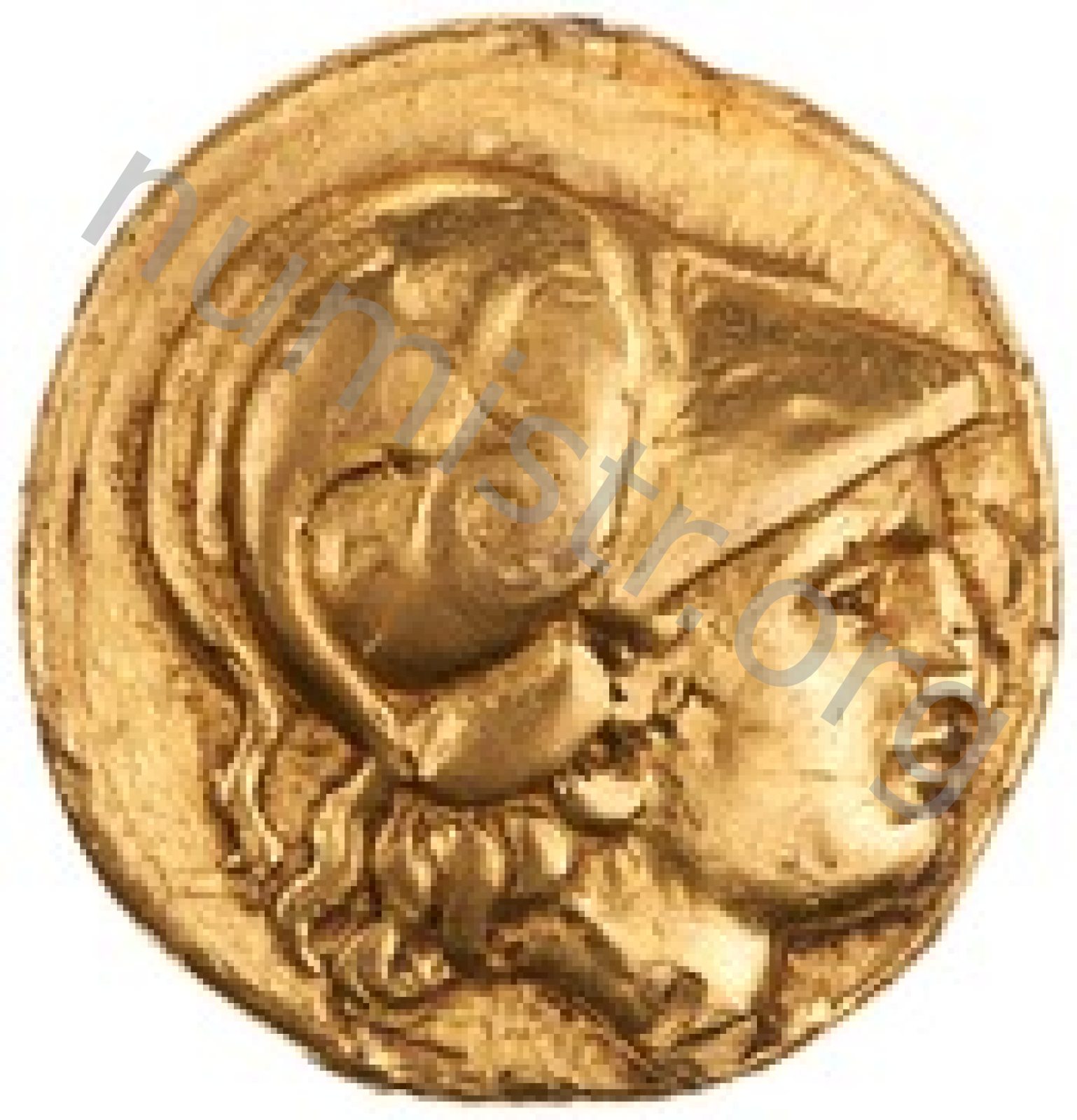 Head of Athena right wearing Corinthian helmet with crest -[en]