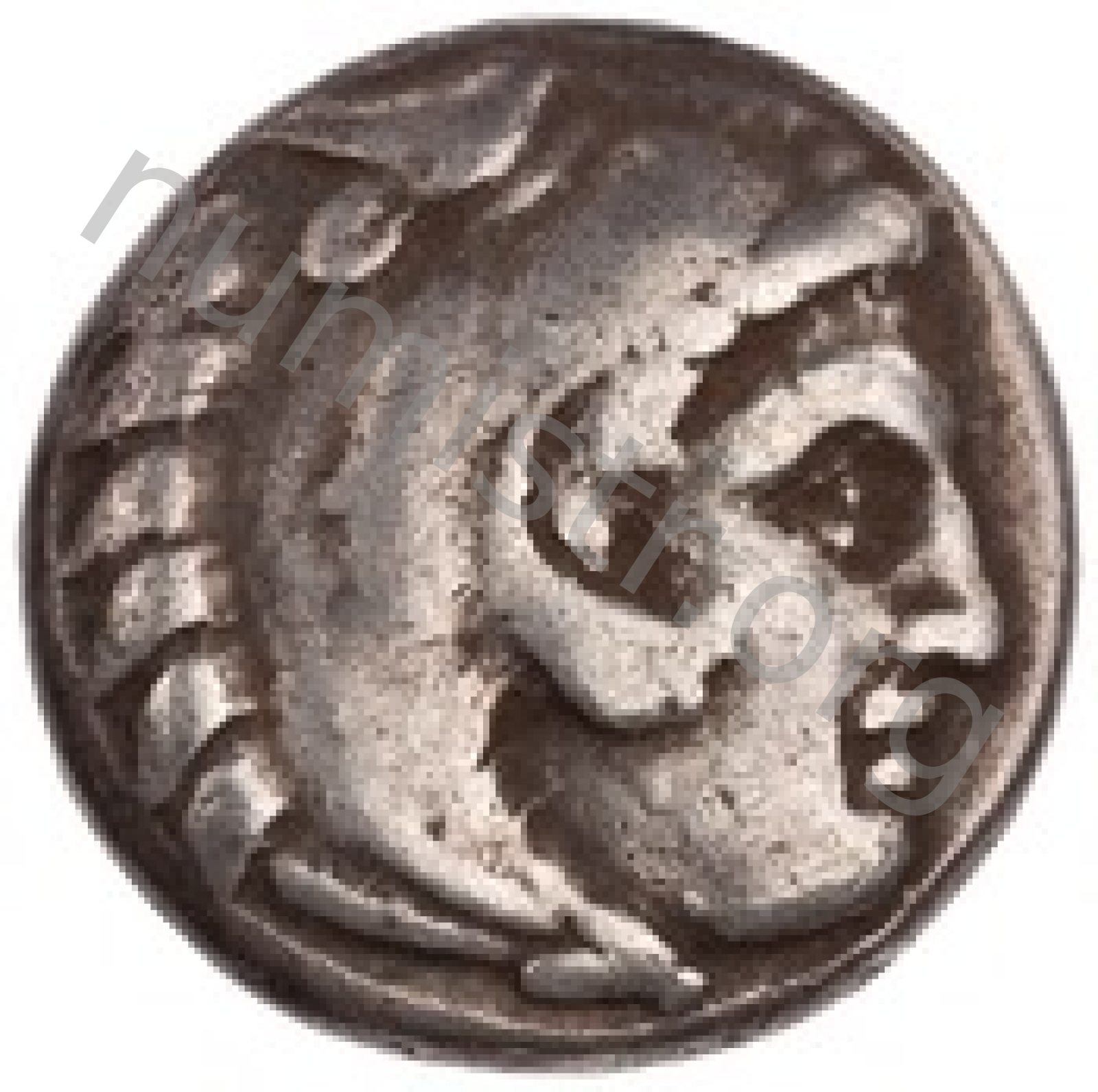 Head of beardless Heracles right wearing lion skin headdress -[en]