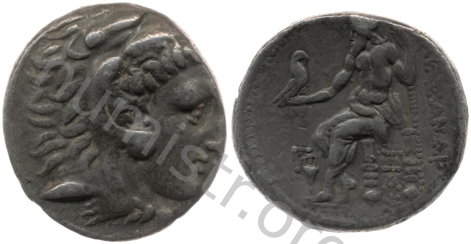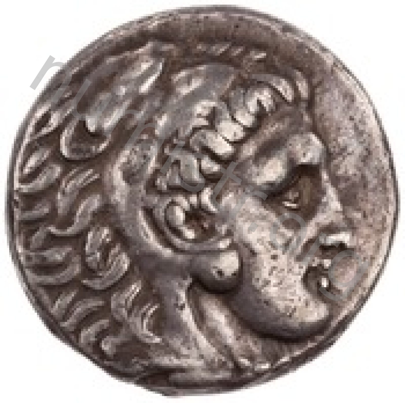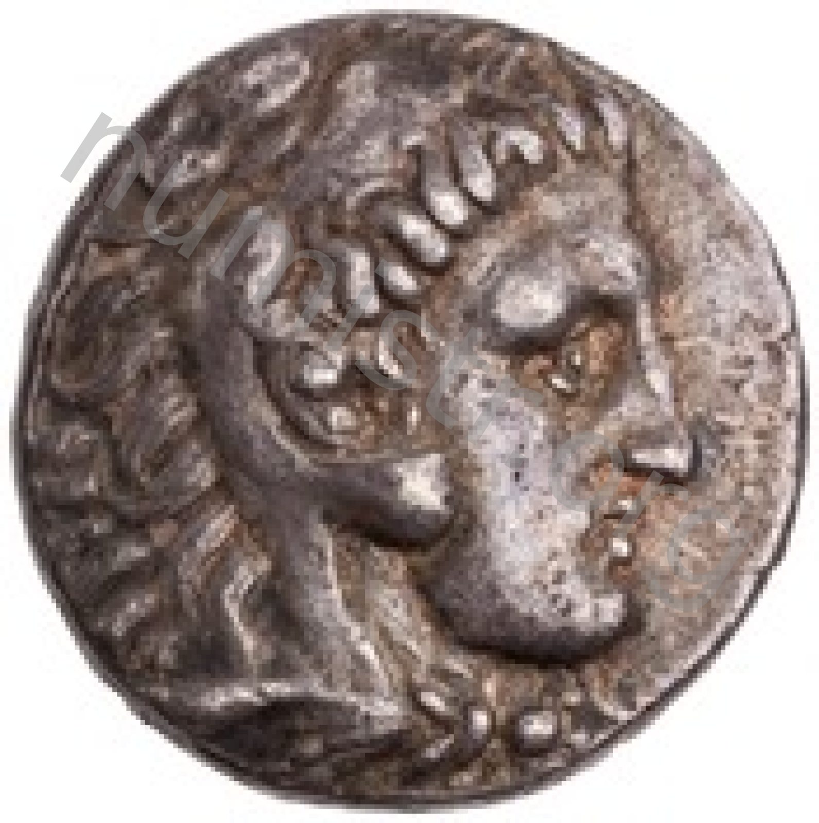 Head of beardless Heracles right wearing lion skin headdress -[en]