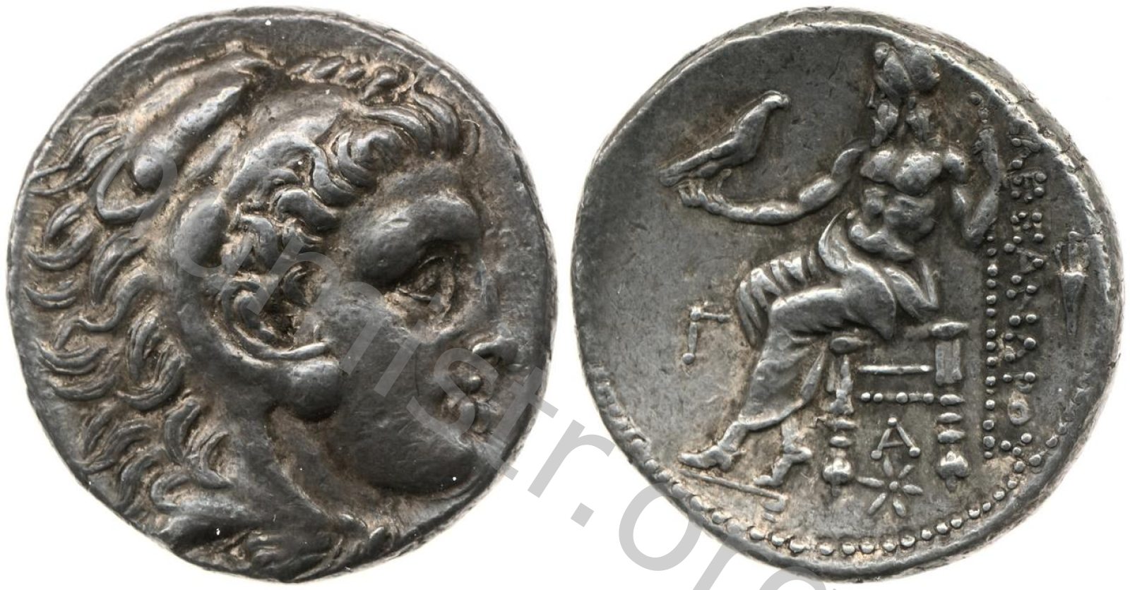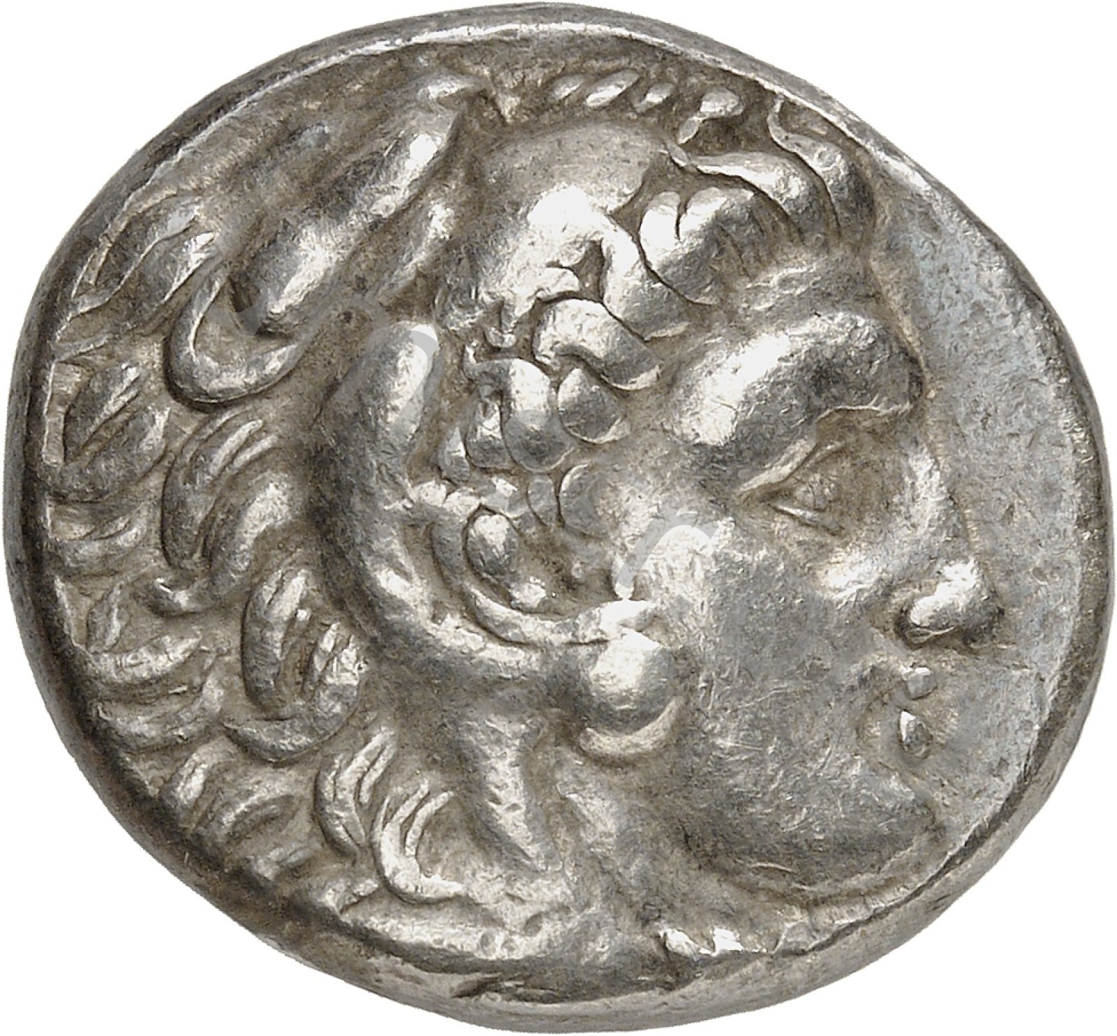 Head of beardless Heracles right wearing lion skin headdress -[en]