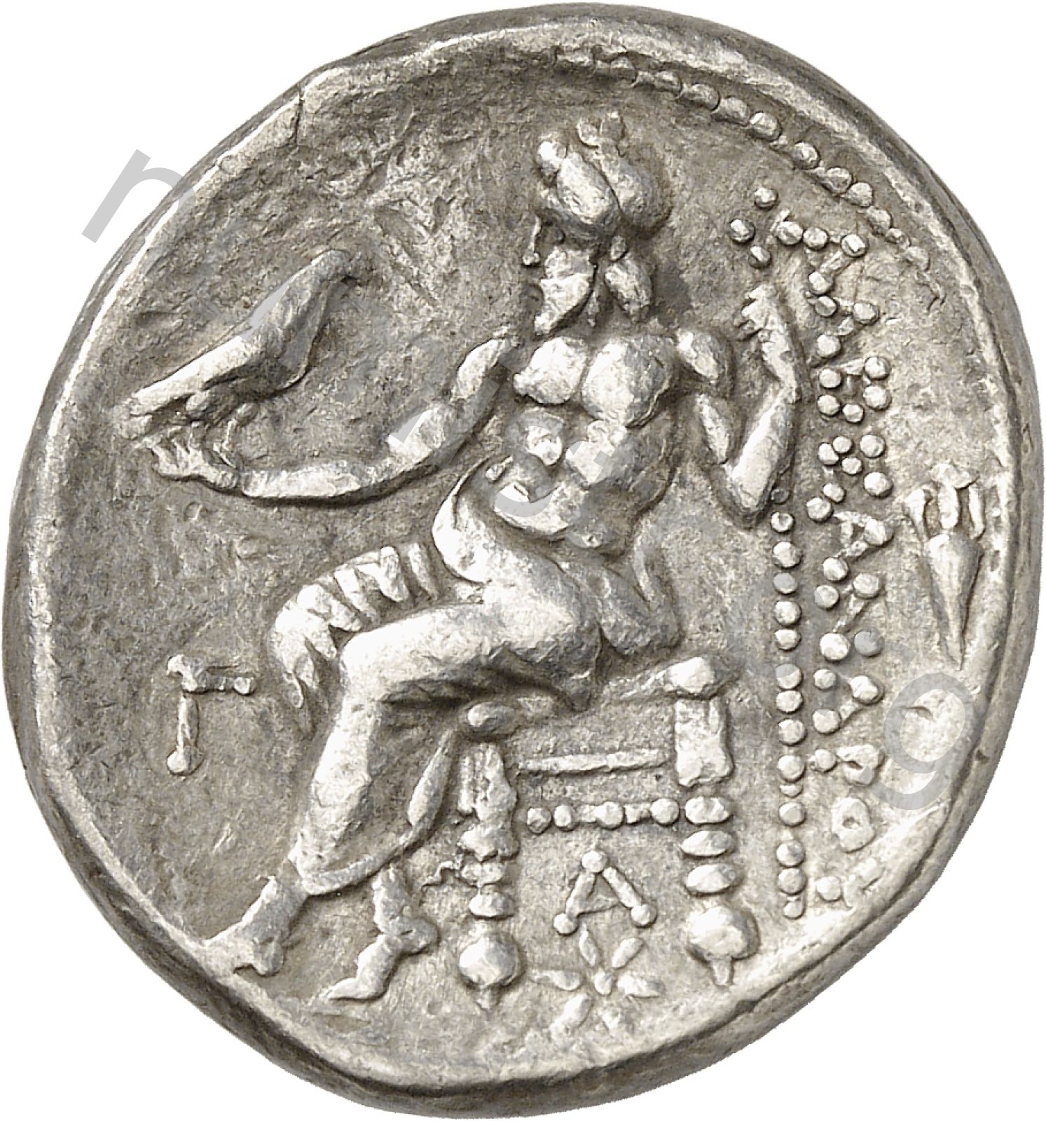 Zeus seated on stool-throne left eagle on outstretched right hand sceptre in left hand -[en]