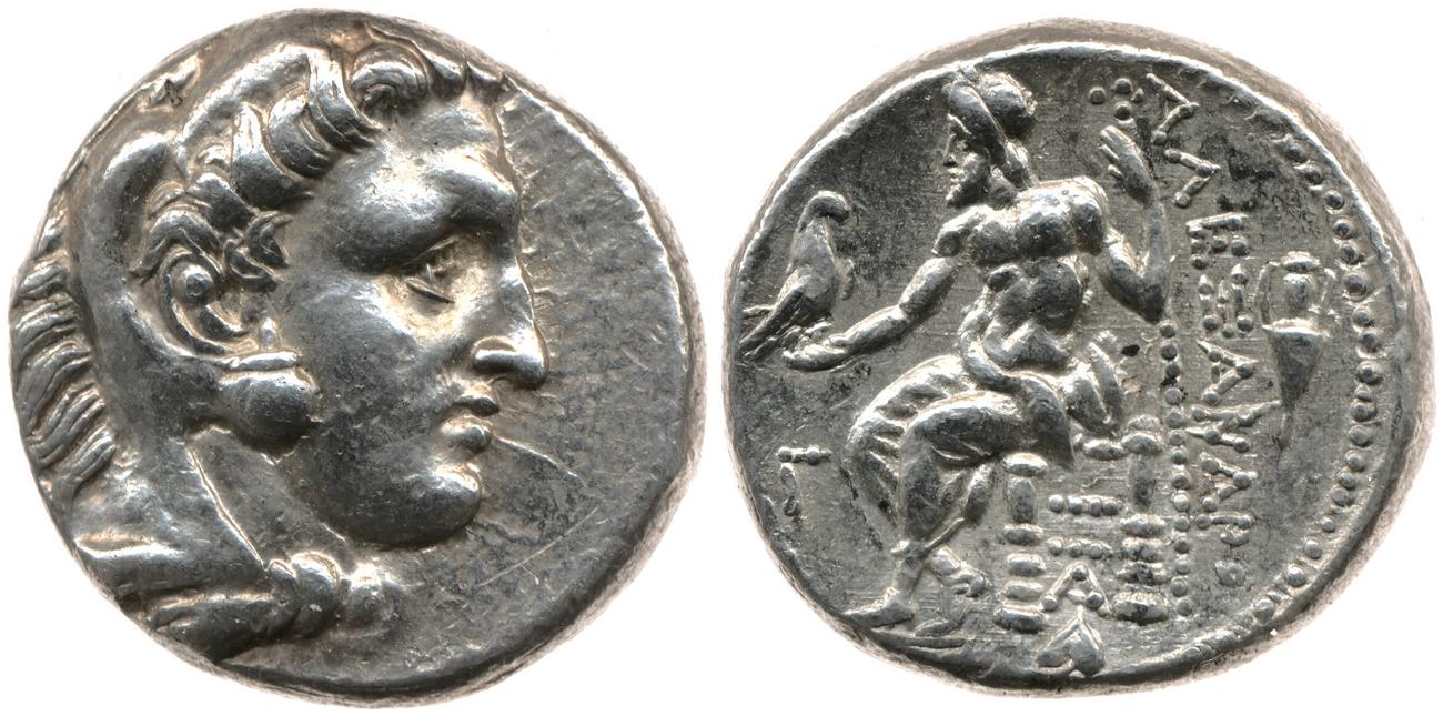 Head of beardless Heracles right wearing lion skin headdress -[en]