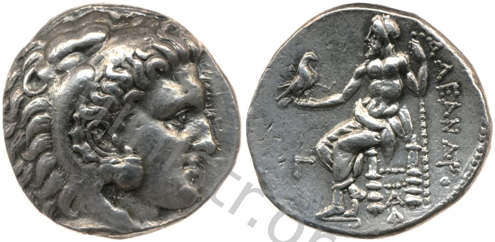 Head of beardless Heracles right wearing lion skin headdress -[en]