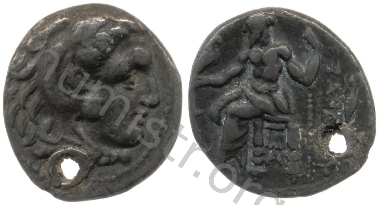 Head of beardless Heracles right wearing lion skin headdress -[en]