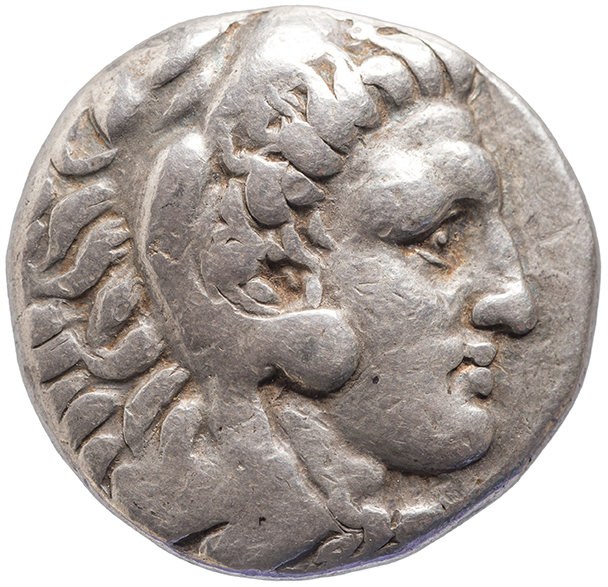 Head of beardless Heracles right wearing lion skin headdress -[en]