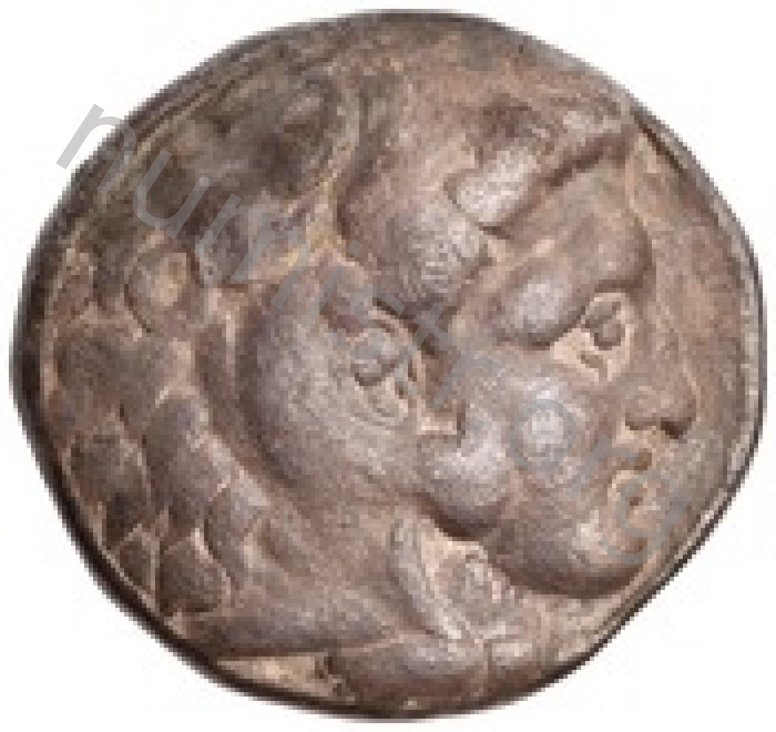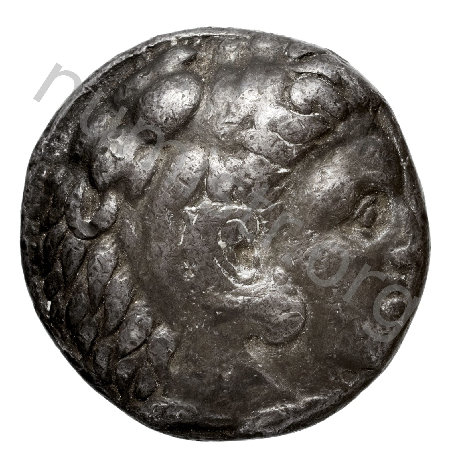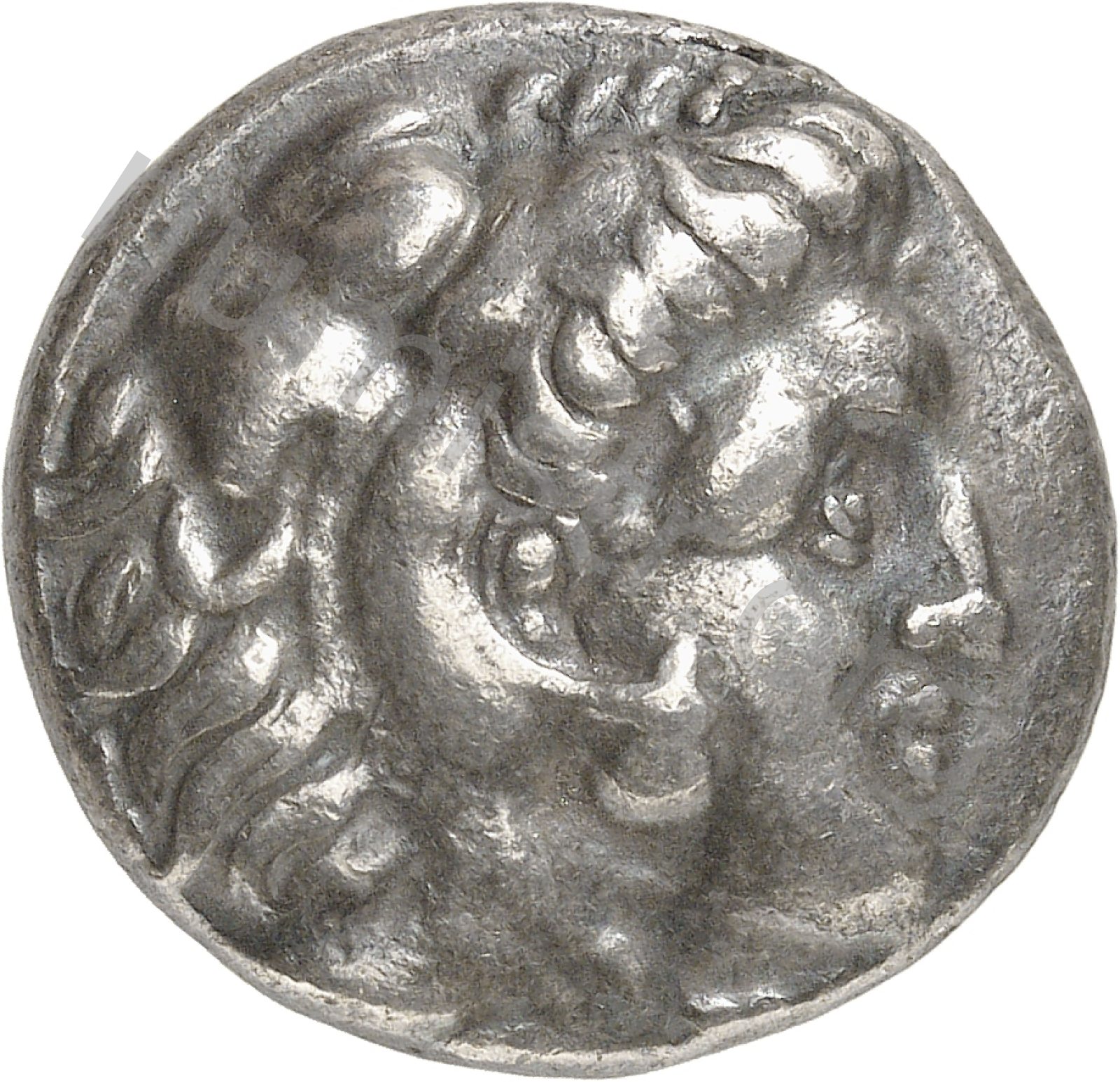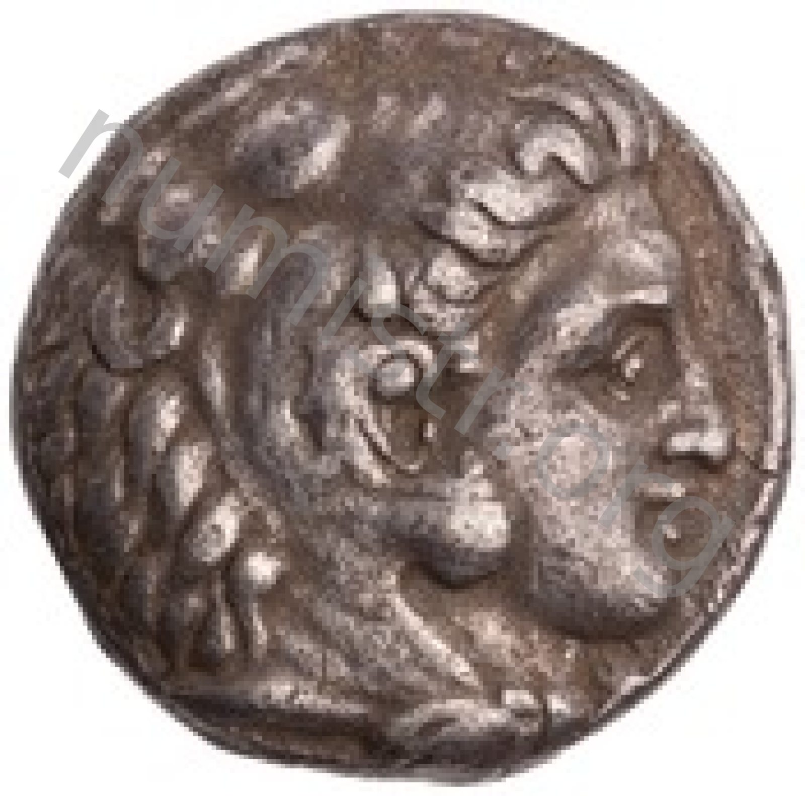 Head of beardless Heracles right wearing lion skin headdress -[en]