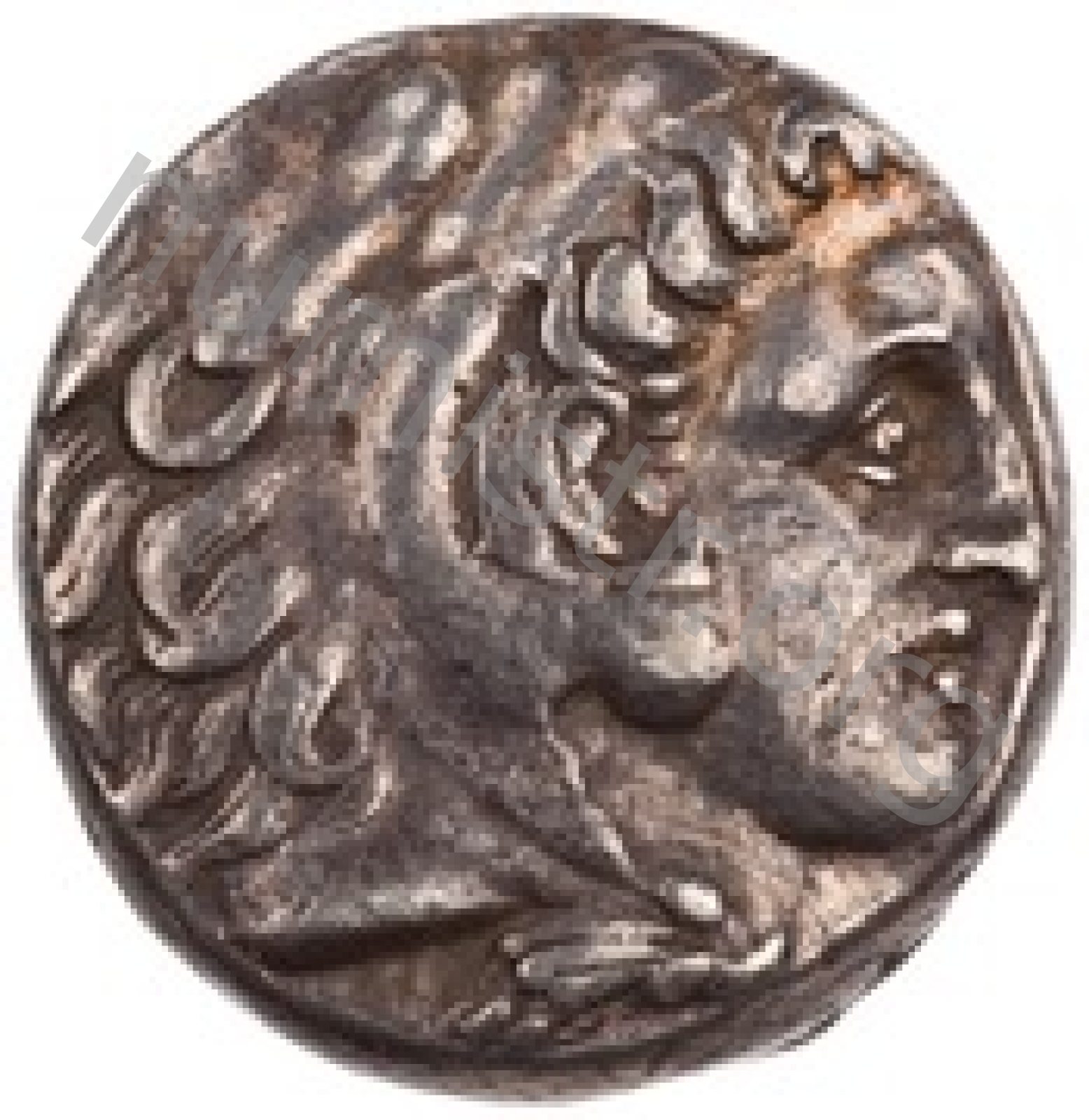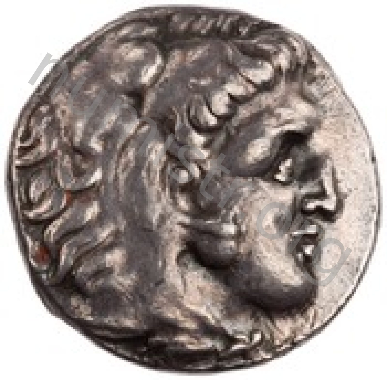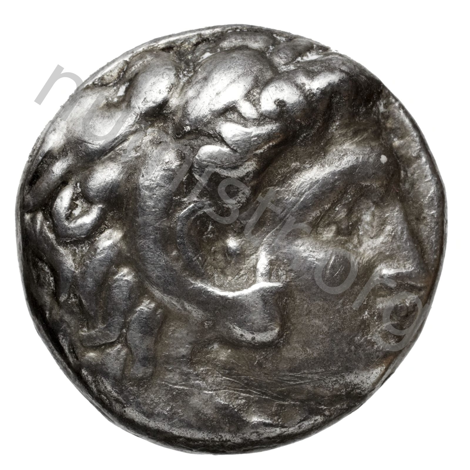 Head of beardless Heracles right wearing lion skin headdress -[en]