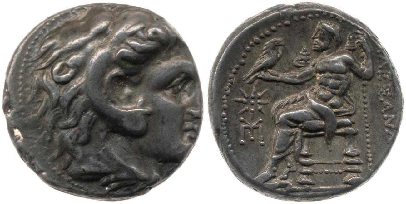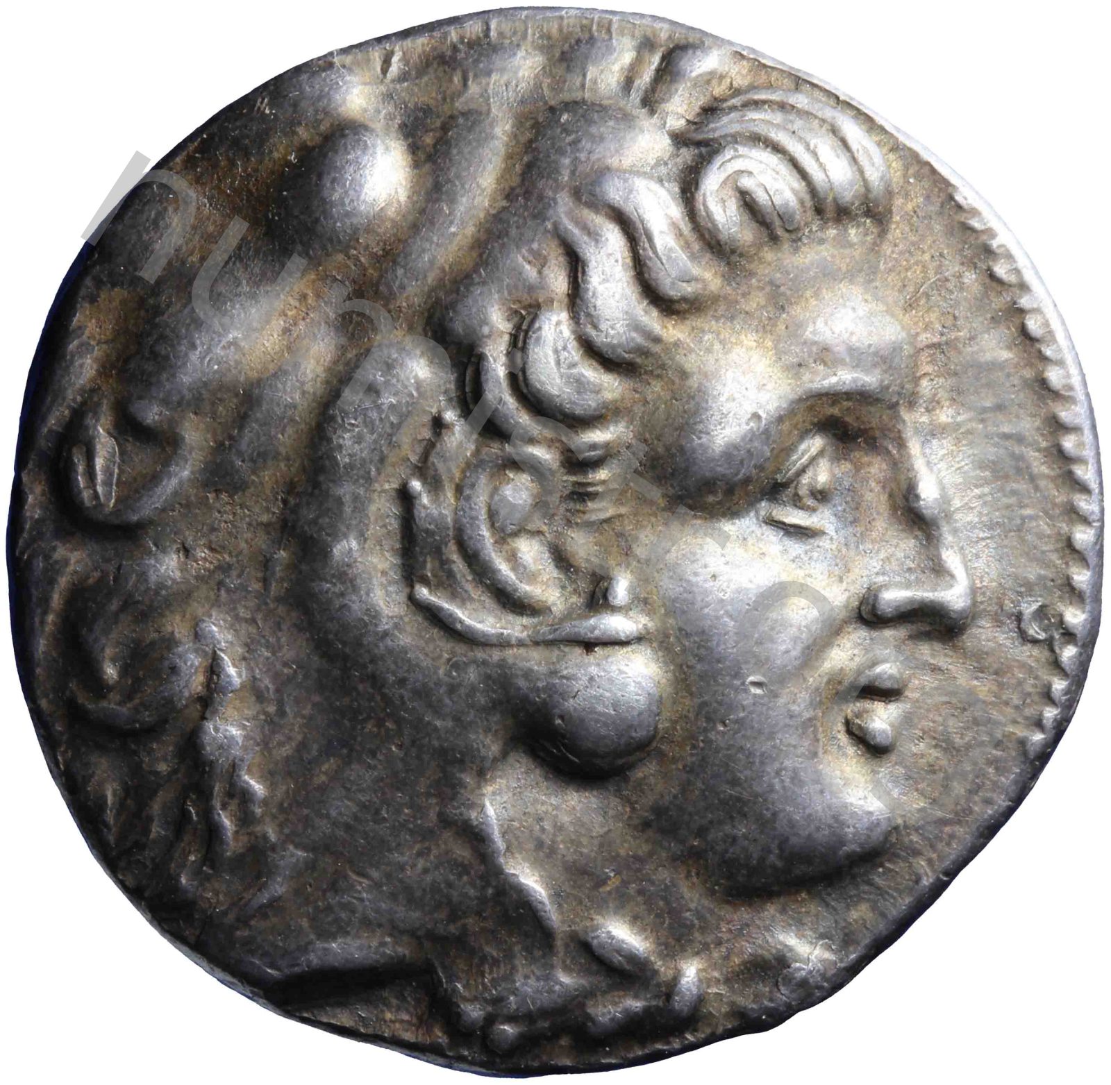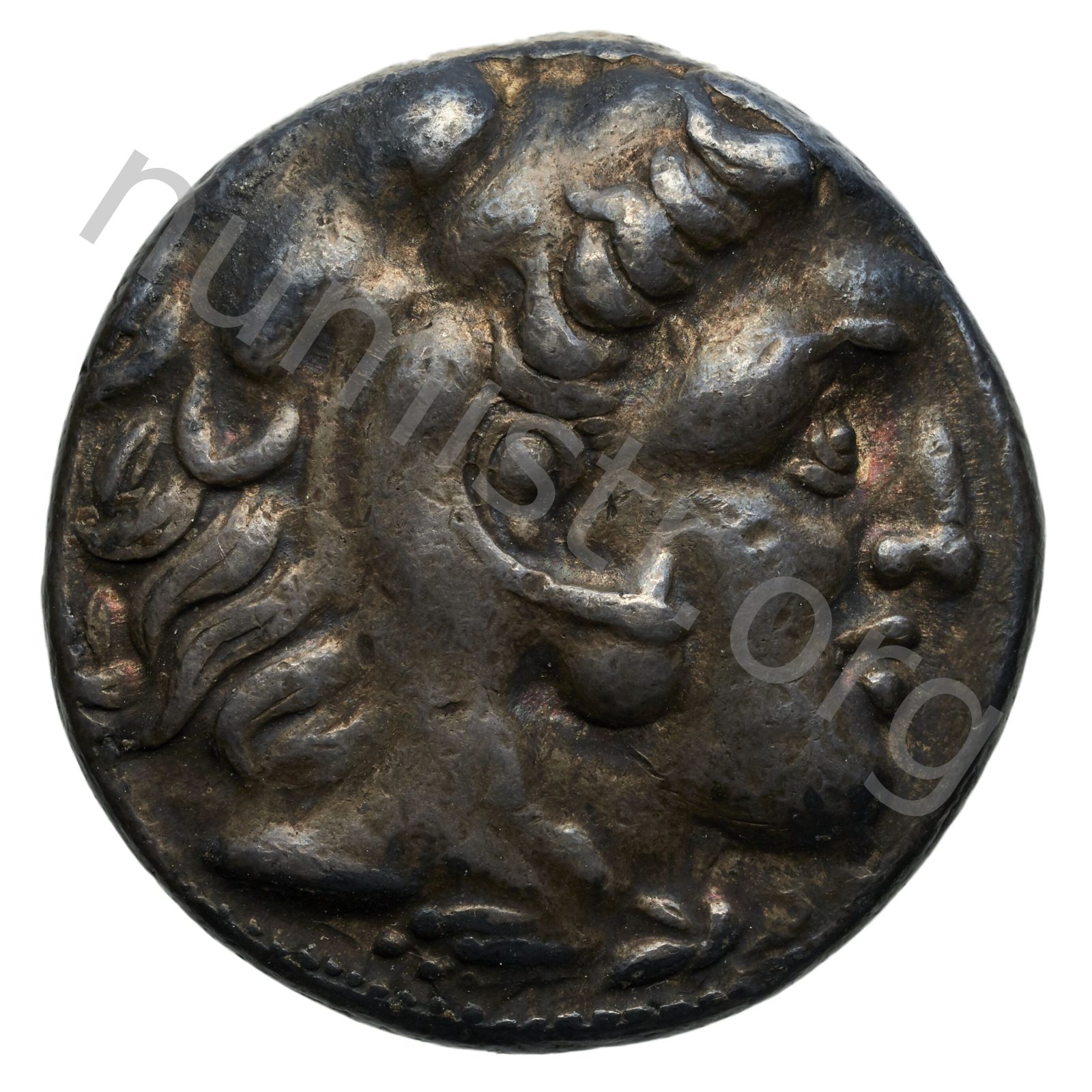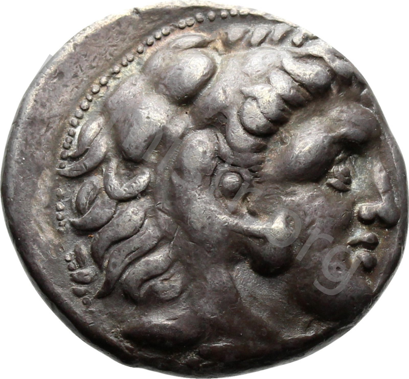 Head of beardless Heracles right wearing lion skin headdress -[en]
