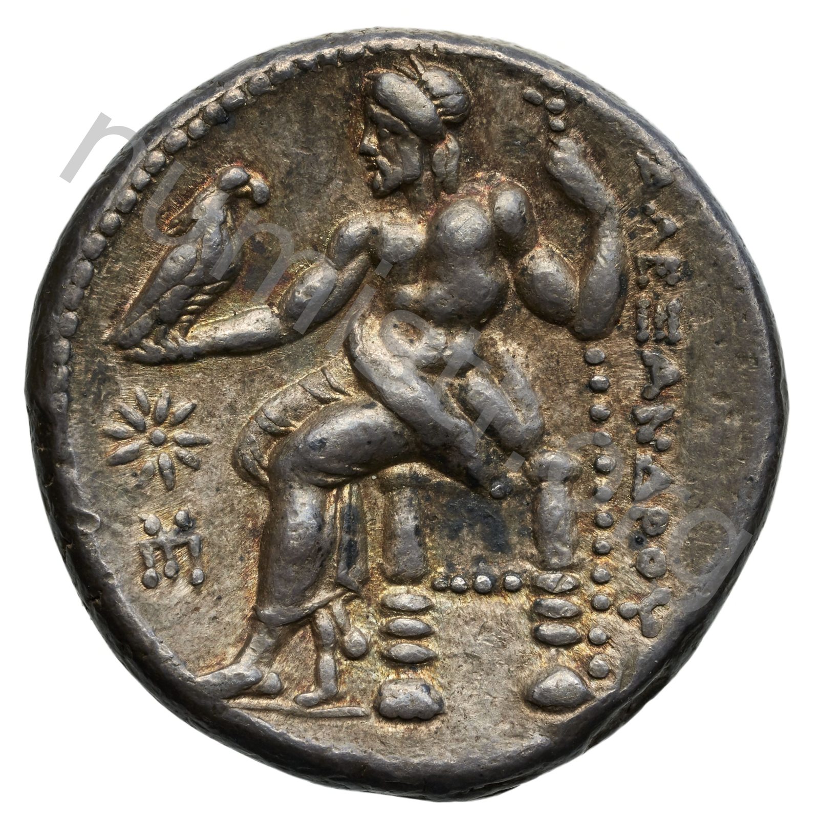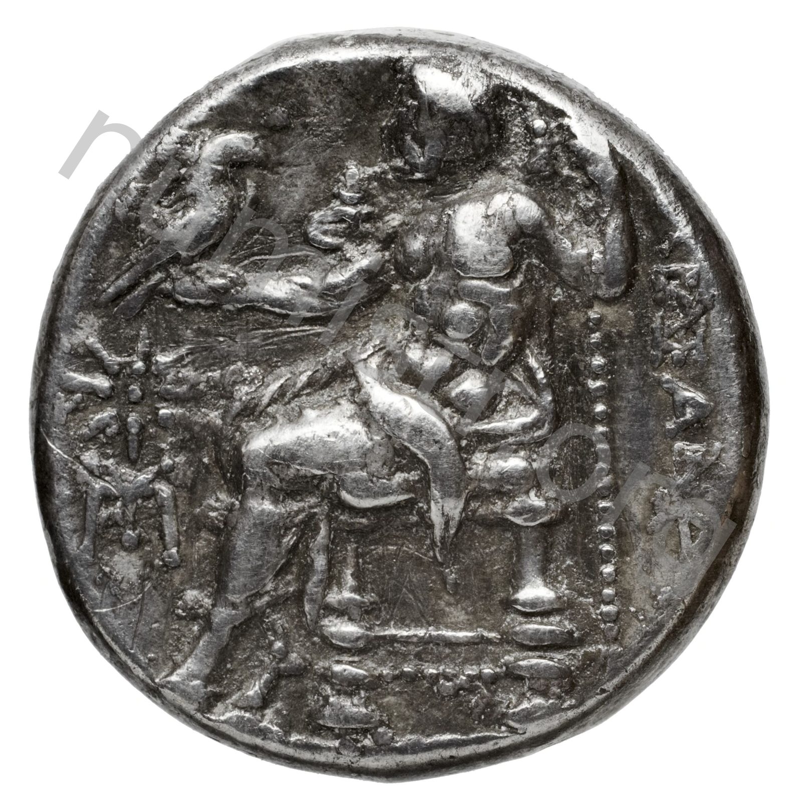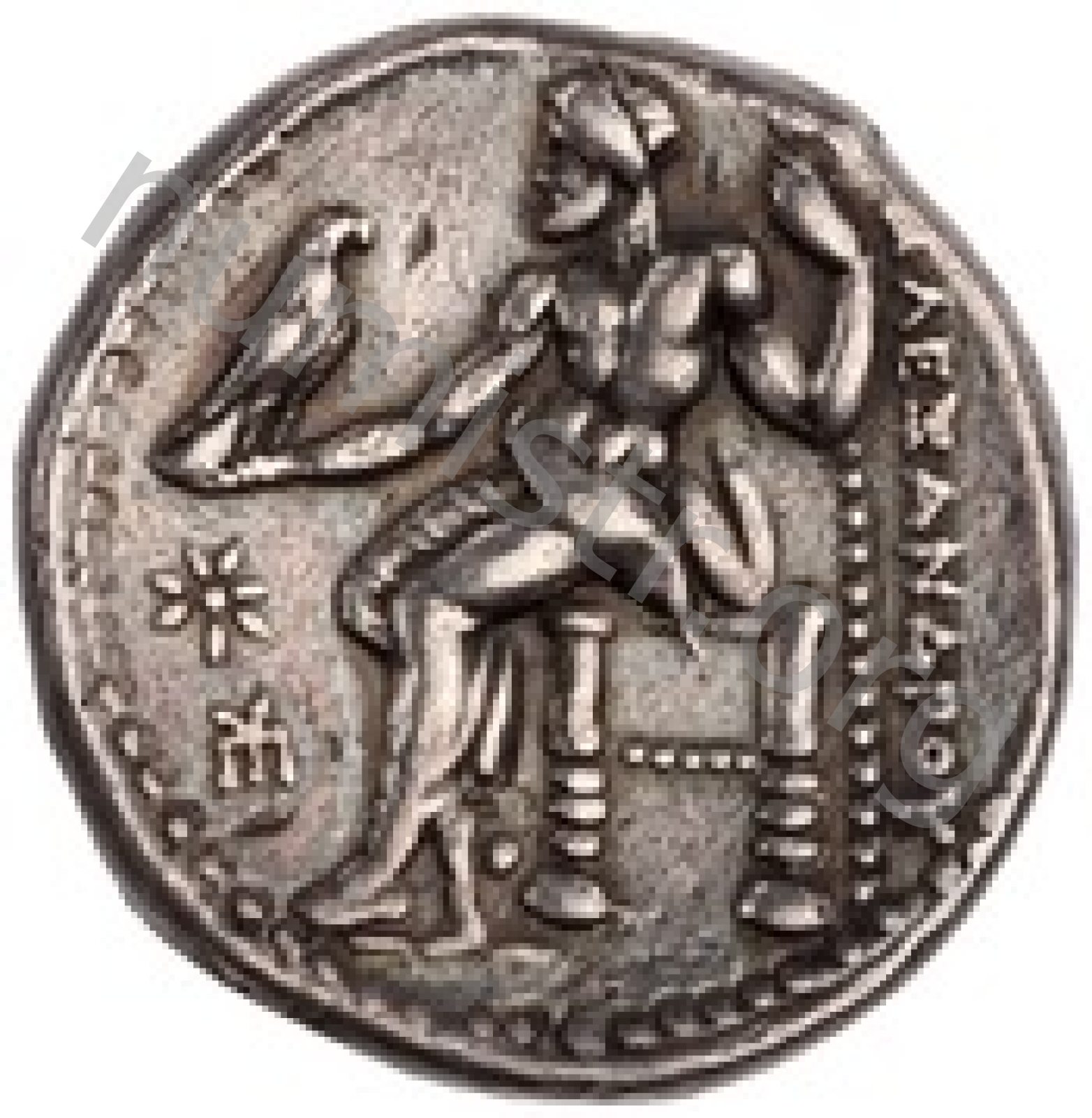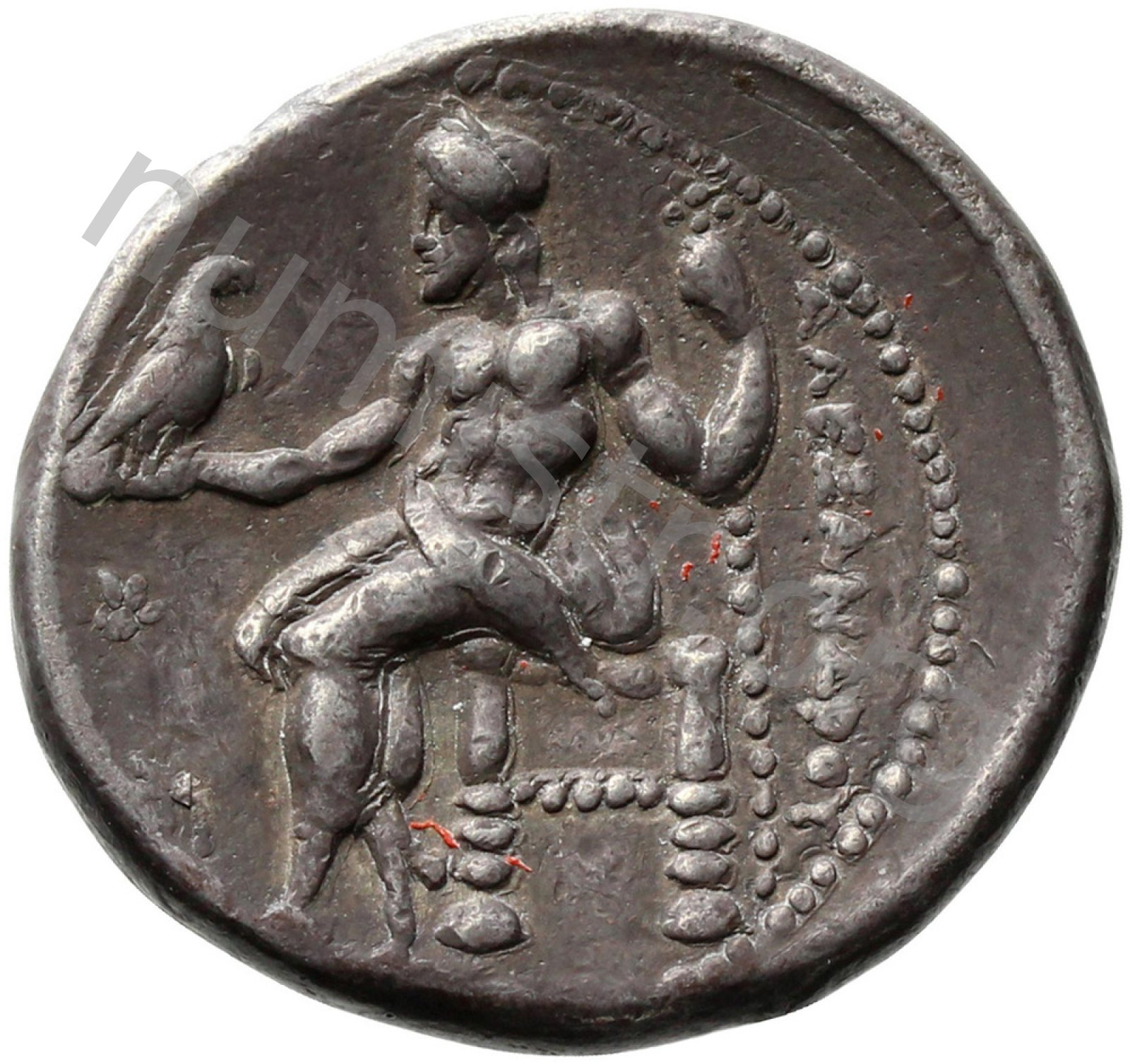 Zeus tabure-tahtta oturuyor sol elinde kartal sağ elinde asa var.