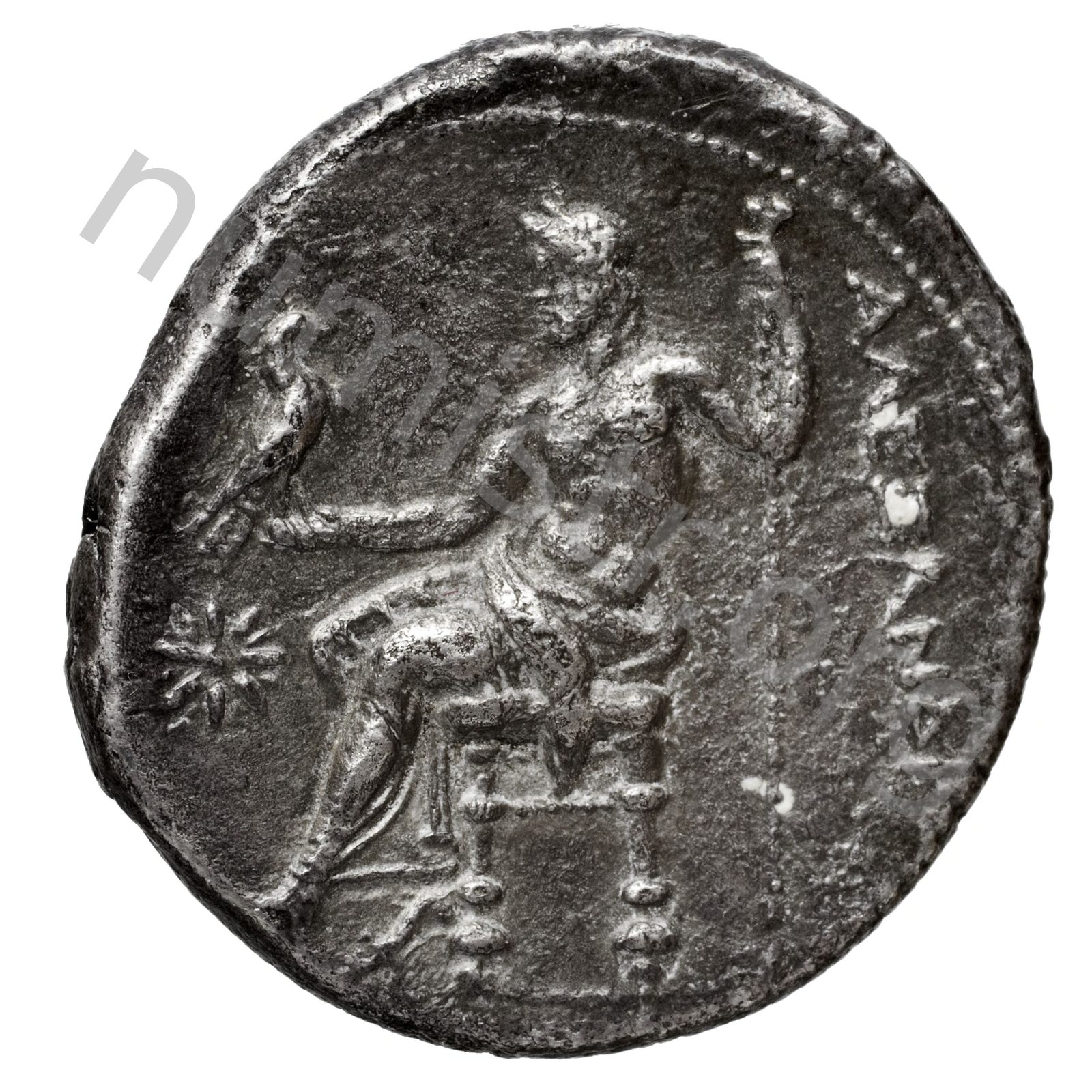 Zeus tabure-tahtta oturuyor sol elinde kartal sağ elinde asa var.