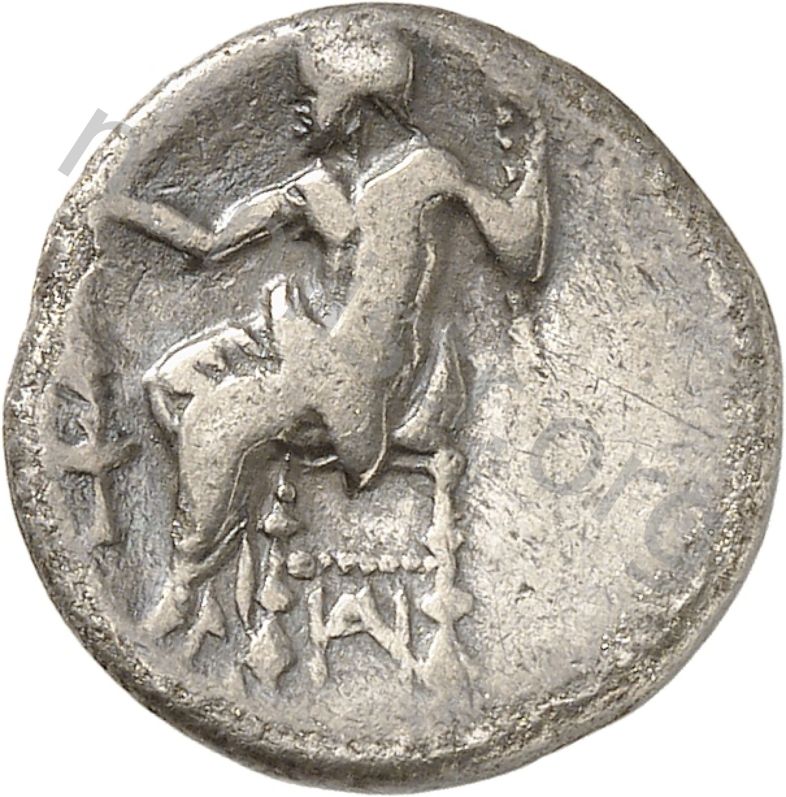 Zeus seated on stool-throne left eagle on outstretched right hand sceptre in left hand -[en]