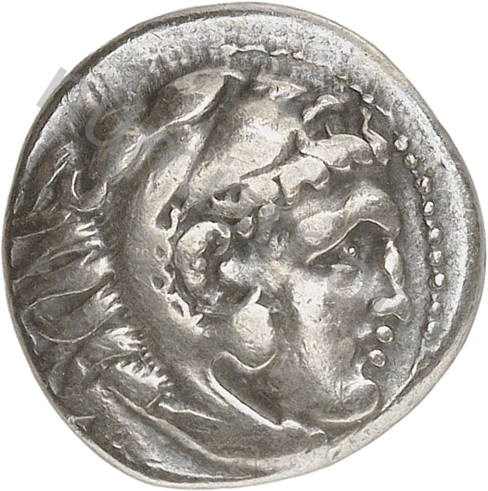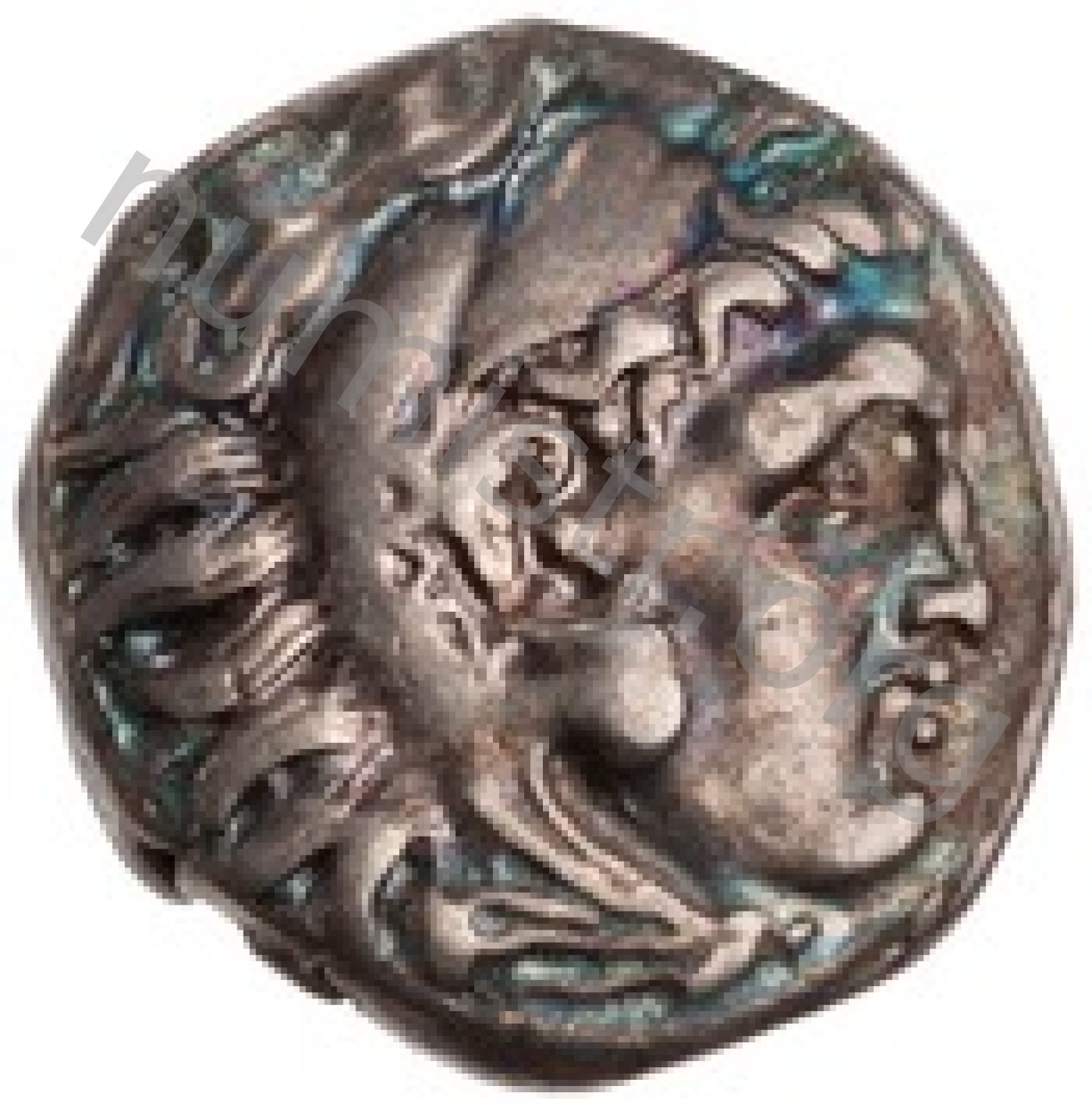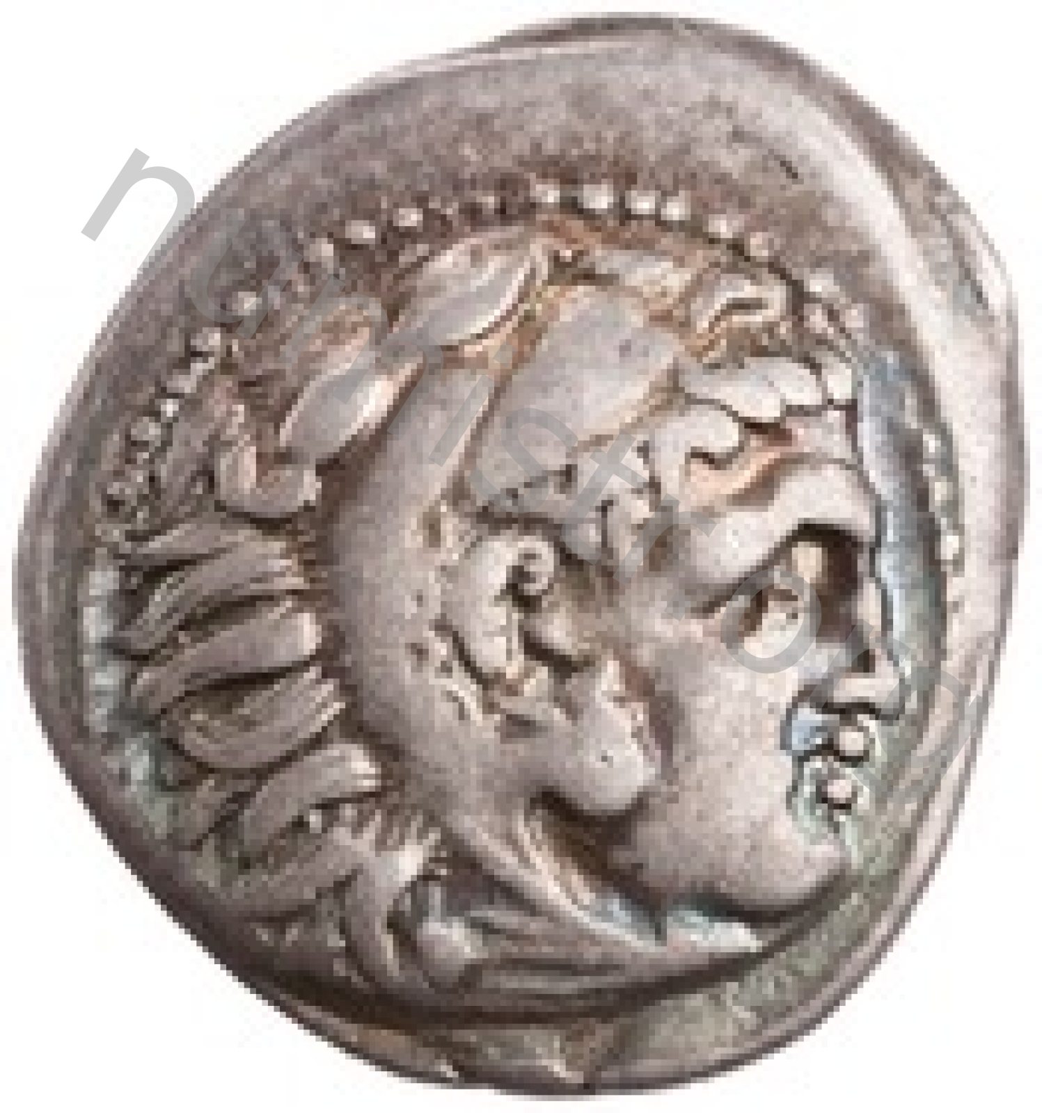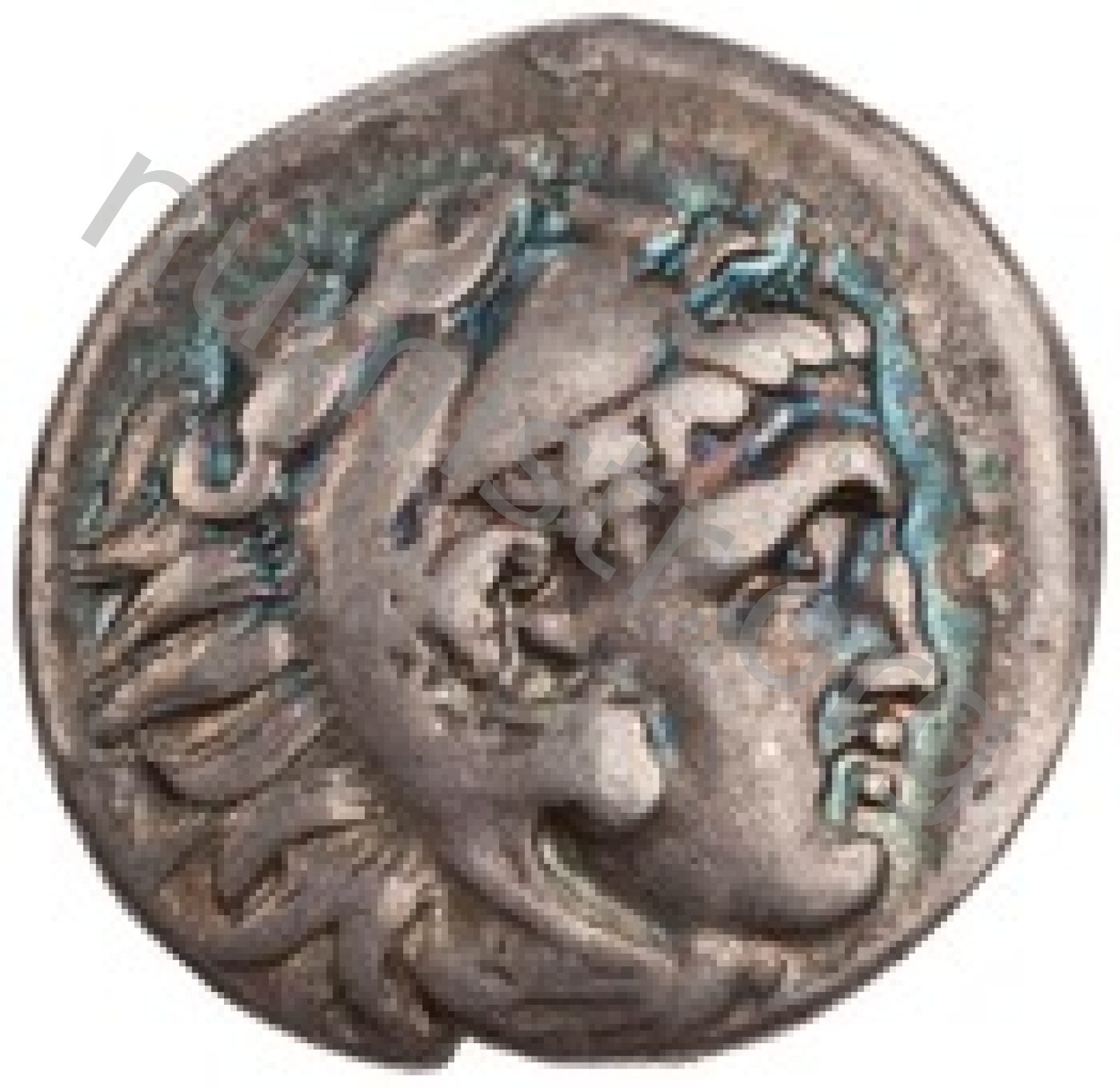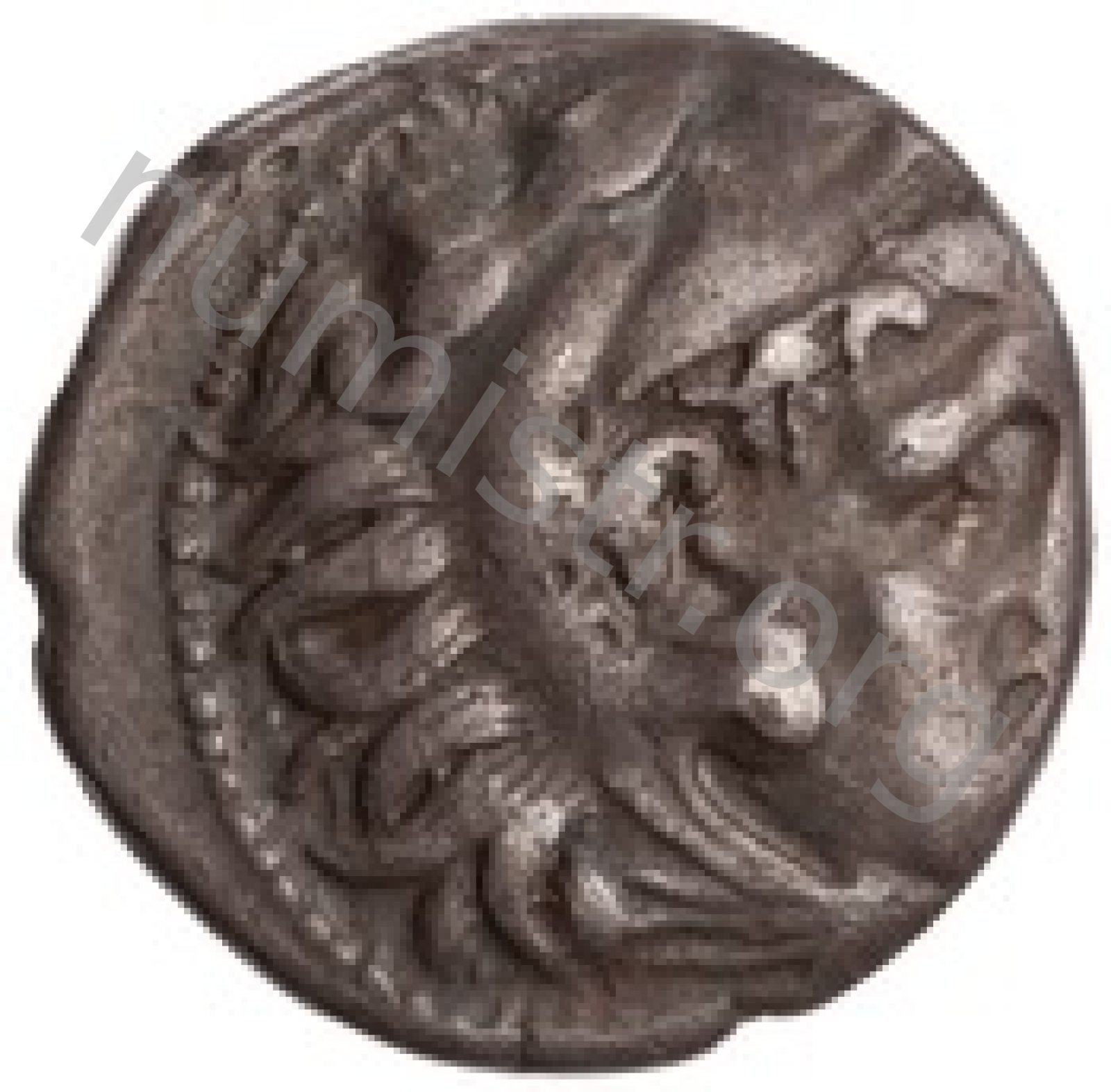 Head of beardless Heracles right wearing lion skin headdress -[en]
